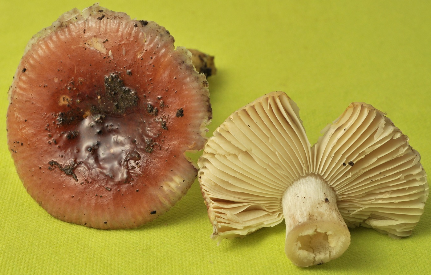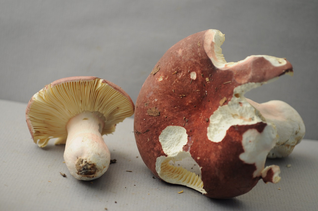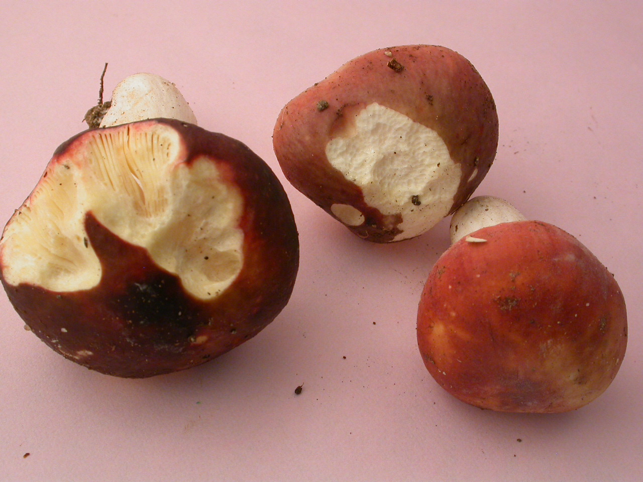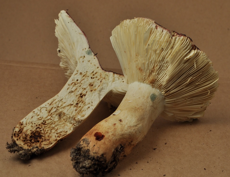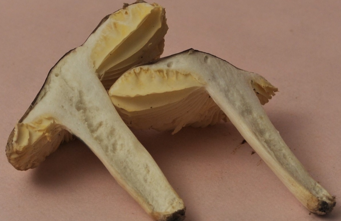 A voir dans la coupe les lames adnées ou émarginées, ligne de Trindel 2, arête rougeâtre à la marge, chair se colorant de brunâtre. Standard R.suberythropus..
