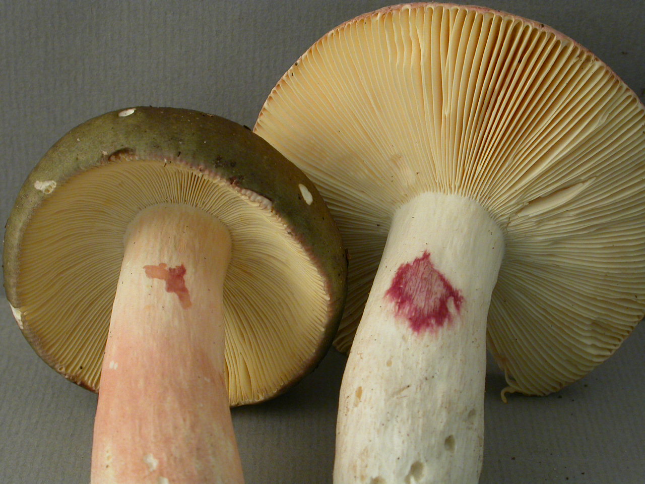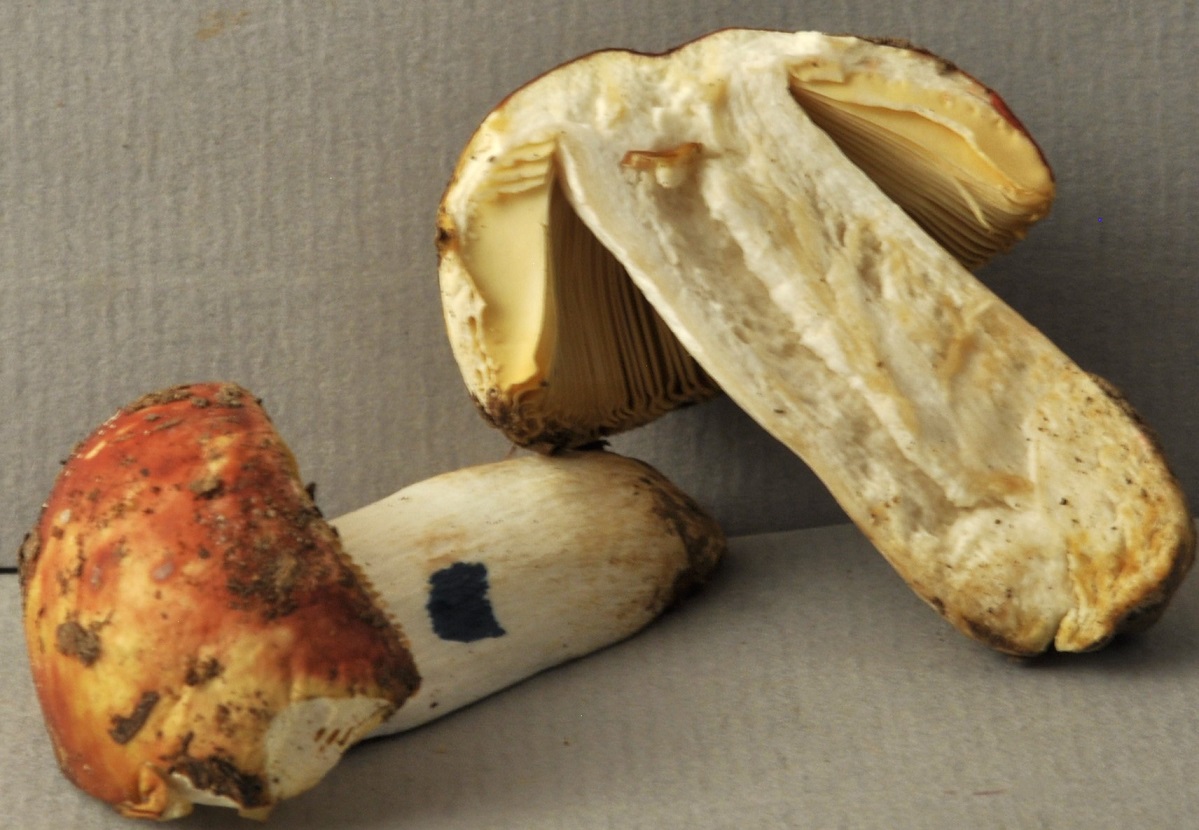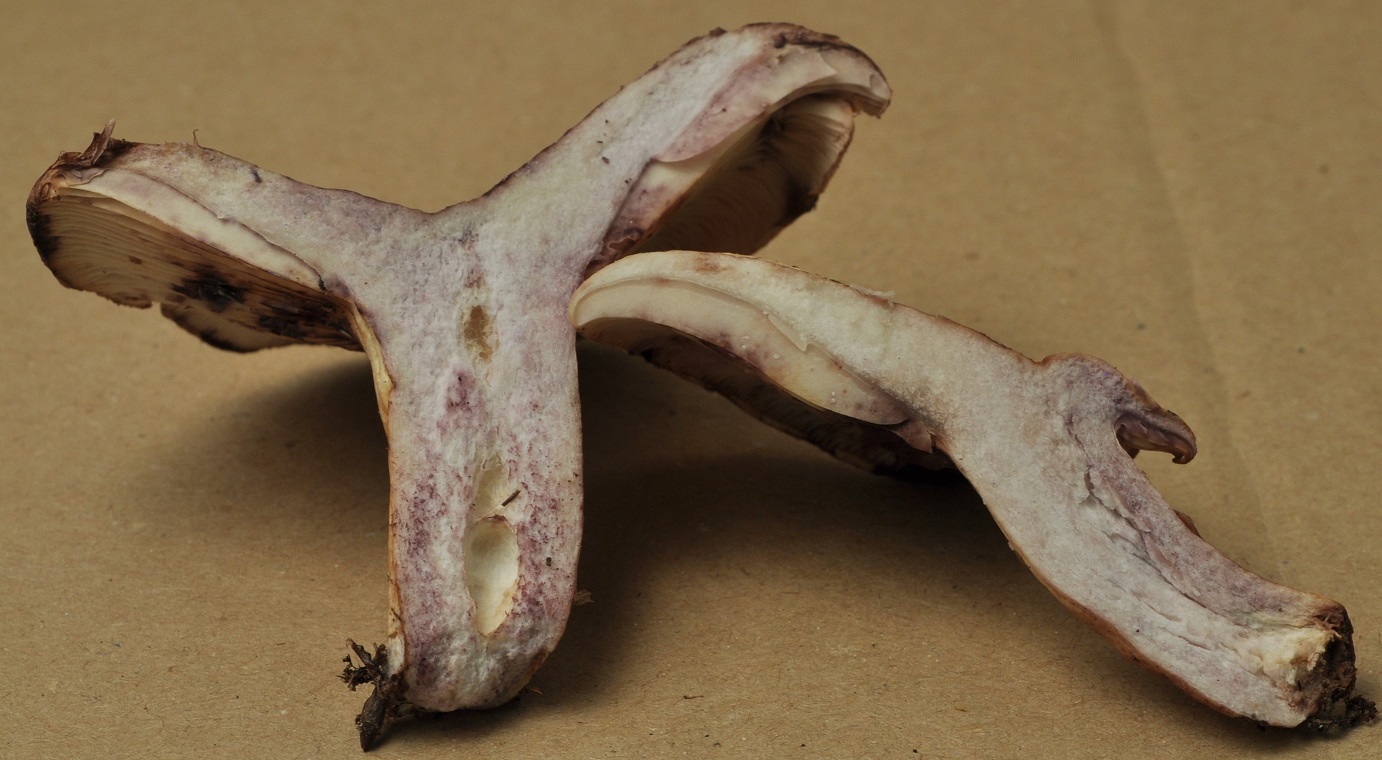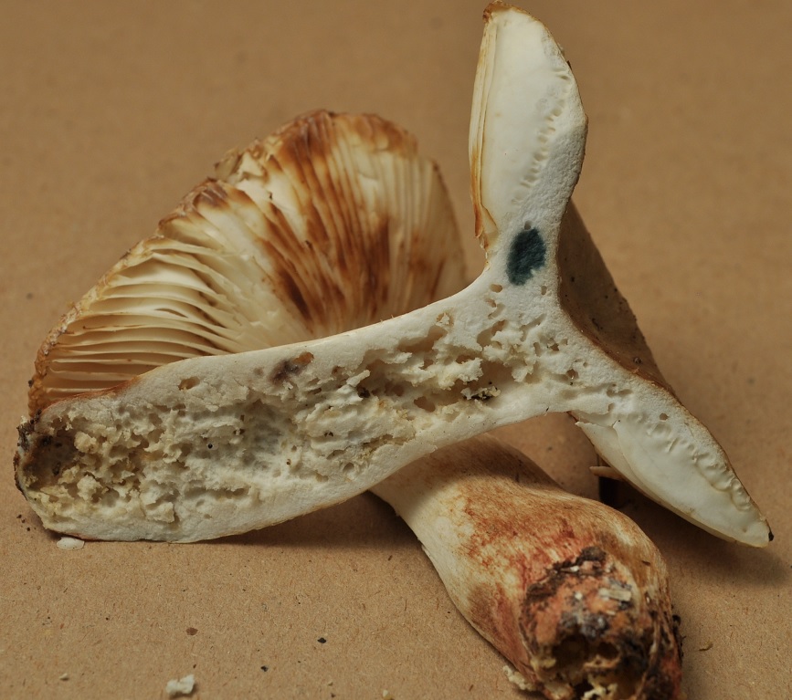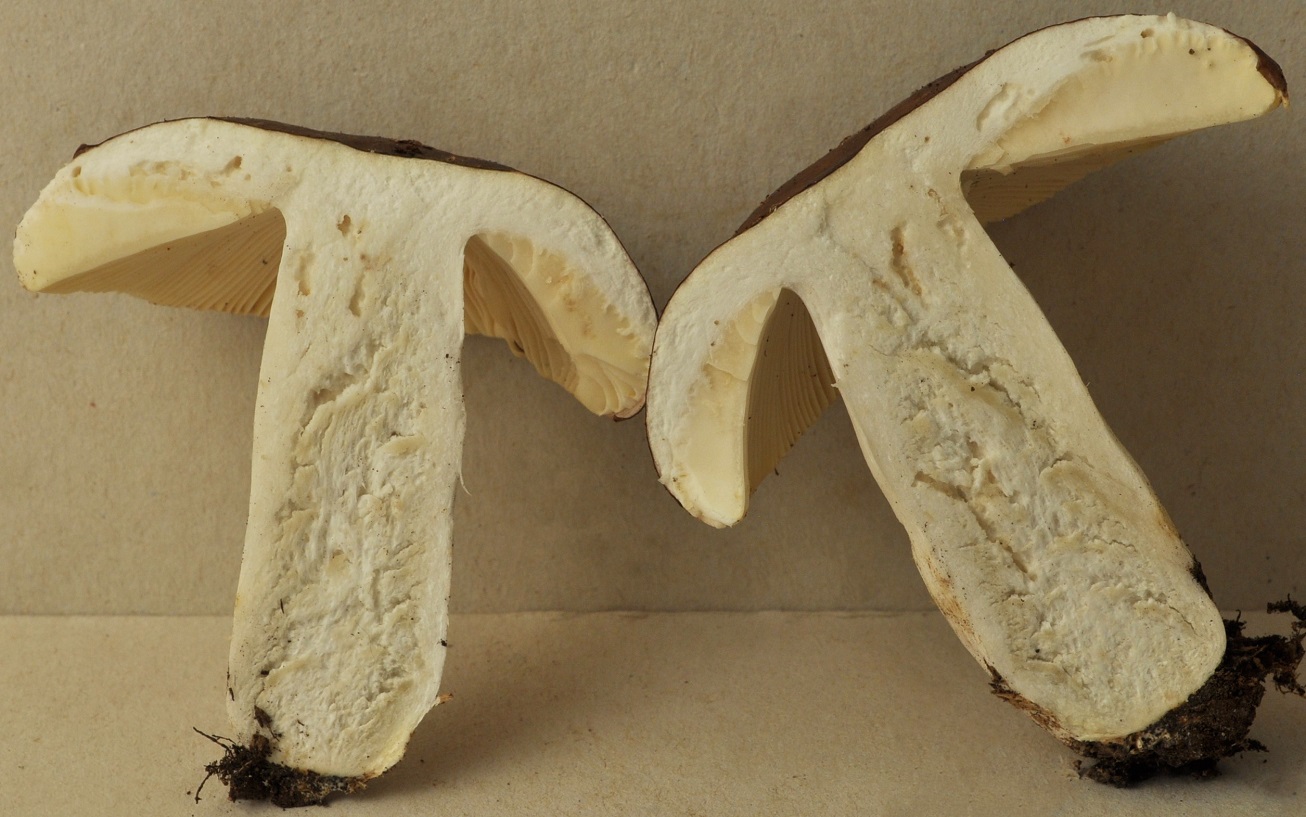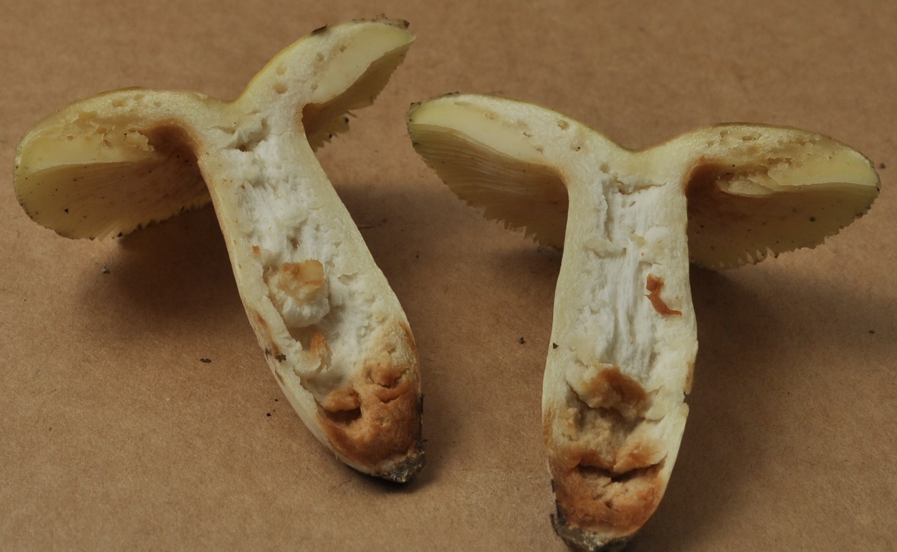 A voir dans la coupe les lames adnées ou émarginées, ligne de Trindel 2, arête rougeâtre à la marge, chair se colorant de brunâtre. Standard R.suberythropus..