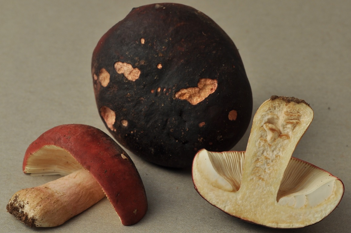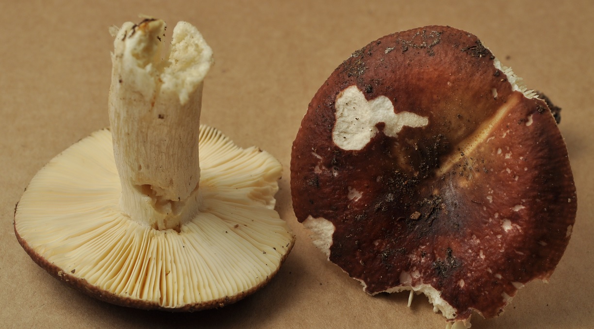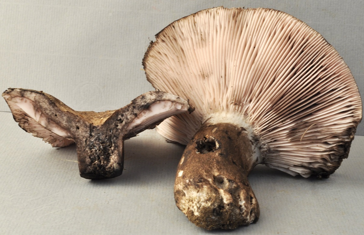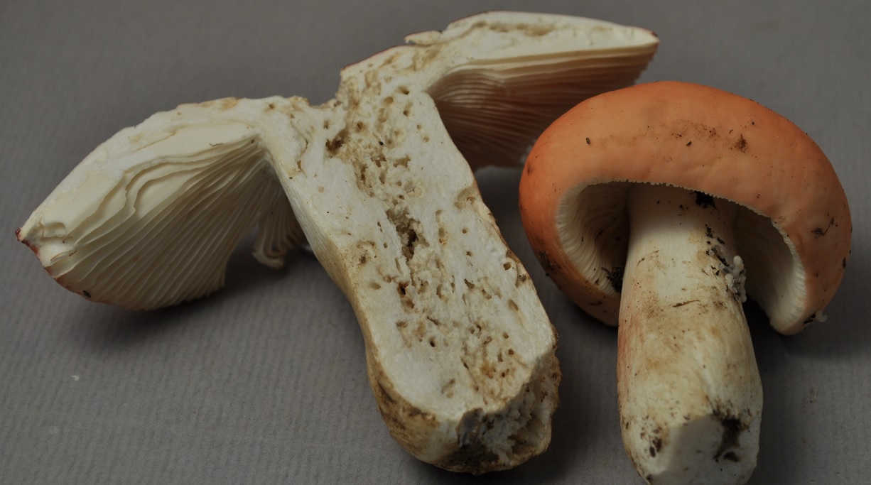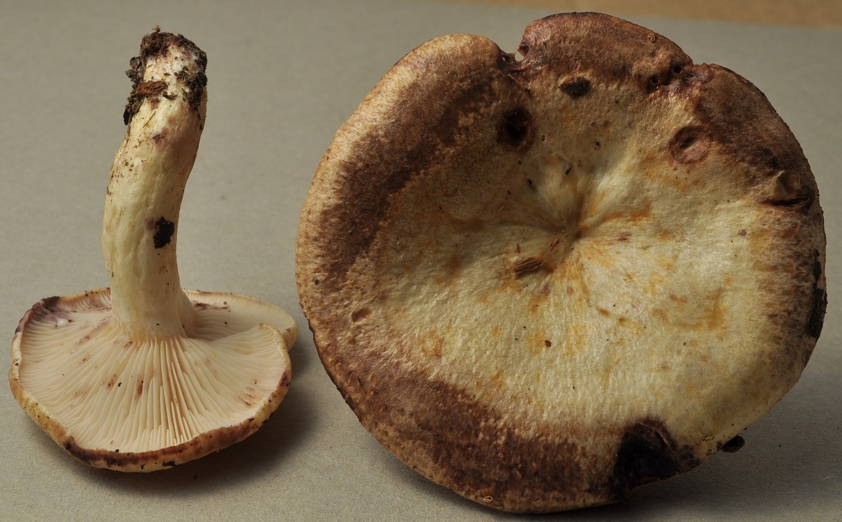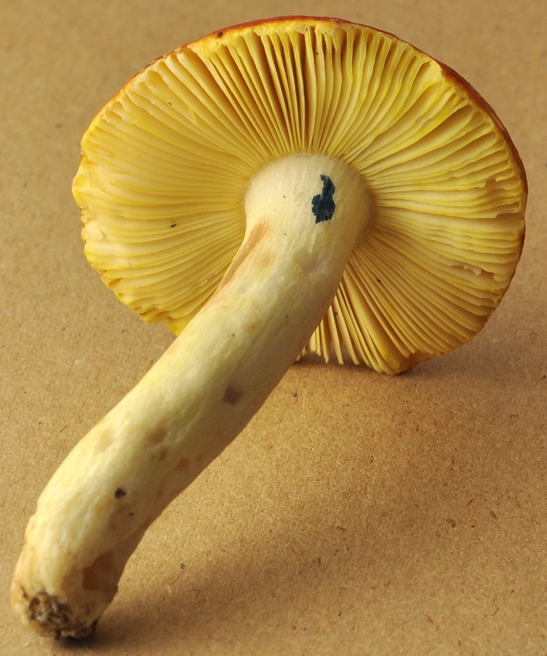 A voir dans la coupe les lames adnées ou émarginées, ligne de Trindel 2, arête rougeâtre à la marge, chair se colorant de brunâtre. Standard R.suberythropus..