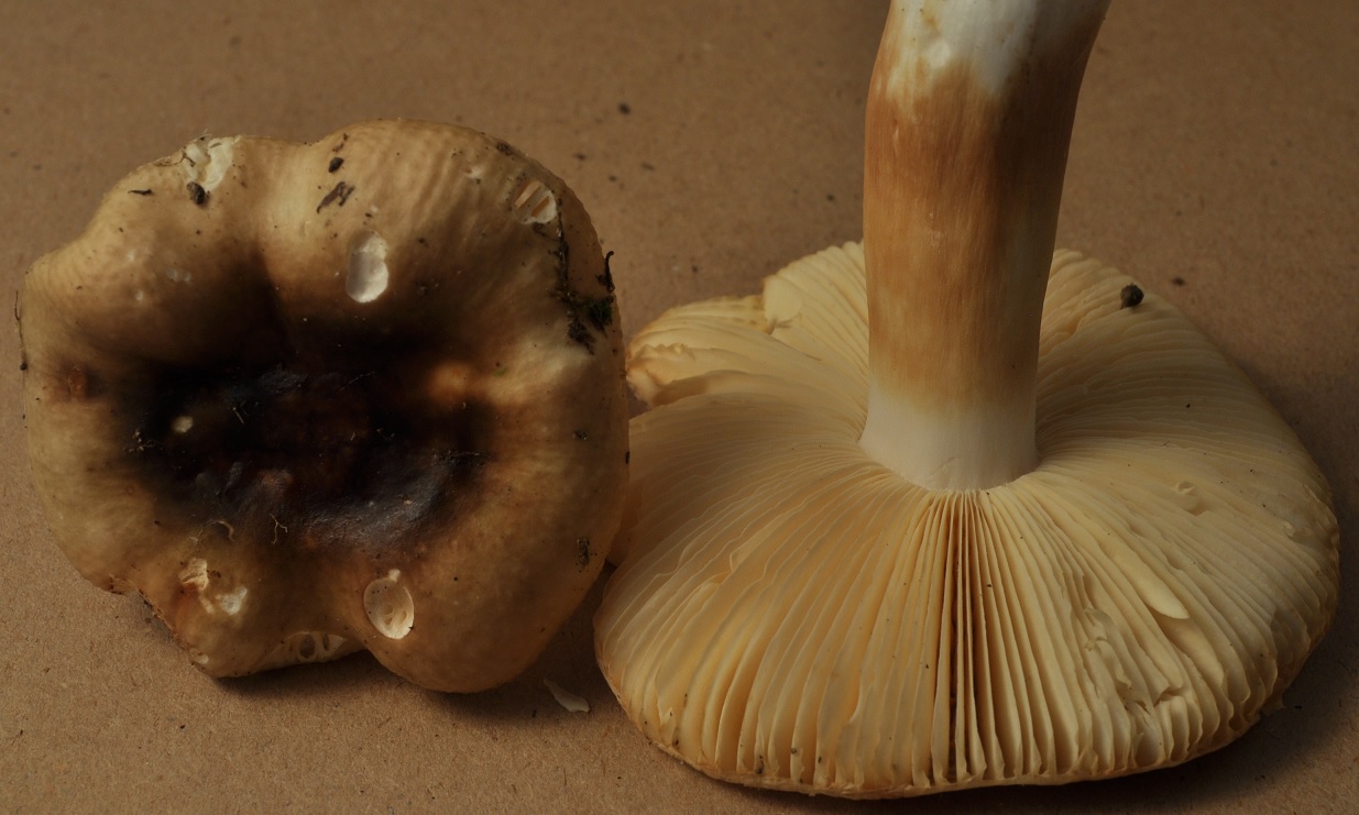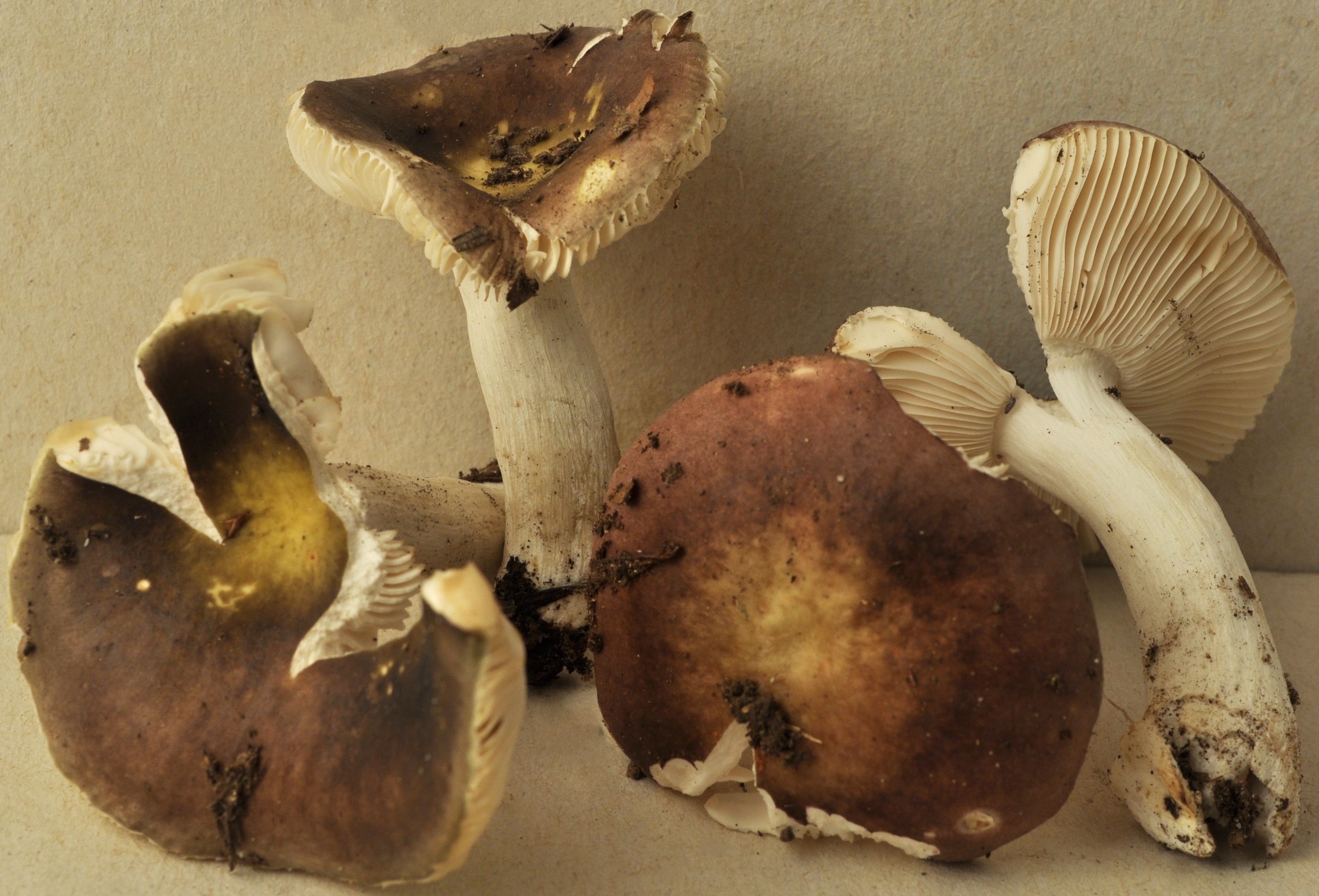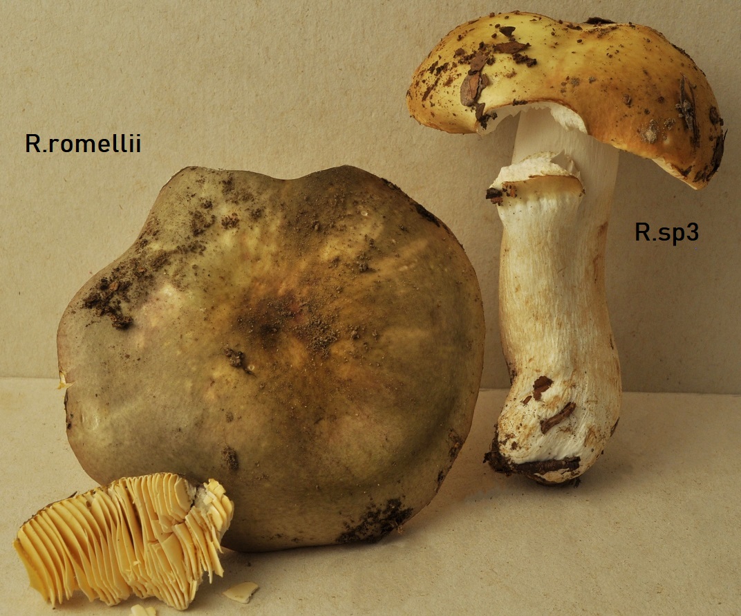 coupe, CD8-F11 17/19. Chapeau ocre brun, rappelant "R.mustelina" (bonne ressemblance avec Galli-373 R.xerampelina var. fuscoochracea). Stipe ridé, pruineux en haut, vite brunissant. Lames jaune-ocre, serrées, émarginées, qq fourchues. Ga S++ C++, Fe vert sombre rapidement. Forte odeur nauséeuse.