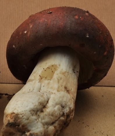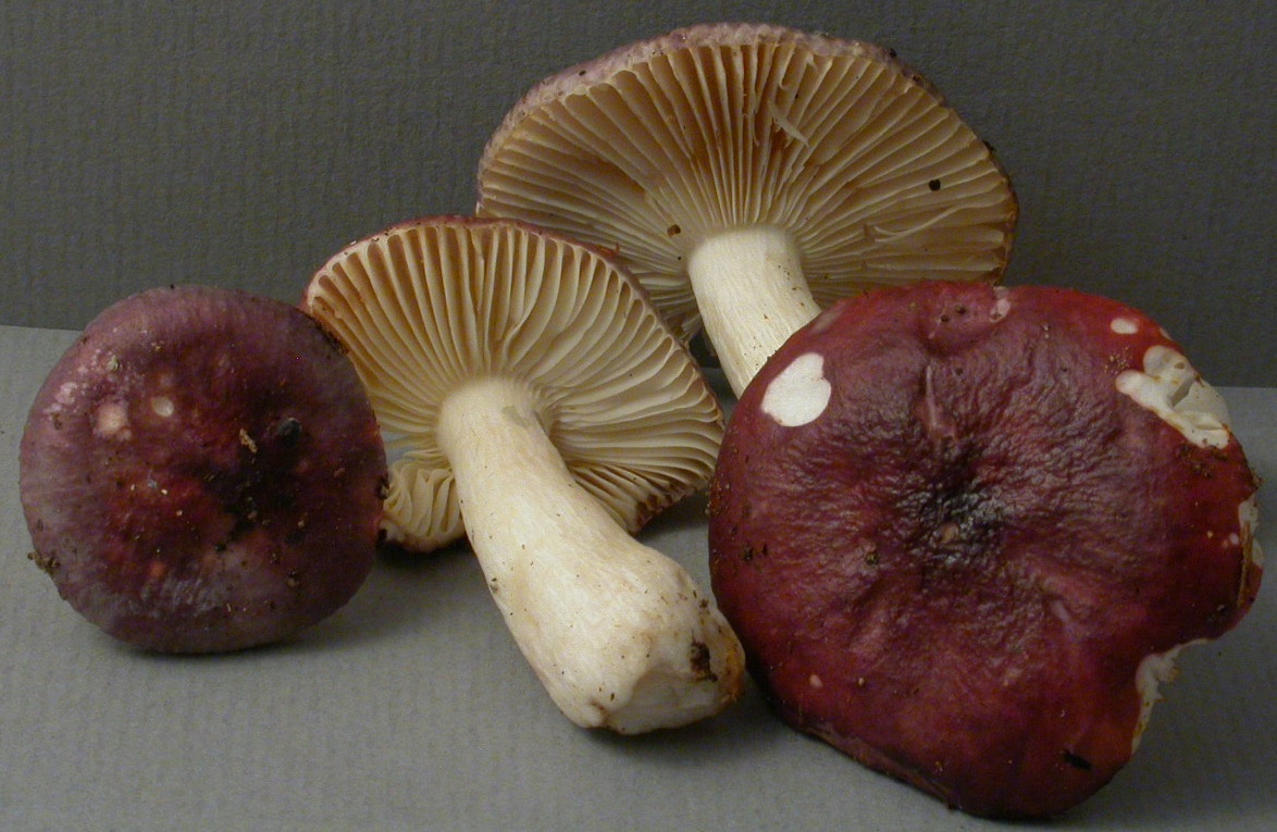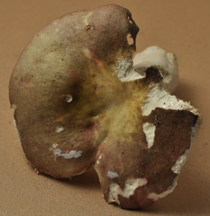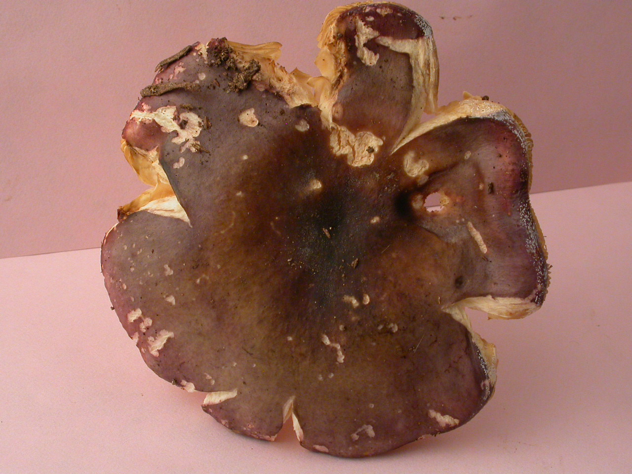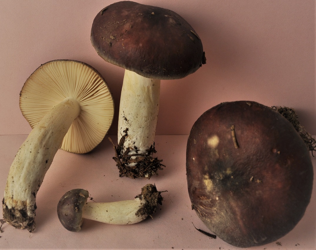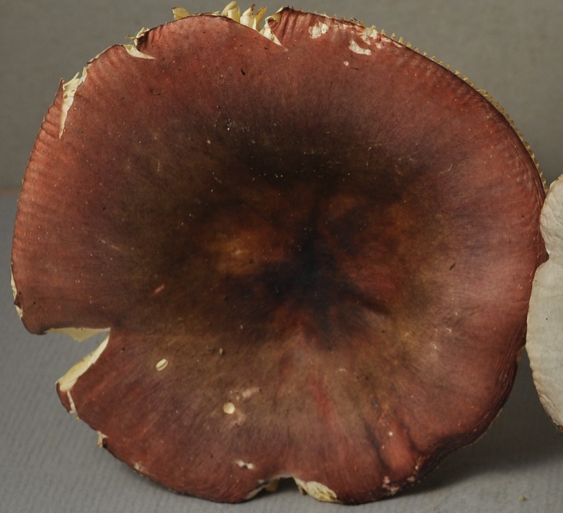dessous, CD7-3 33/35. Chapeau pourpre brunâtre uniforme. Lames crèmes. Stipe fortement salissant dans le bas. KOH rouge bas du stipe. Ga S+++ L+++.