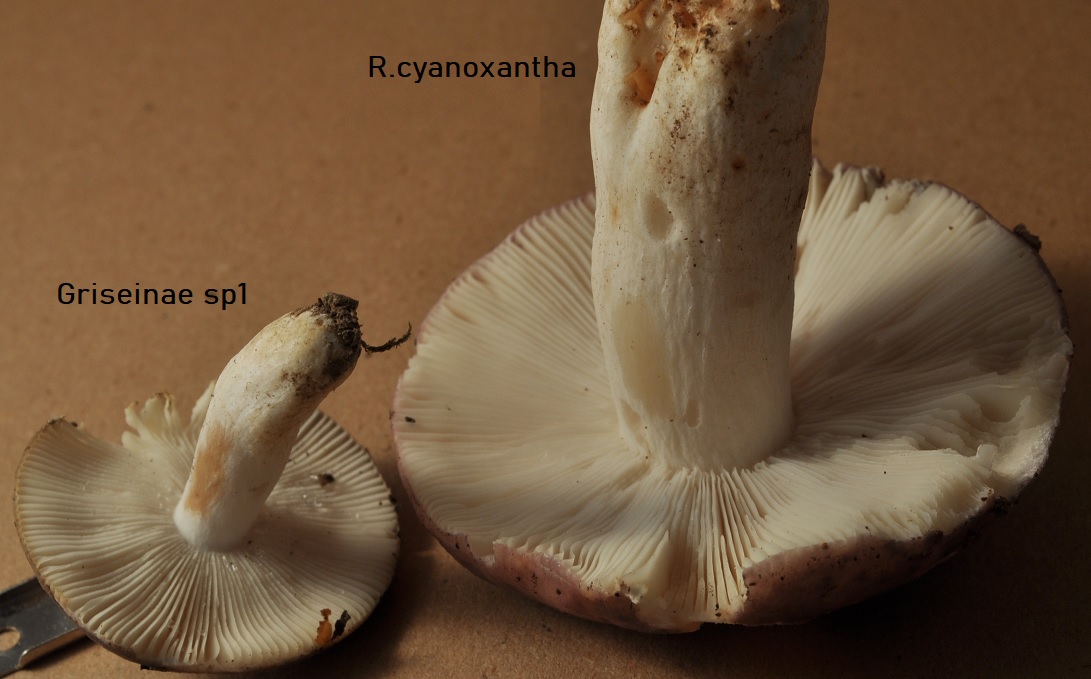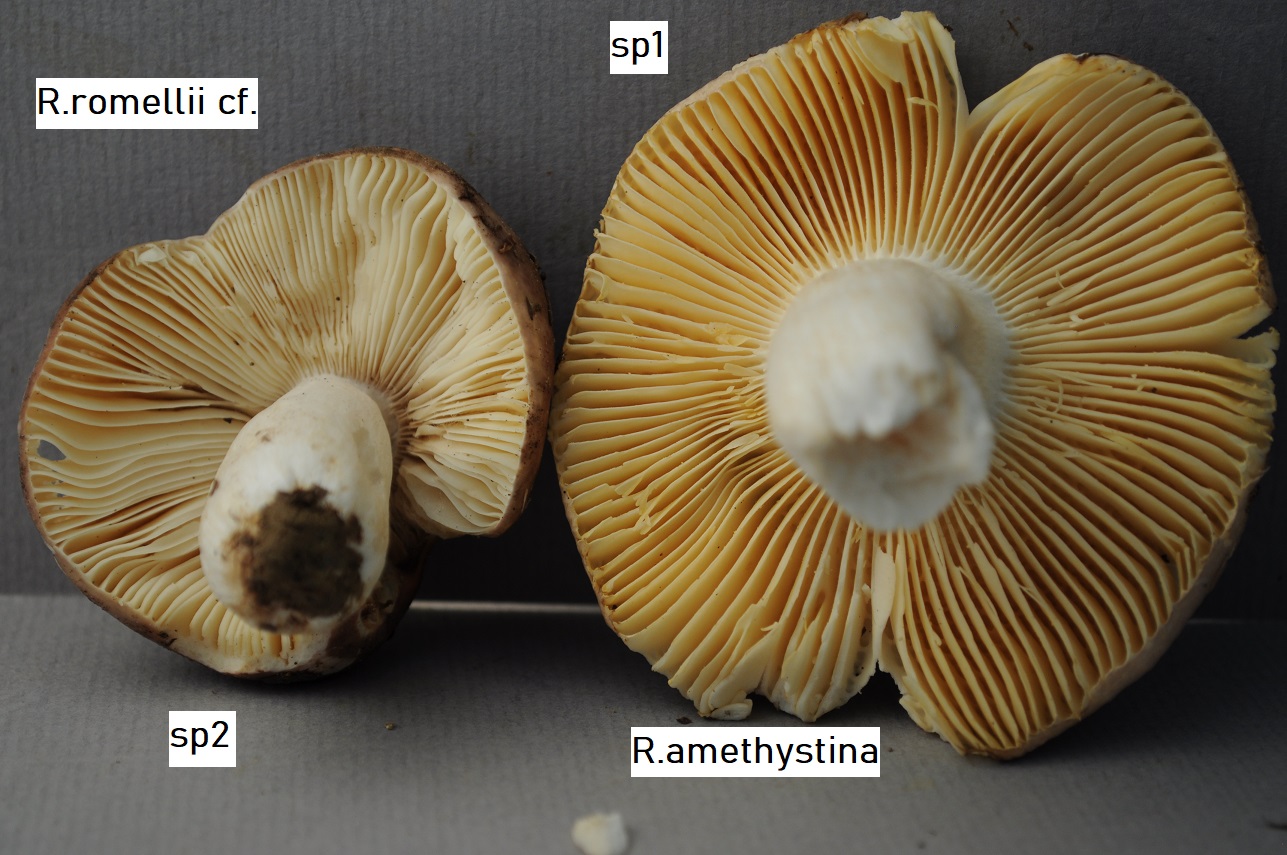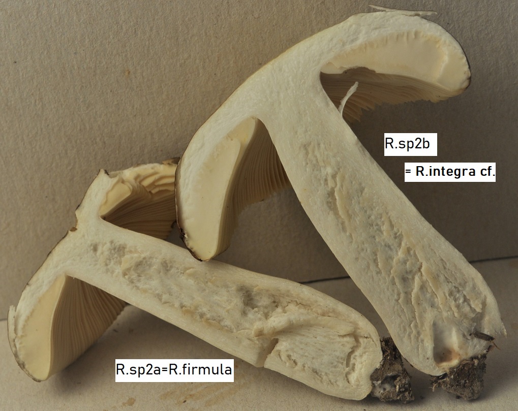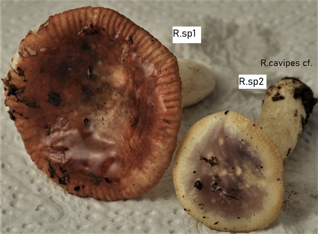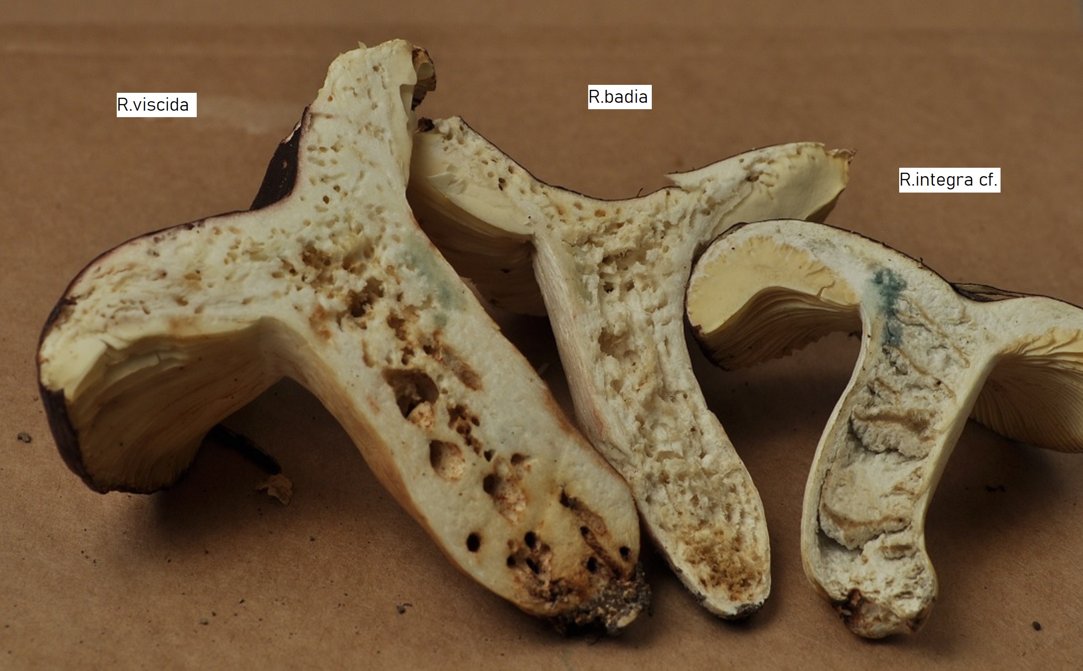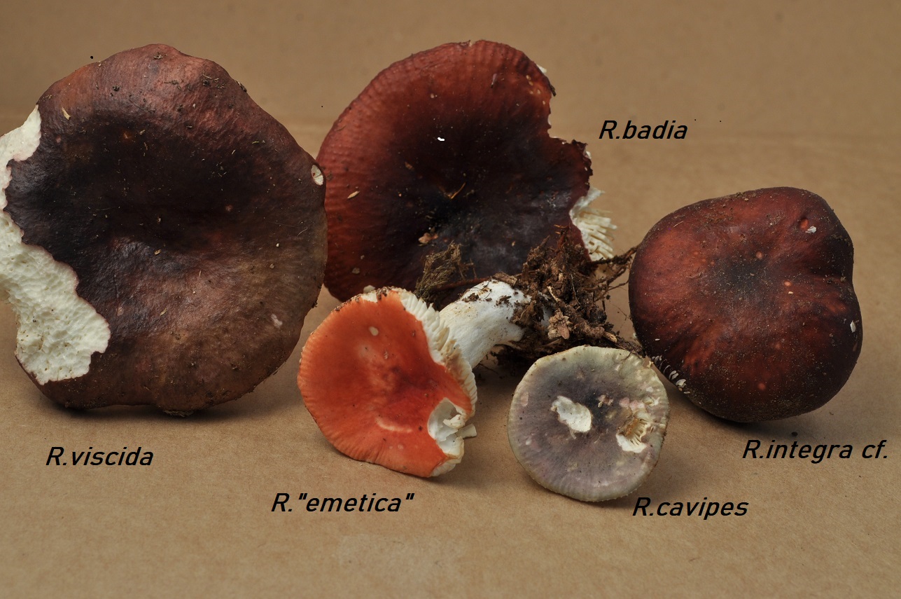 13/9/20, Col de Porte, micro 2450, fut sp1, 4 ex. Φ 72 à 95 mm, Avec les autres Russula du jour), CD8-F3 29. De gauche à droite et d'arrière en avant: R.sp1 (R.viscida), R.sp2 (R.badia), R.sp3 (gr. integra ), R.sp4 (R."emetica "), R.sp5 (R.puellaris ou R.cavipes ?). dessous et coupe, CD8-F3 33, Comparaison en coupe, CD8-F3 35. Photo en coupe des 3 russules à chapeau brun pourpre, respectivement R.viscida, R.badia, R.integra cf. 2 caractéristiques qui peuvent permettre d'avancer dans une différentiation: forme des lames et réaction au Gaiac. R.viscida a des lames étroites par rapport aux 2 autres. La réaction au Gaiac a été noté: R.viscida C++ (5"), R.badia C0 (20 "), R.integra cf. C+++ (2"). Stipe jaunissant en bas. Lames crèmes (l/t 6/11 mm), adnées, anastomosées, fourchues vers le pied. Ga S+ (5") C+ (5"), KOH rouge (sur parties jaunissantes), orange (cuticule). Saveur âcre (lames), acrescente (chair).