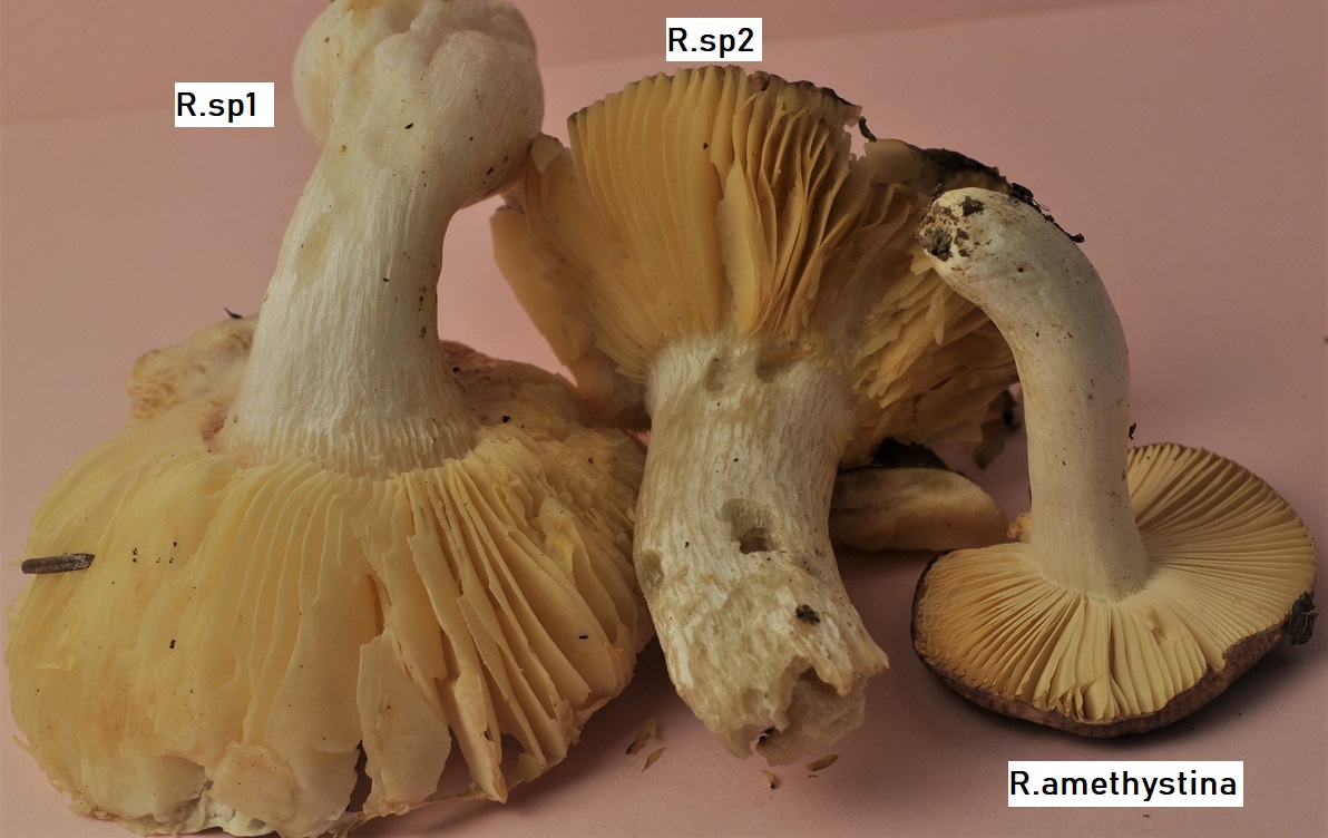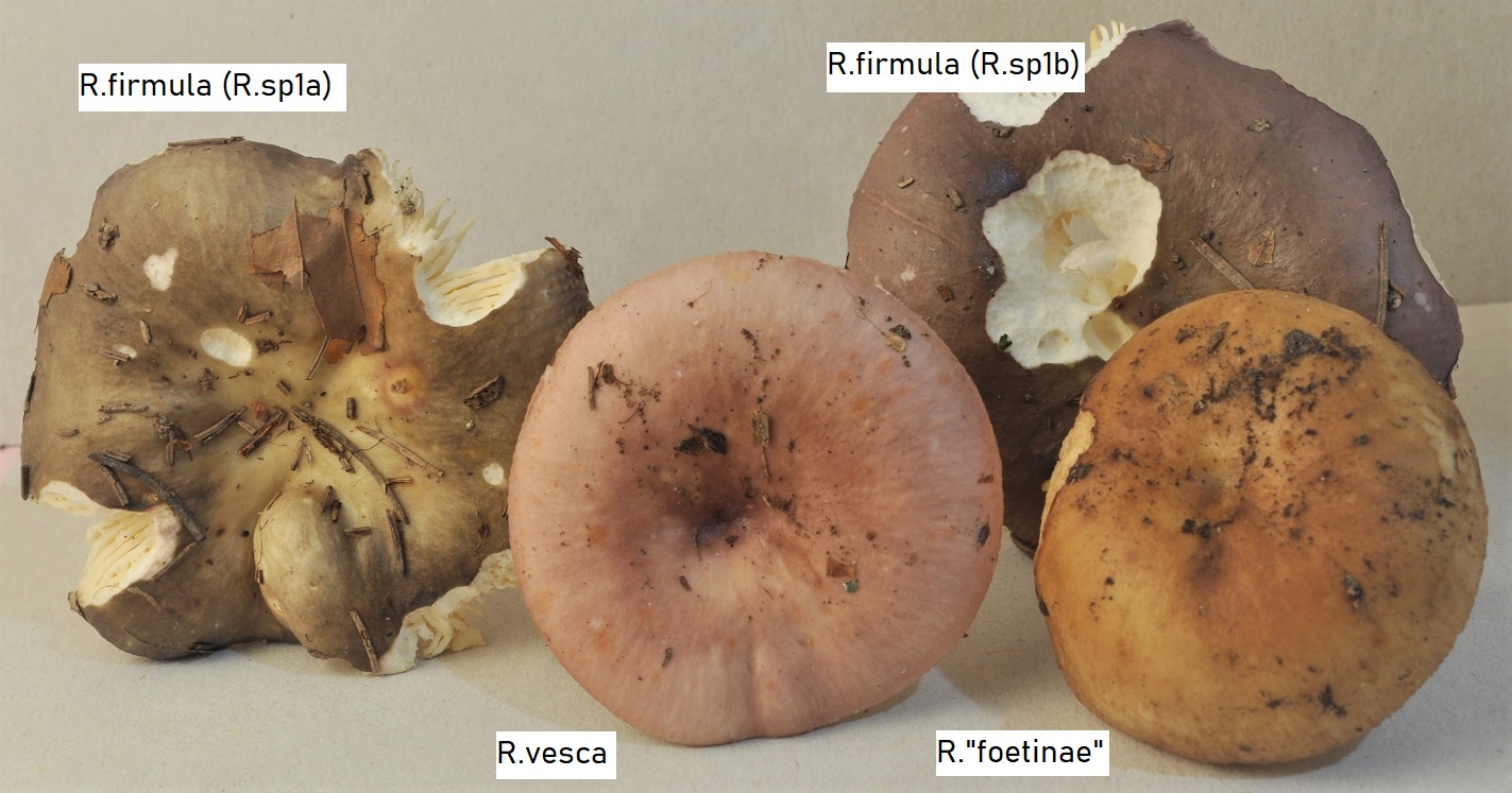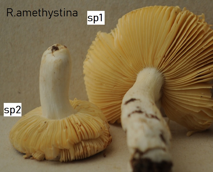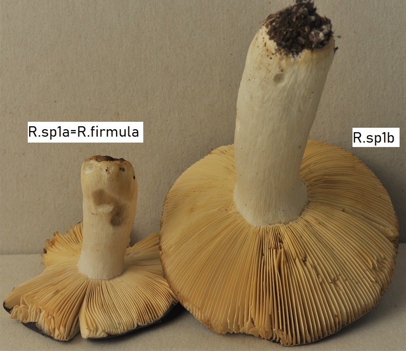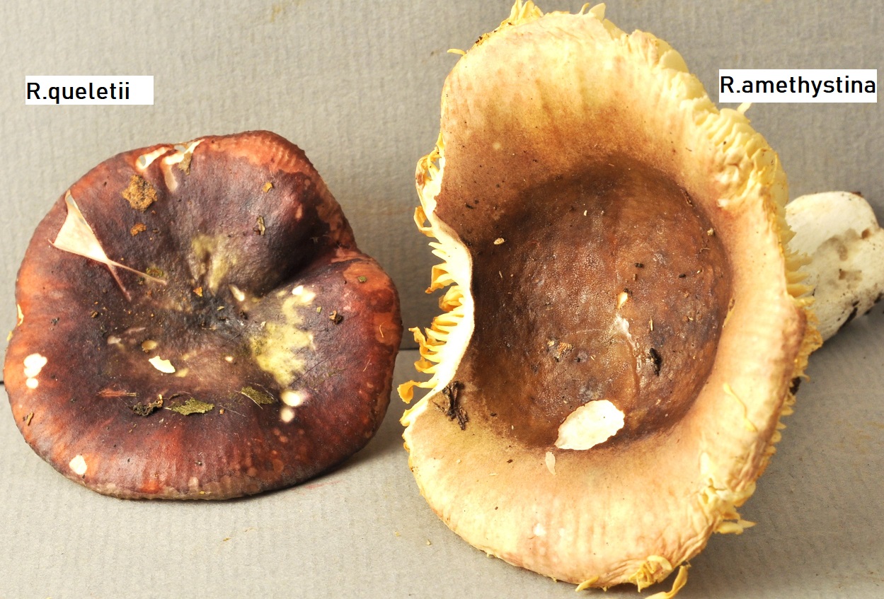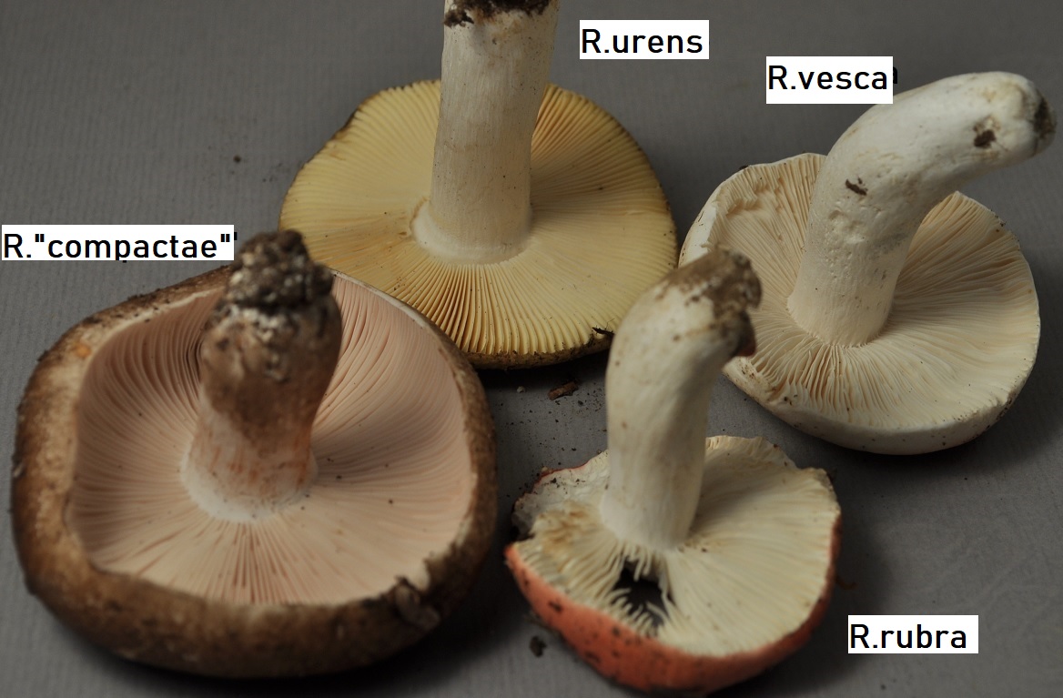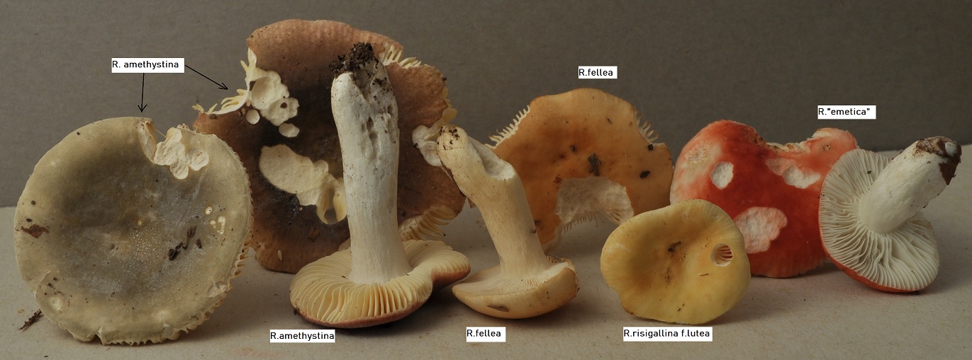 13/9/20, Col de Porte, micro 2450, fut sp1, 4 ex. Φ 72 à 95 mm, Avec les autres Russula du jour), CD8-F3 29. De gauche à droite et d'arrière en avant: R.sp1 (R.viscida), R.sp2 (R.badia), R.sp3 (gr. integra ), R.sp4 (R."emetica "), R.sp5 (R.puellaris ou R.cavipes ?). dessous et coupe, CD8-F3 33, Comparaison en coupe, CD8-F3 35. Photo en coupe des 3 russules à chapeau brun pourpre, respectivement R.viscida, R.badia, R.integra cf. 2 caractéristiques qui peuvent permettre d'avancer dans une différentiation: forme des lames et réaction au Gaiac. R.viscida a des lames étroites par rapport aux 2 autres. La réaction au Gaiac a été noté: R.viscida C++ (5"), R.badia C0 (20 "), R.integra cf. C+++ (2"). Stipe jaunissant en bas. Lames crèmes (l/t 6/11 mm), adnées, anastomosées, fourchues vers le pied. Ga S+ (5") C+ (5"), KOH rouge (sur parties jaunissantes), orange (cuticule). Saveur âcre (lames), acrescente (chair).