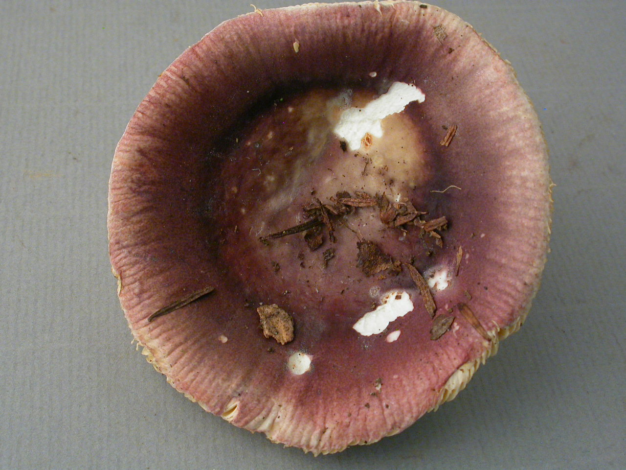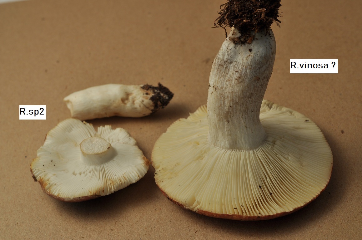 coupe, CD8-F7 43/46. Chapeau vineux mêlé d'ochracé, cuticule détachable (chair rougeâtre en dessous). Stipe grisonnant (fort avec le temps), poudré en haut, ridulé. Lames crèmes à jaunes, denses. Chair noircissante (en particulier cortex), saveur douce (lames), acrescente (chair). Ga S++ (4-5") L0 C0, Fe pâle puis orange, Phénol banale. Des arguments pour une détermination R.vinosa: l'absence de dermatos et la présence d'hyphes (primordiales dans l'épicutis), de grandes spores à (longs) aiguillons, un noircissement spectaculaire du stipe. Qq problèmes cependant, la non observation d'incrustations acidorésistantes, la non observation de caulocystides SV+ ( signe des Integroidinae, Romagnesi-734).