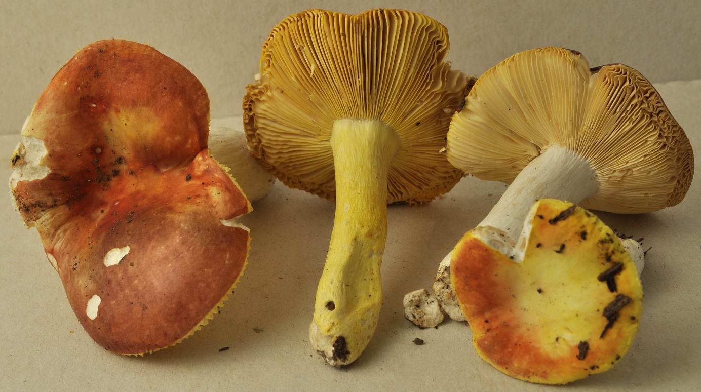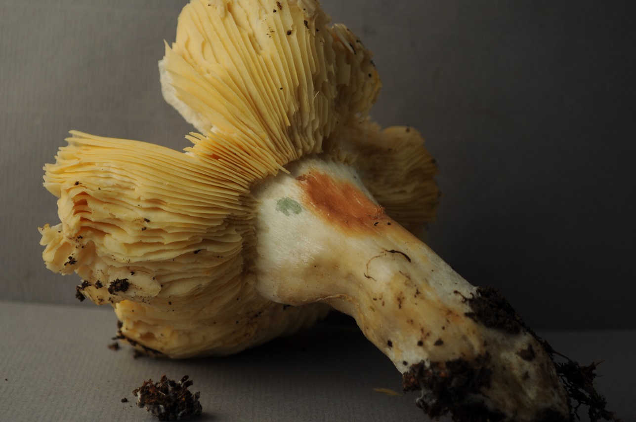 coupe, CD8-F11 136/137. Sporée jaune clair. Lames jaune-pâles, qq fourchues et lamellules. Stipe ridulé avec nuances de rouge, jaunissant. Fe vert. Odeur de crustacées. Ga S+++ L+++ C+++.