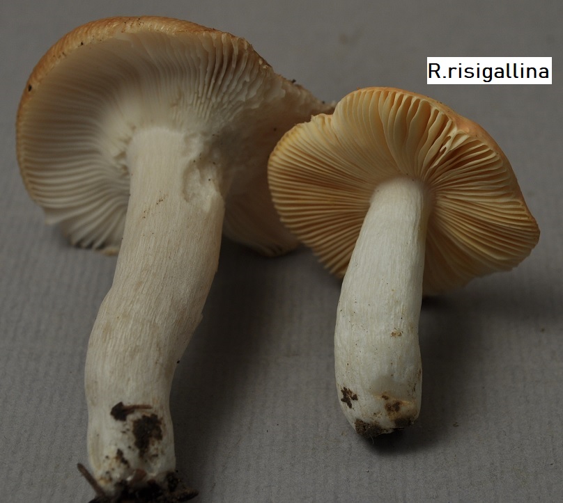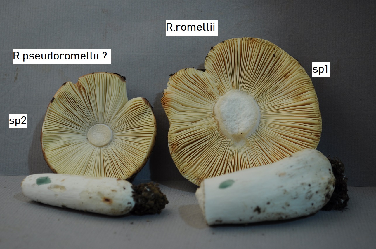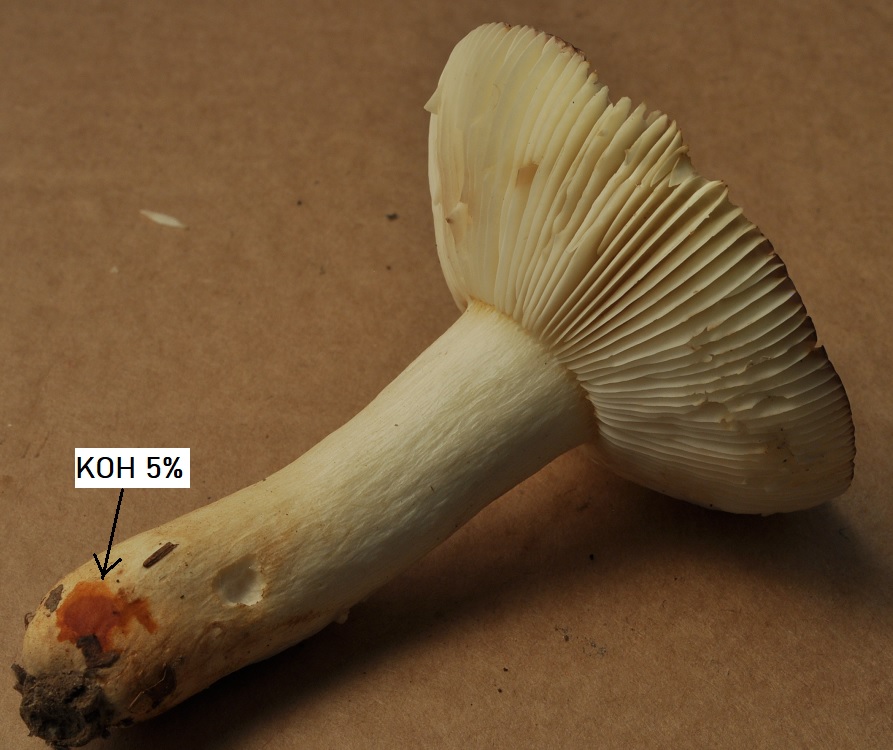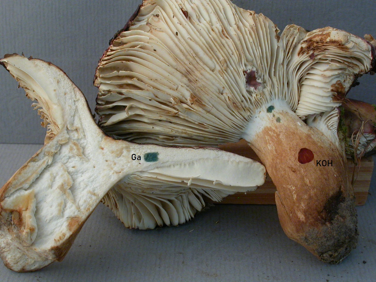 autre ex. Φ 100 mm: chapeau, CD8-F9 61/64. Ga S+++ C+++ . KOH rouge bas du stipe (lent). A noter que le deuxième ex. à coloration différente n'est pas sans rappeler le chapeau de R.romellii.