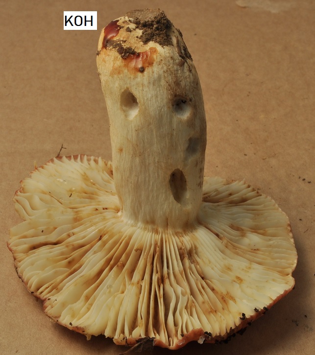 coupe, CD7- 23/24,28. Ch. rougeâtre, décolorations orangées, veines radiales. Stipe évasé en haut, clavé en bas, jaunissant, brunissant. Lames crèmes, fourchues sur le stipe. Saveur légèrement âcre (chair), fortement (lames). Sporée II. Fe jaune puis brun, Ga S+++, KOH très rouge sur les parties jaunâtres du bas du stipe mais aussi sur la chair jaunissante, le rougissement n'est donc pas lié au voile. Réaction nul en haut du stipe. (A confirmer).