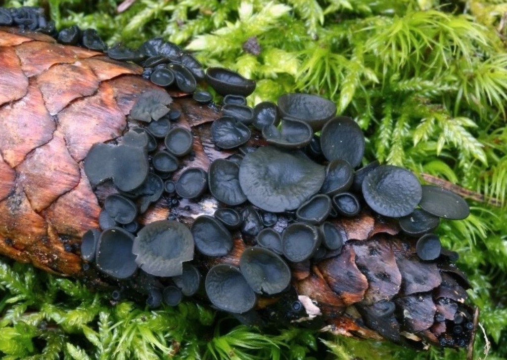 Rustroemia bulgarioides Asco sur cône d'épicéa, au printemps, après la neige.photo (site SMB Seyssinet).