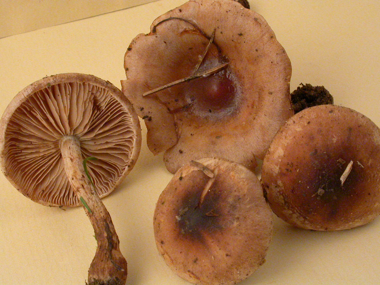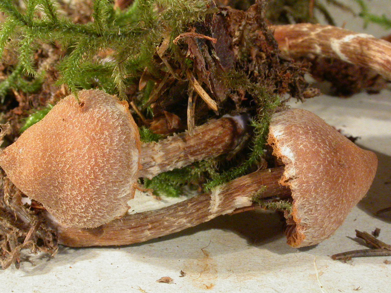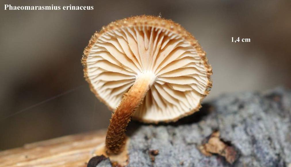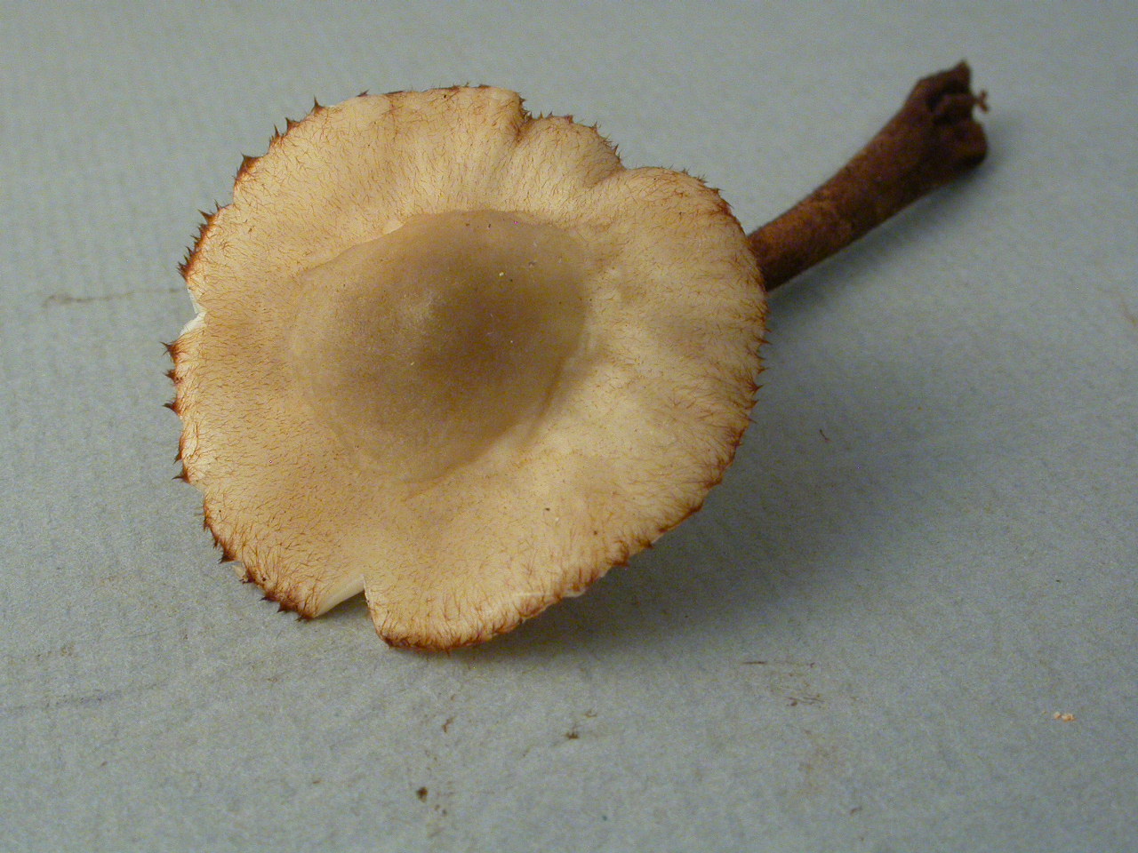 Conifères. Longs poils à la marge. Stipe brun rouge, enflé au collet.