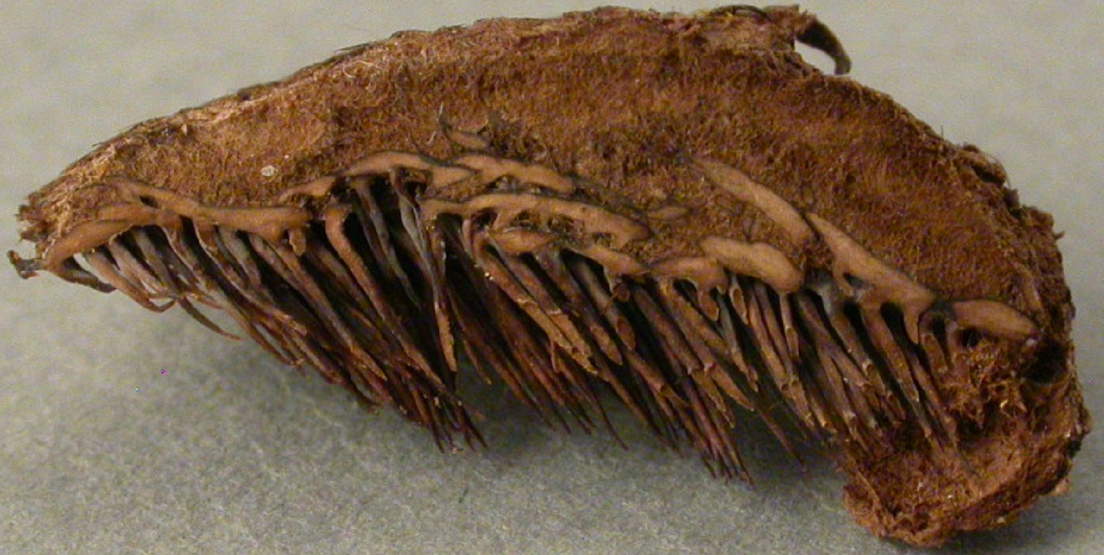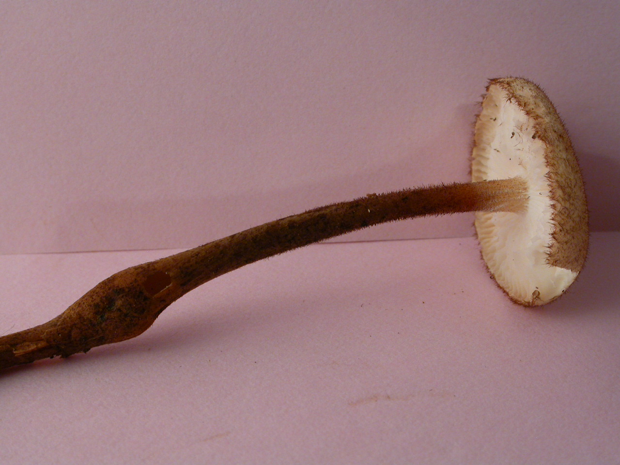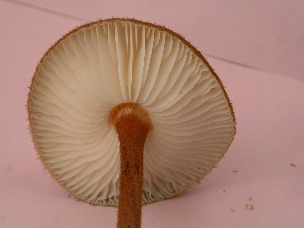 Conifères. Longs poils à la marge. Stipe brun rouge, enflé au collet.