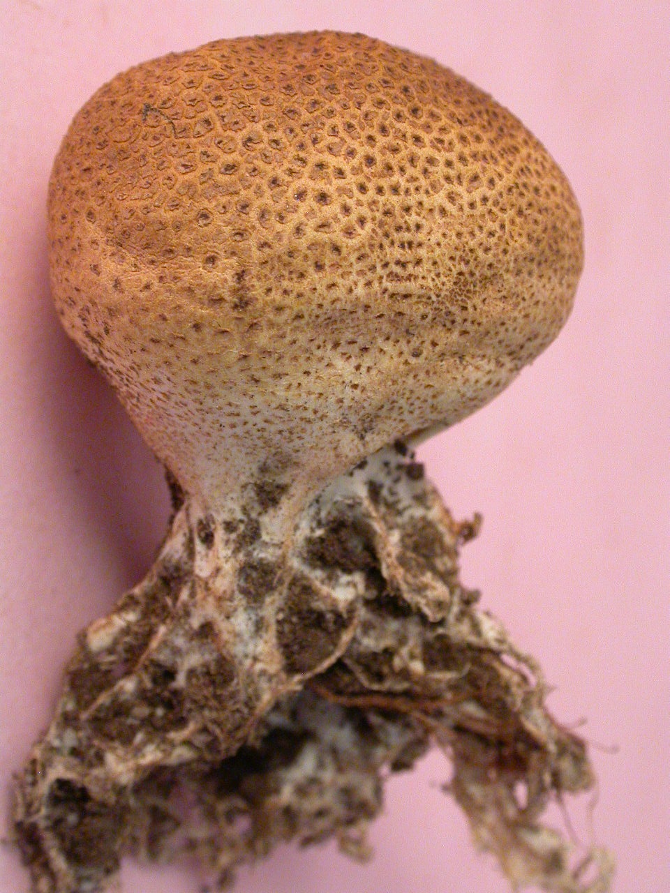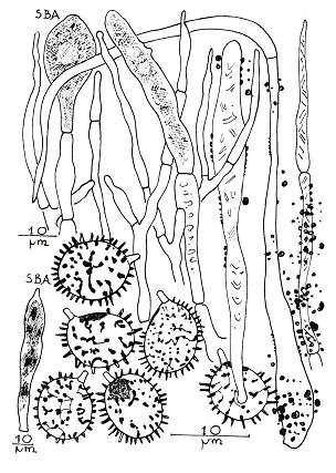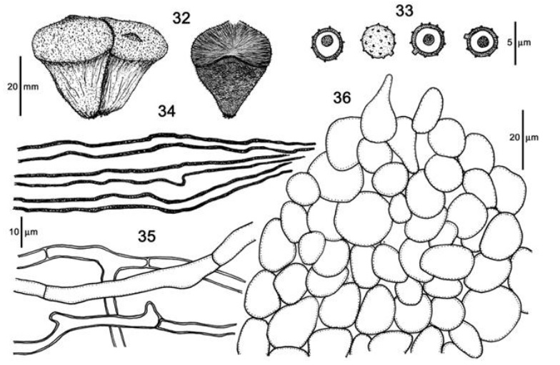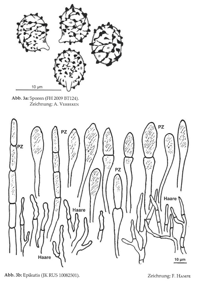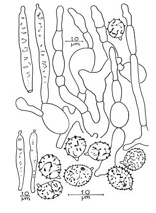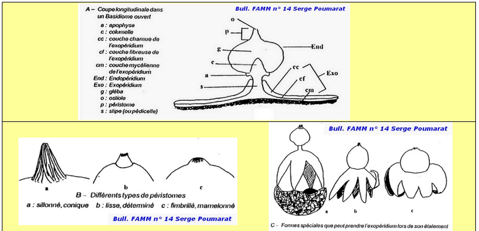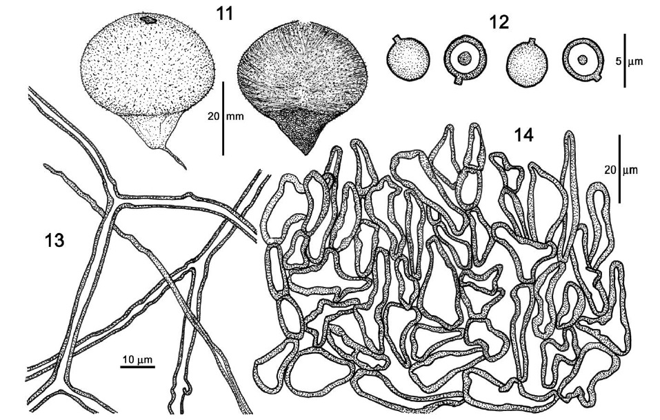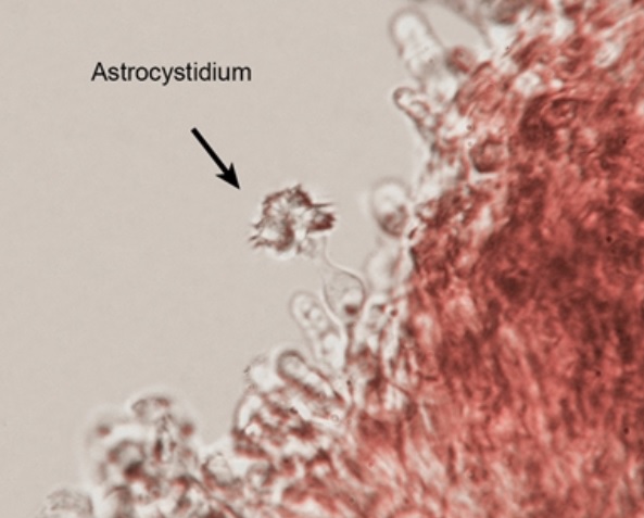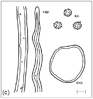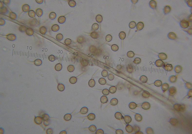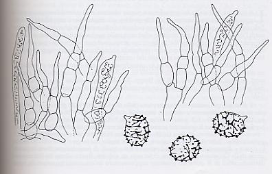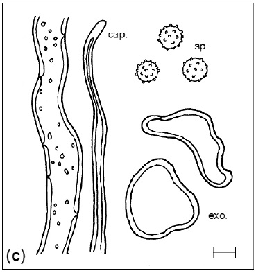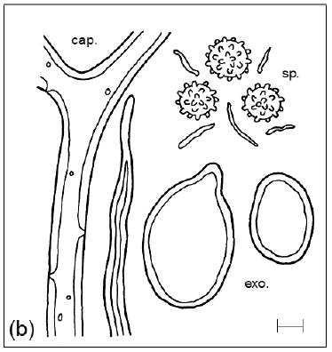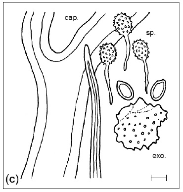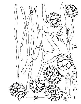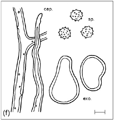 Diaphragme et subgléba à fossettes bien visibles et bien différentiés. Spores rondes bassement verruqueuses (à la limite du visible). Hyphes à parois minces (paracapillitium).