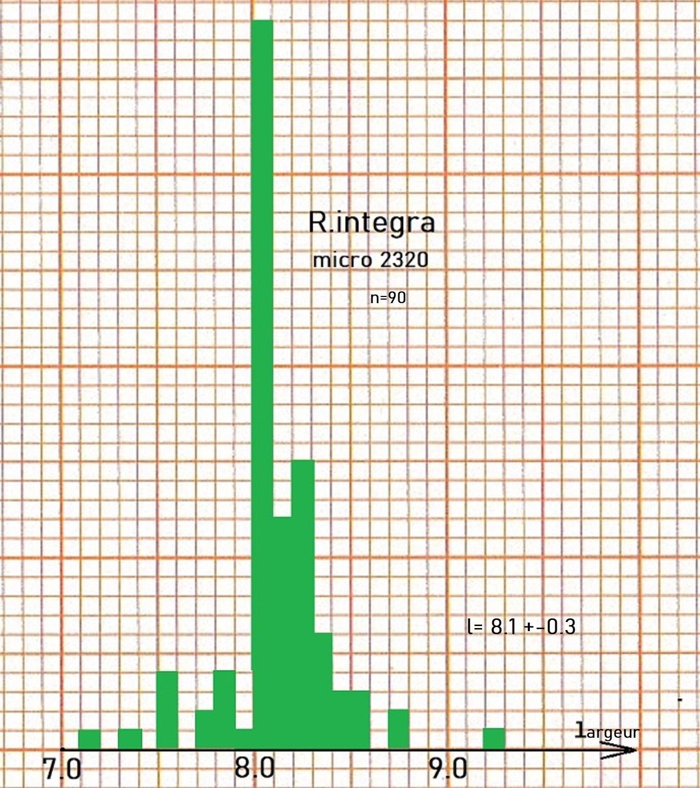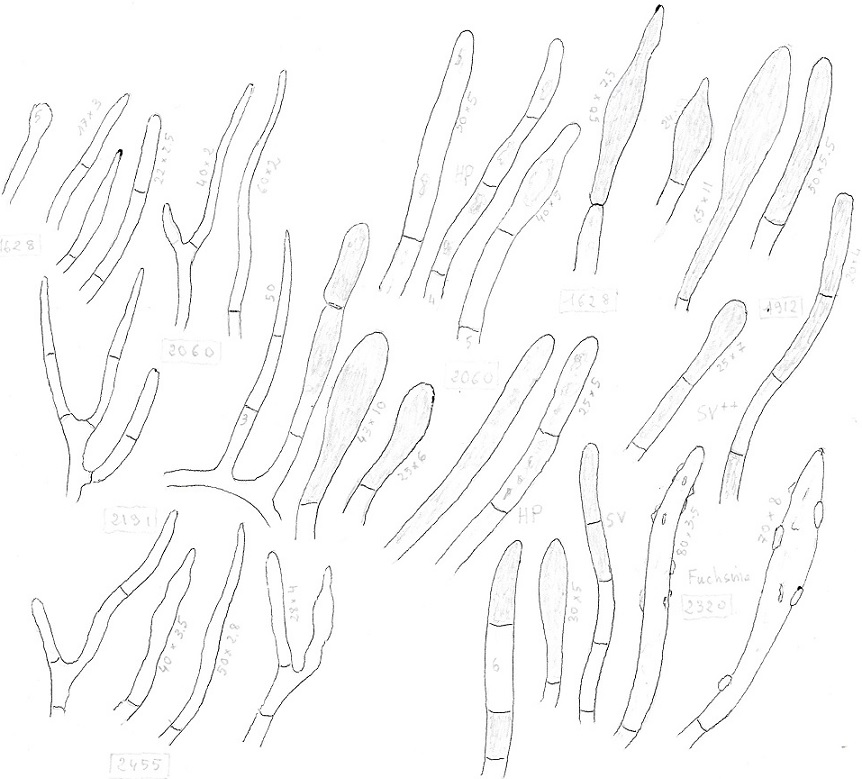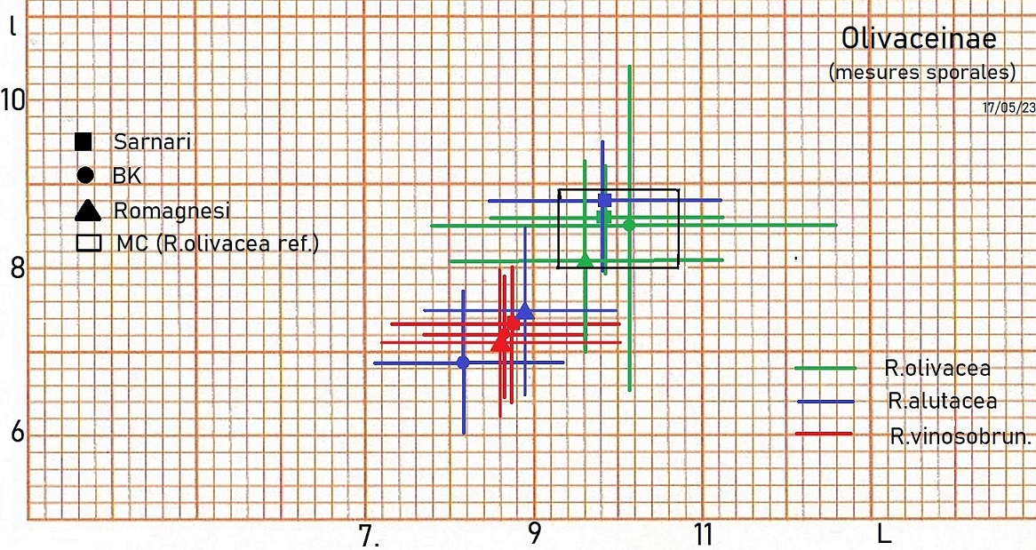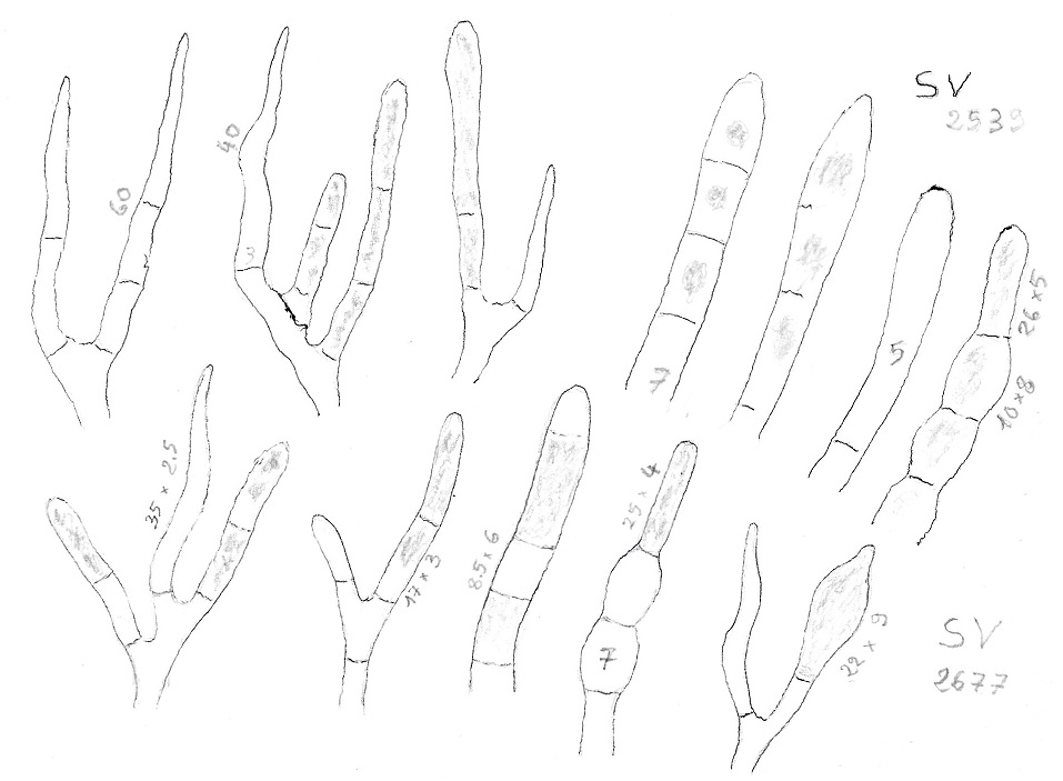 | 2 spores | 39 x 24 μ -- Q=1.62 ±0.12 | 40 x 24 μ -- Q=1.71 ±0.09 |