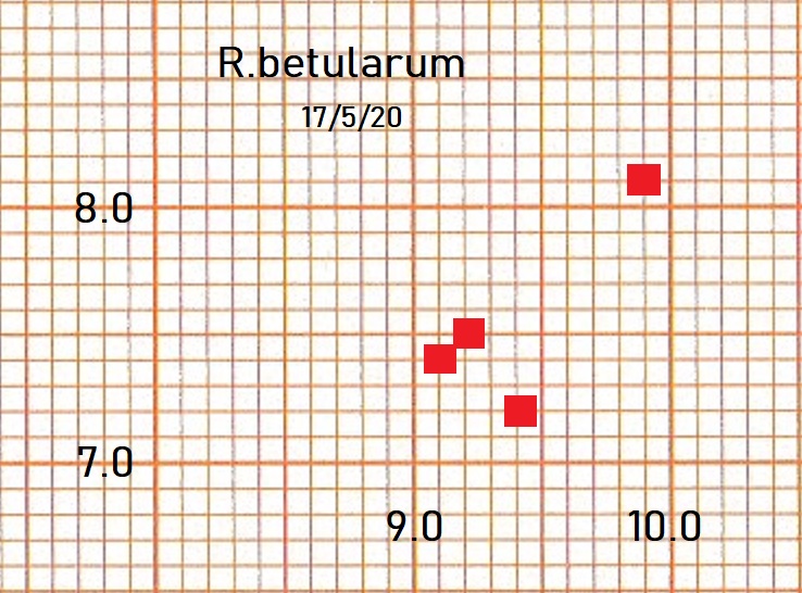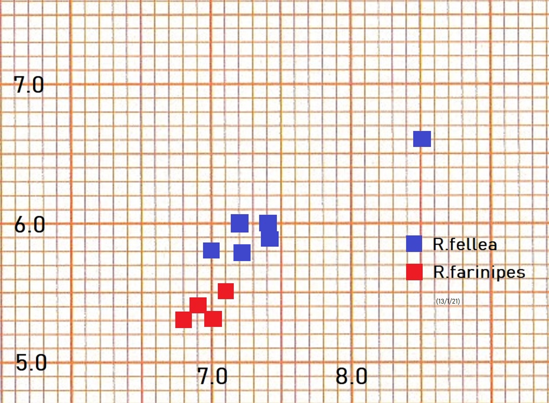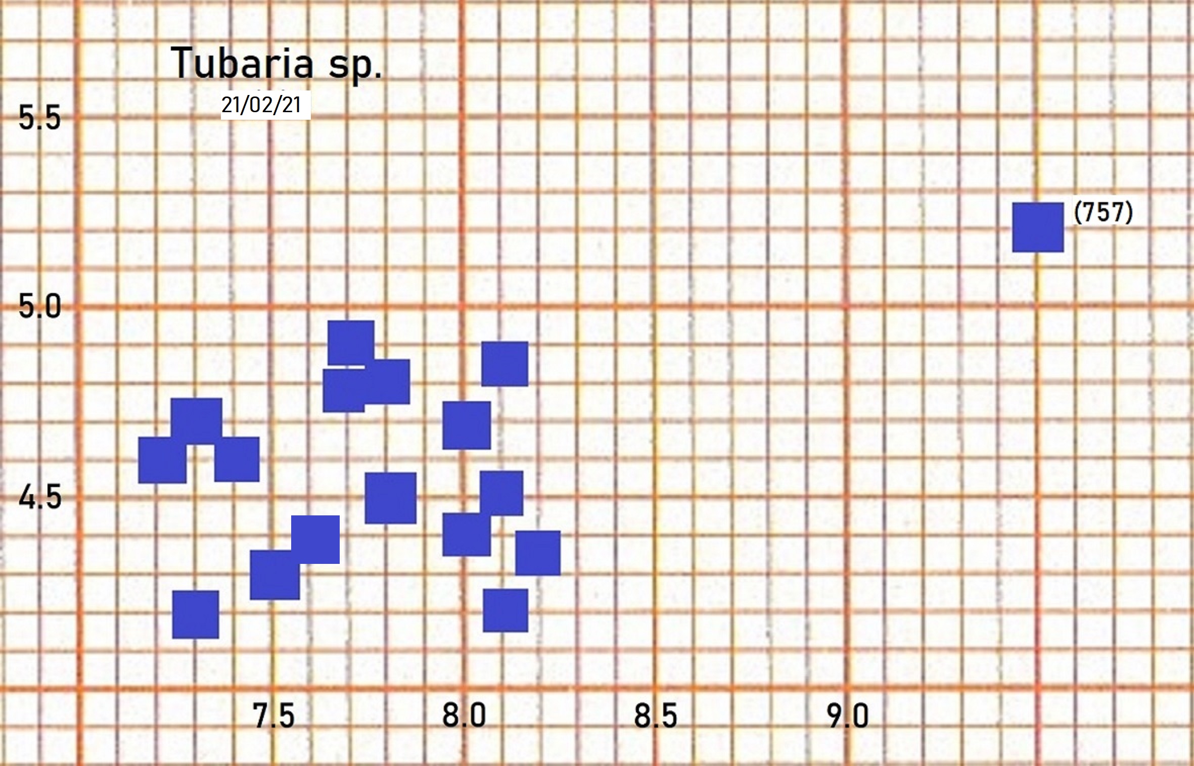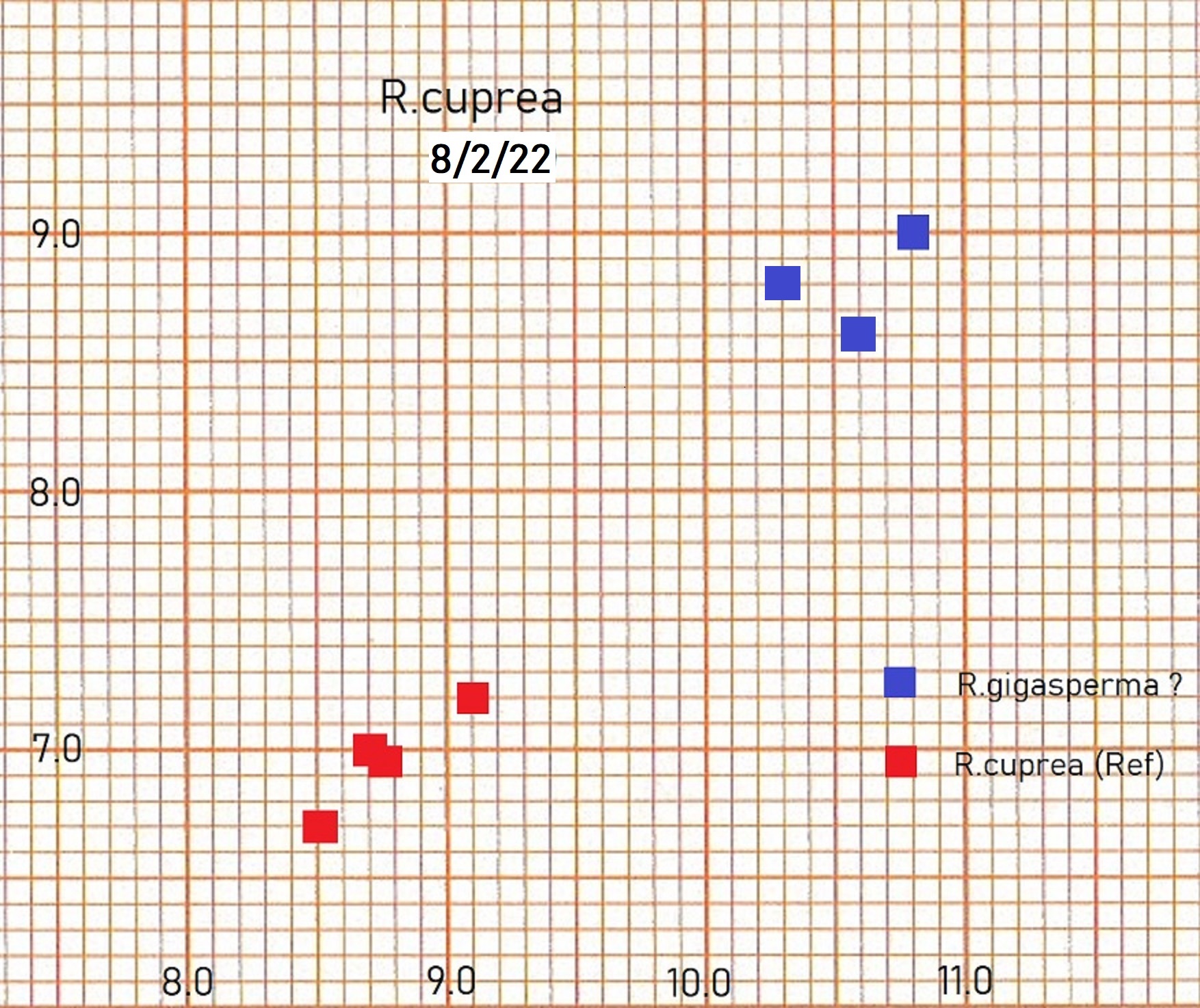 | 2 spores | 39 x 24 μ -- Q=1.62 ±0.12 | 40 x 24 μ -- Q=1.71 ±0.09 |