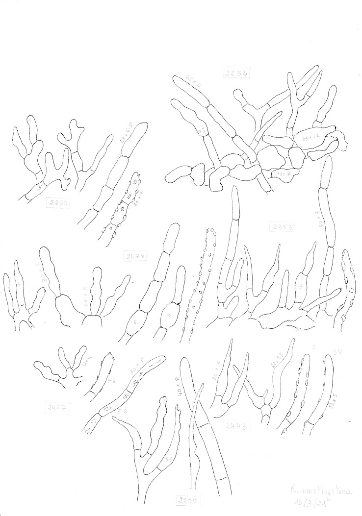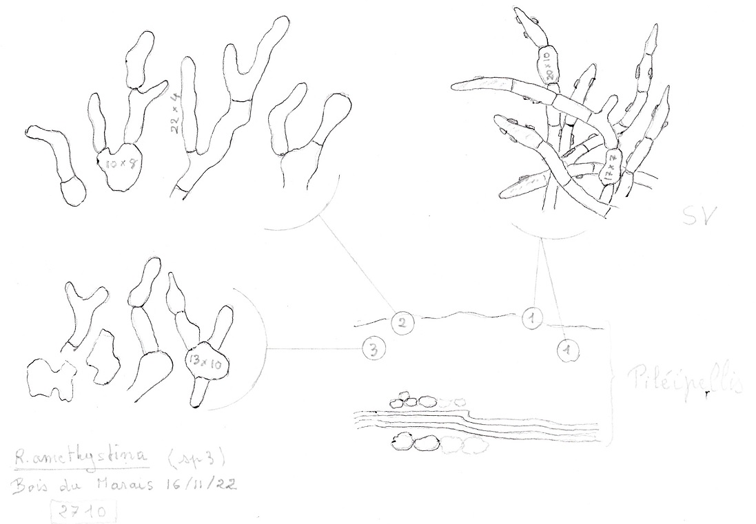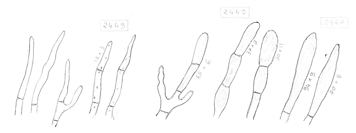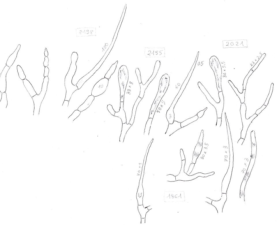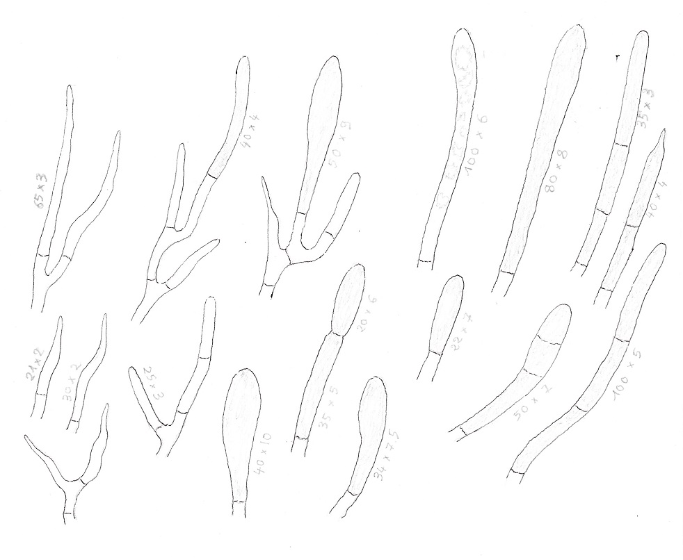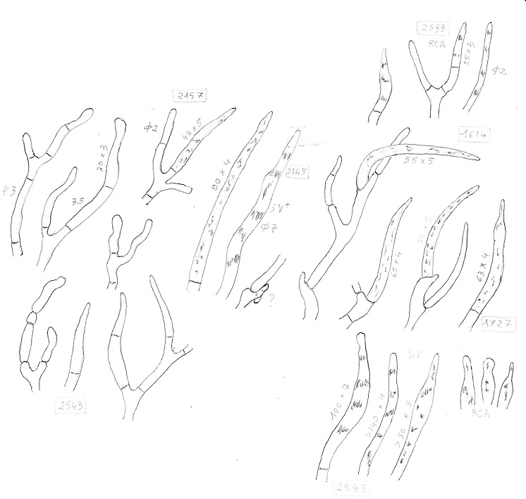 A noter l'absence, dans les récoltes, de cystides de type lagéniforme type V (contrairement aux récoltes de A.praecox). ( exception: récolte 1857).