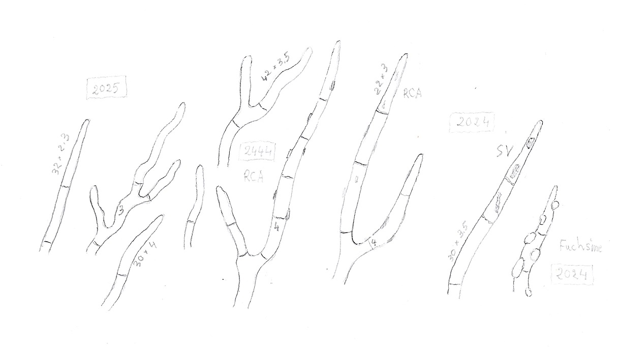 Existence de chlamydospores arrondies (BK-393). Peut expliquer les variations de formes observées dans les sporées.
