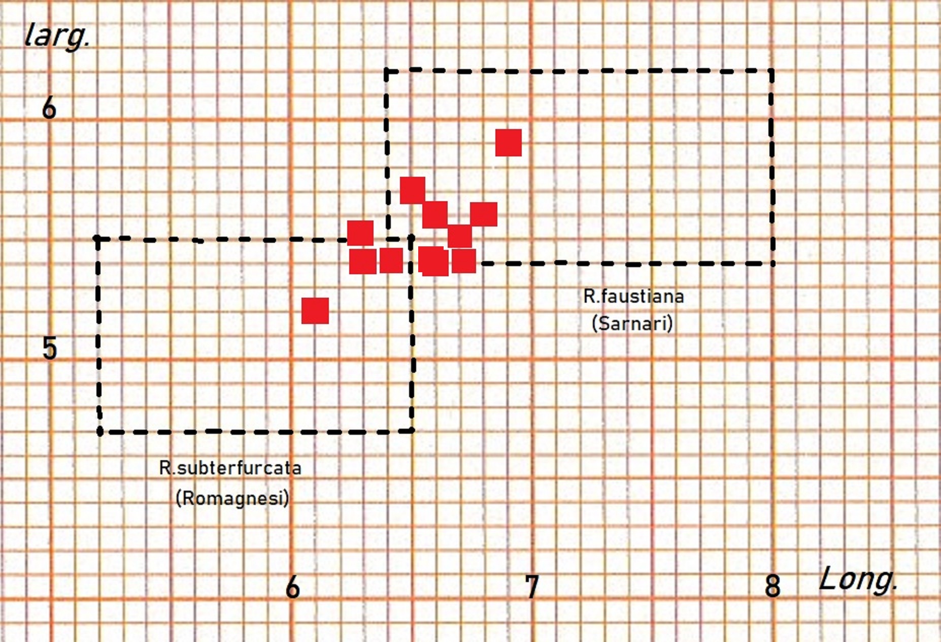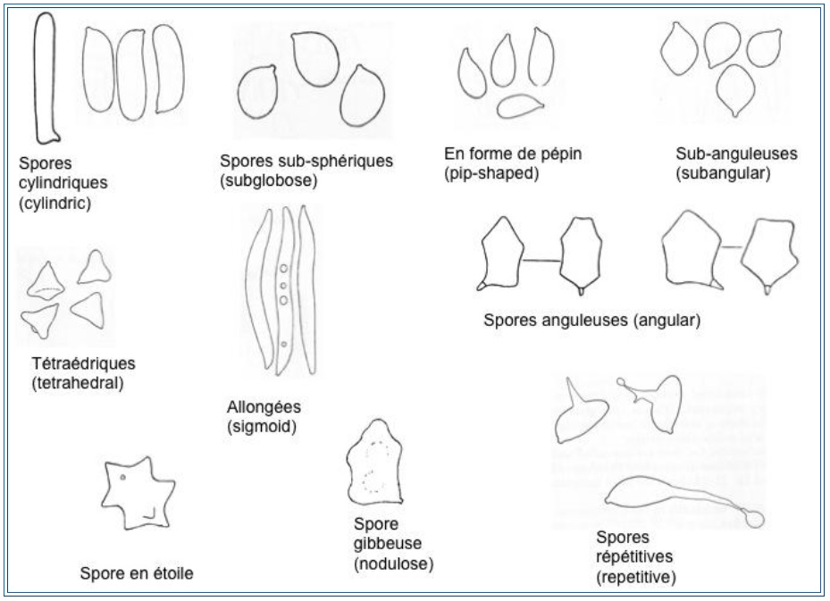 Les spores ne sont "pruniformes à subglobuleuses" (Bon, Roux) qu'en position dorsale. Elles sont subcylindriques en position costales.