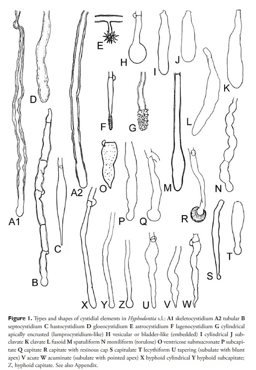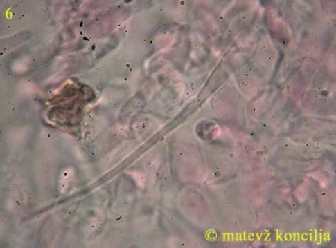 Spores lisses, cylindriques, amyloïdes. Cystides incrustées, muriquées. Boucles.