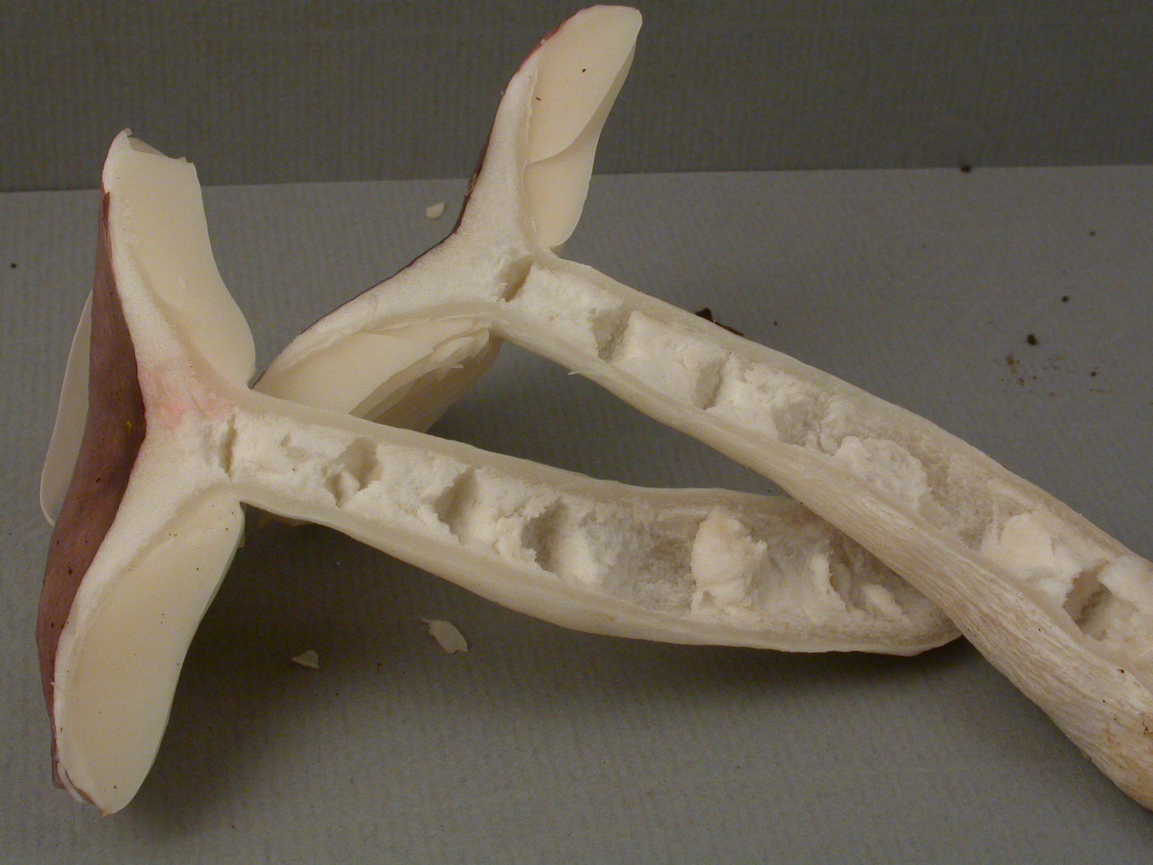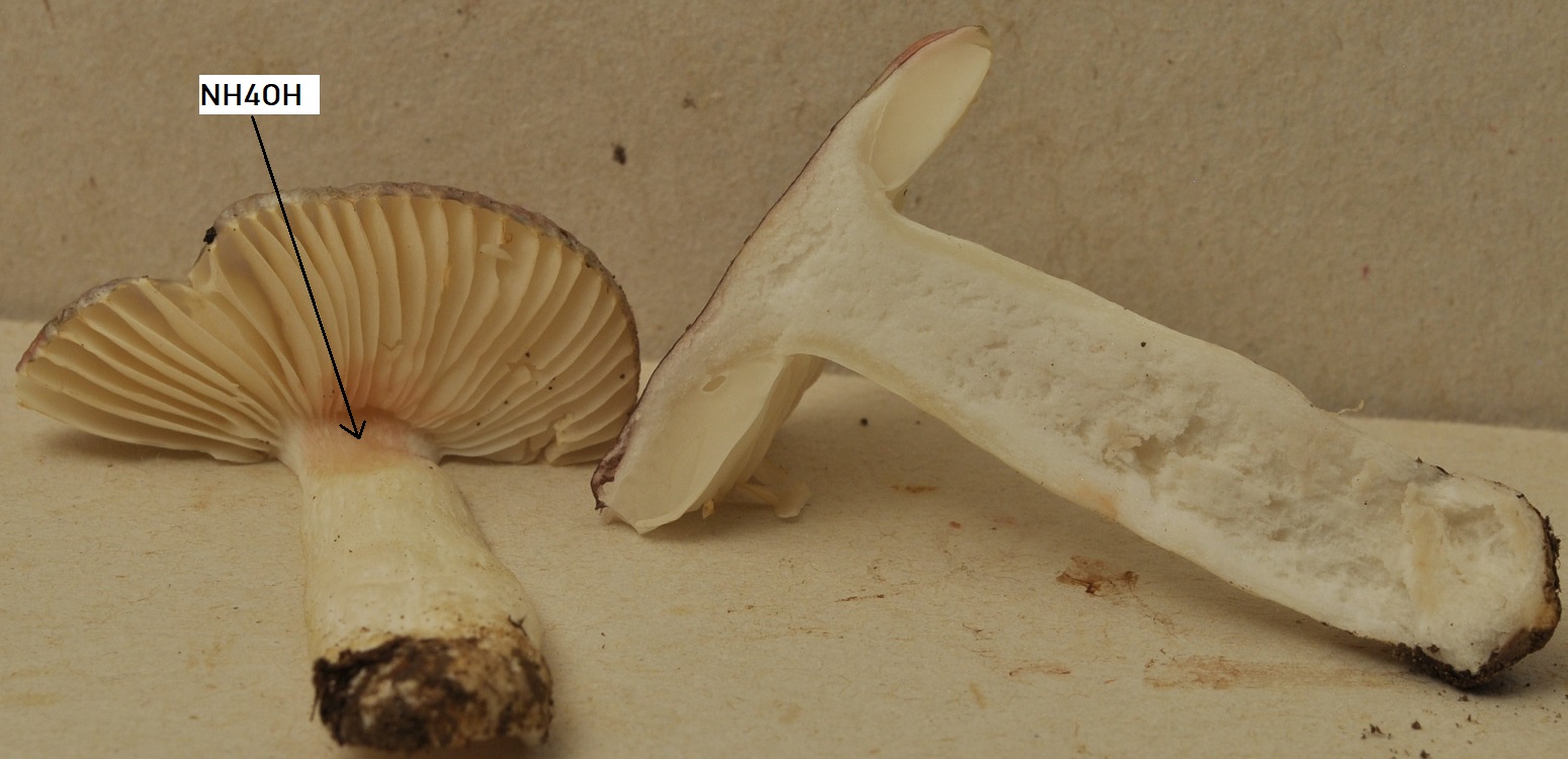 Acreté, lames espacées, jaunissement, réaction NH4OH rose, Gaiac S0 sont des éléments positifs essentiels en faveur de R.cavipes.