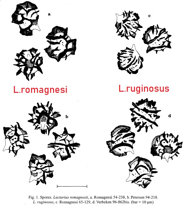 Bien caractérisée par ses magnifiques spores à ornementation type "pteros" proche de celles de L.pterosporus. L'autre catactéristique à contrôler est la douceur de la chair (au moins chair du chapeau et du stipe). La question se pose de savoir si elle représente une espèce en soit ou un simple prolongement de la russule suivante ( comme le pense Sarnari ou par exemple C.Lejeune dans un forum).