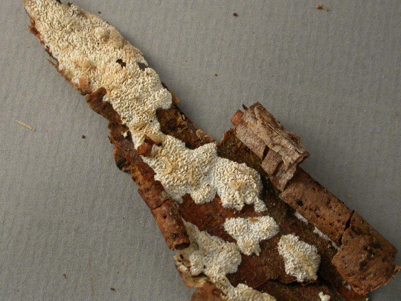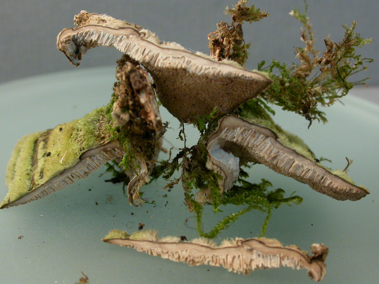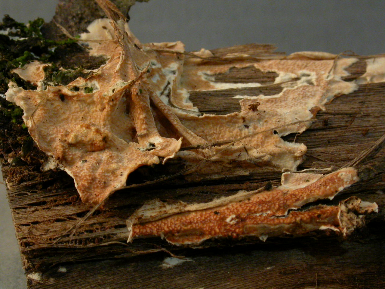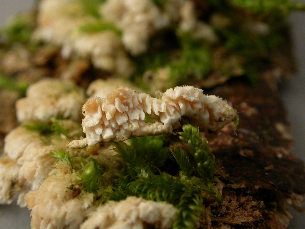 Spores: L=5.6 ± 0.4 μ, e=4.1 ± 0.4 μ Q=1.38 ± 0.10 (n=20, RCA), Apparaissait piléé, denté, suspecté Irpex lactea, en fait simplement Schizopora paradoxa, pas de vrai chapeau, simplement des poils faits d'hyphes agglomérées, sans context dessous, mais pouvant produire des spores. Dans la mousse sur un support vertical. Signalé par Rywarden et l'on trouve des récoltes proches sur le net.