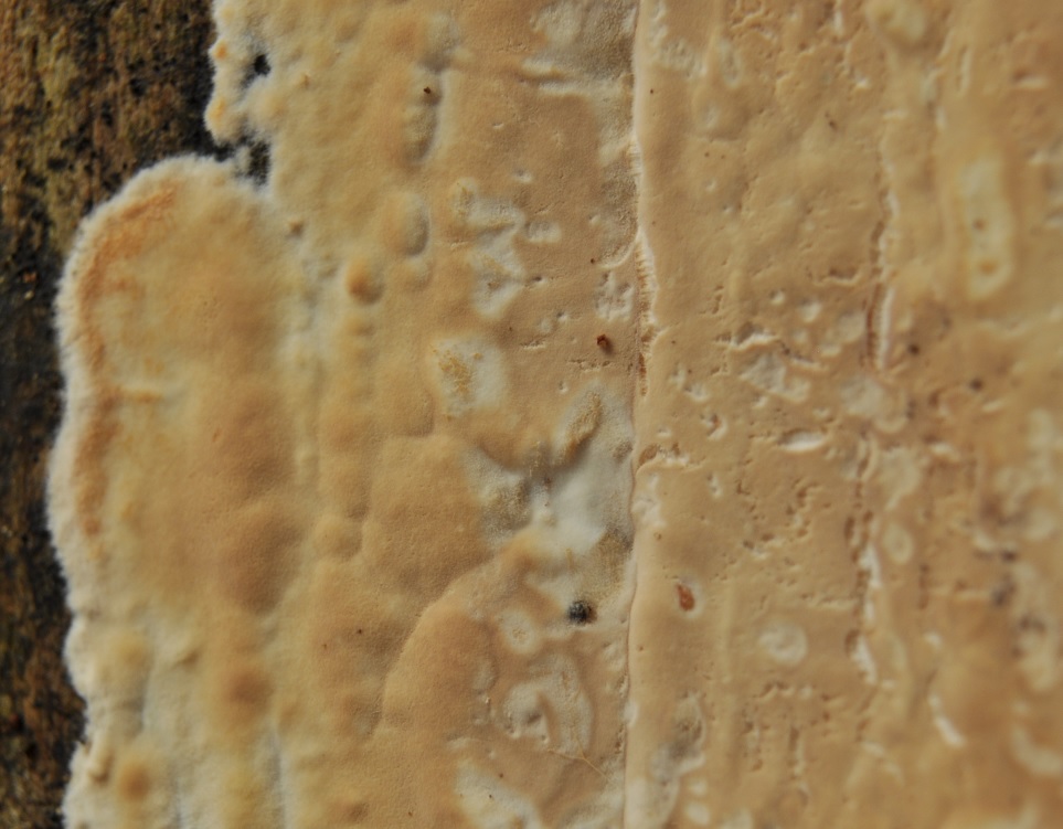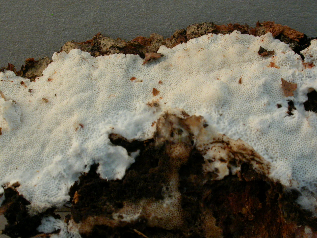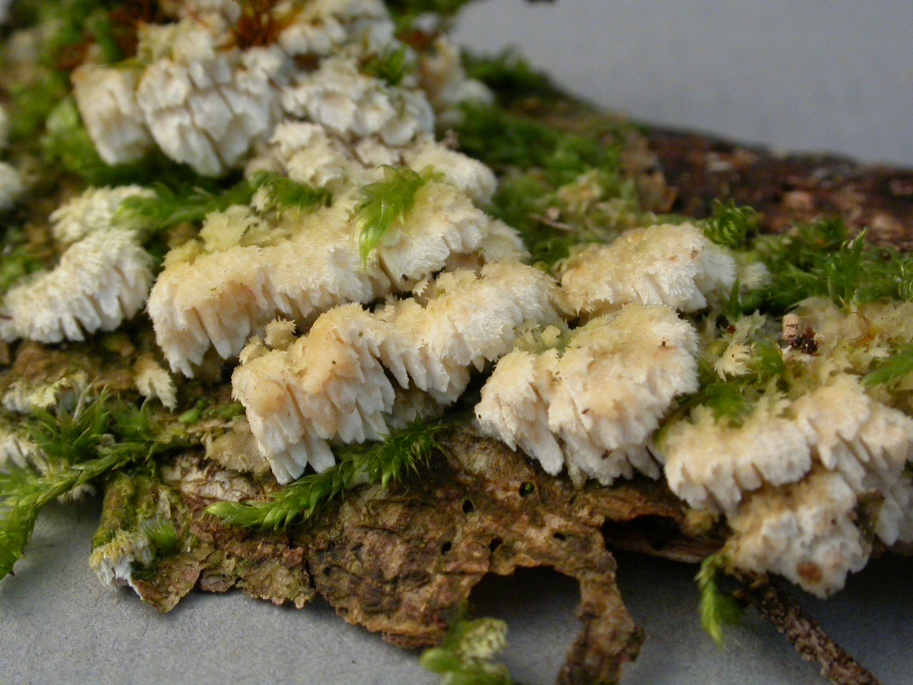 Spores: L=5.6 ± 0.4 μ, e=4.1 ± 0.4 μ Q=1.38 ± 0.10 (n=20, RCA), Apparaissait piléé, denté, suspecté Irpex lactea, en fait simplement Schizopora paradoxa, pas de vrai chapeau, simplement des poils faits d'hyphes agglomérées, sans context dessous, mais pouvant produire des spores. Dans la mousse sur un support vertical. Signalé par Rywarden et l'on trouve des récoltes proches sur le net.