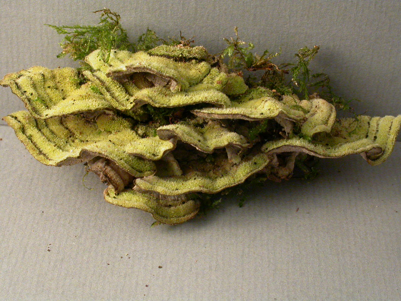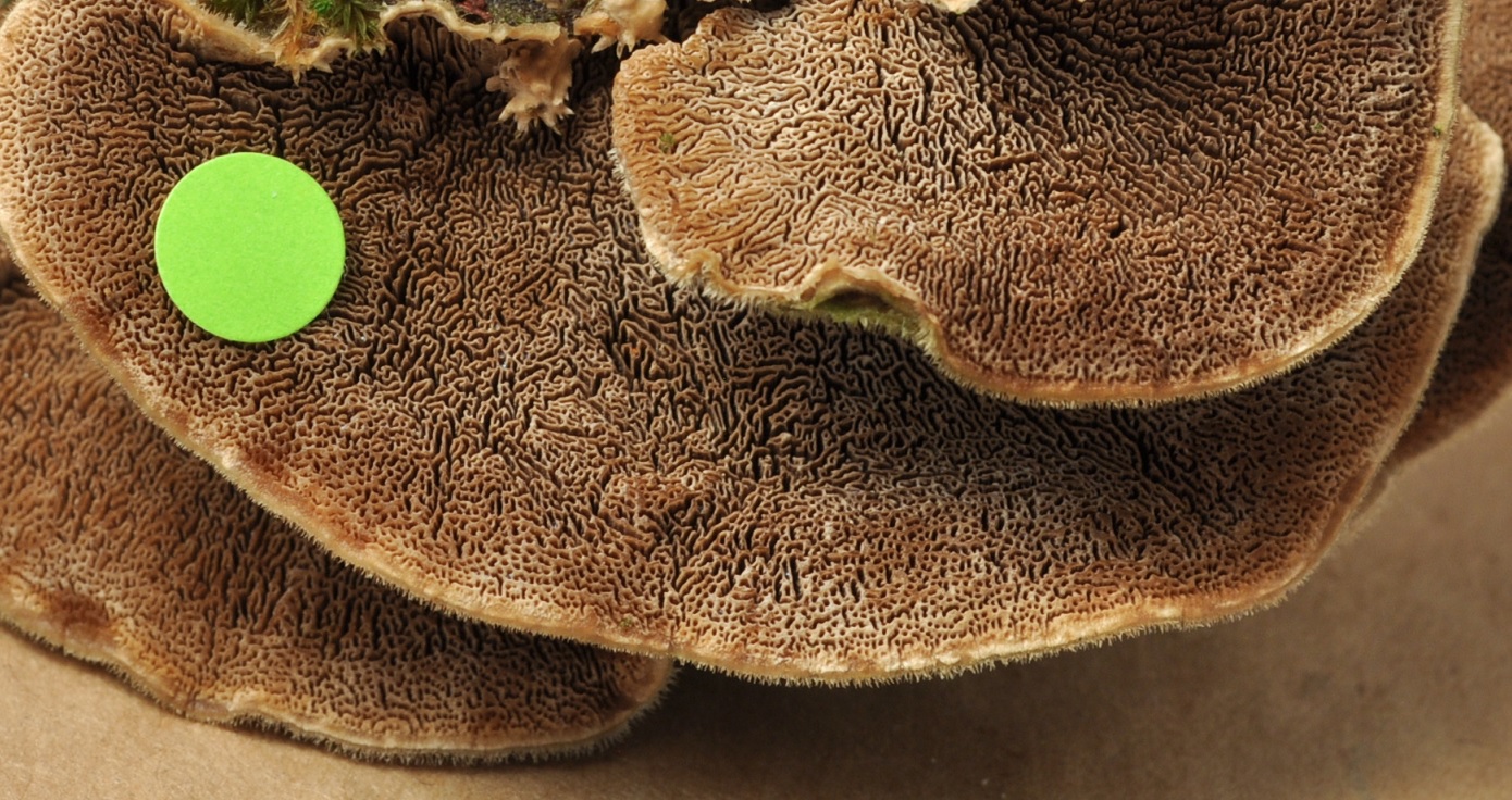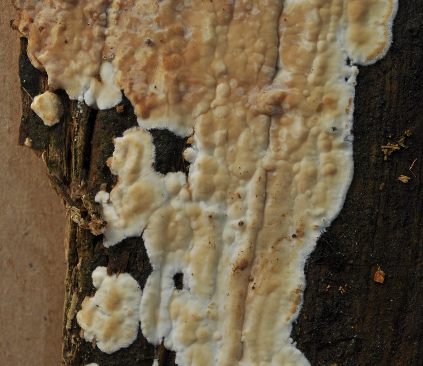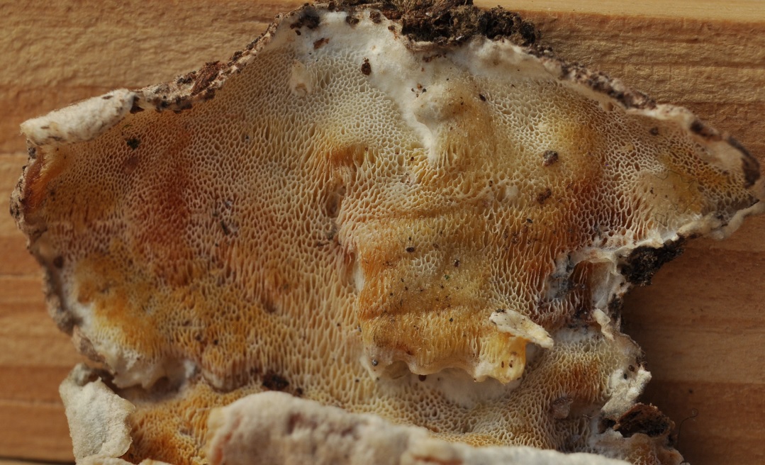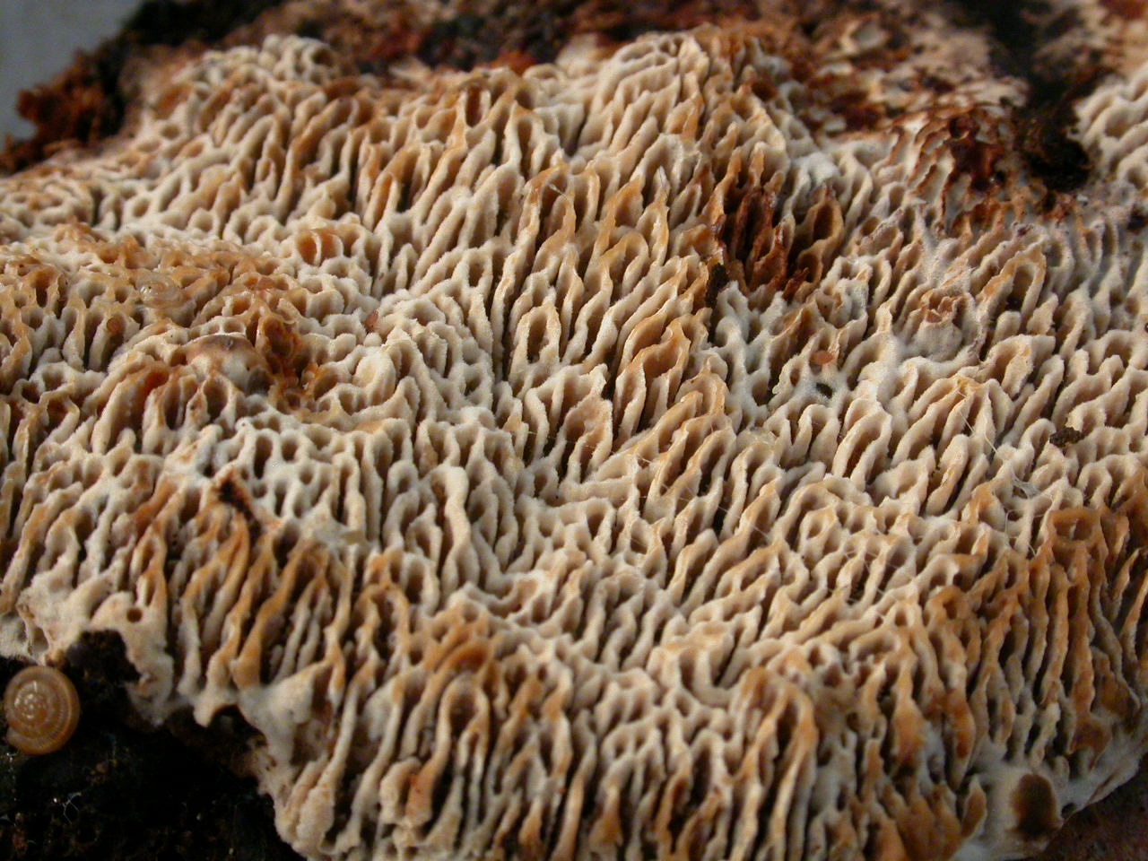 Spores: L=5.6 ± 0.4 μ, e=4.1 ± 0.4 μ Q=1.38 ± 0.10 (n=20, RCA), Apparaissait piléé, denté, suspecté Irpex lactea, en fait simplement Schizopora paradoxa, pas de vrai chapeau, simplement des poils faits d'hyphes agglomérées, sans context dessous, mais pouvant produire des spores. Dans la mousse sur un support vertical. Signalé par Rywarden et l'on trouve des récoltes proches sur le net.