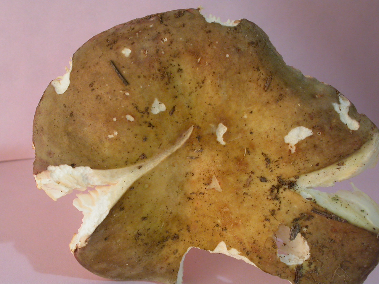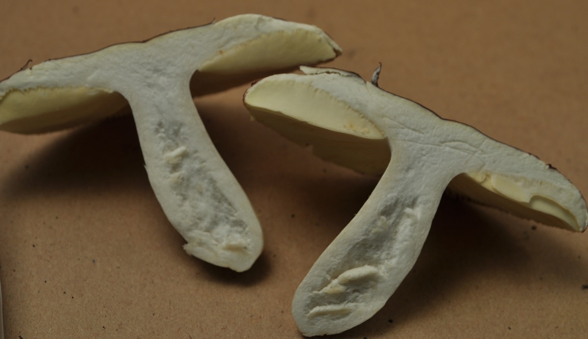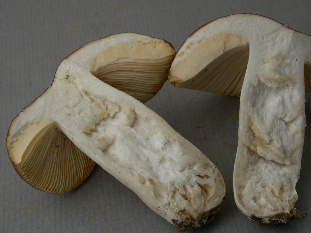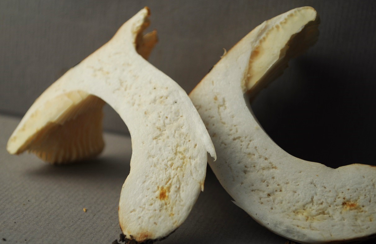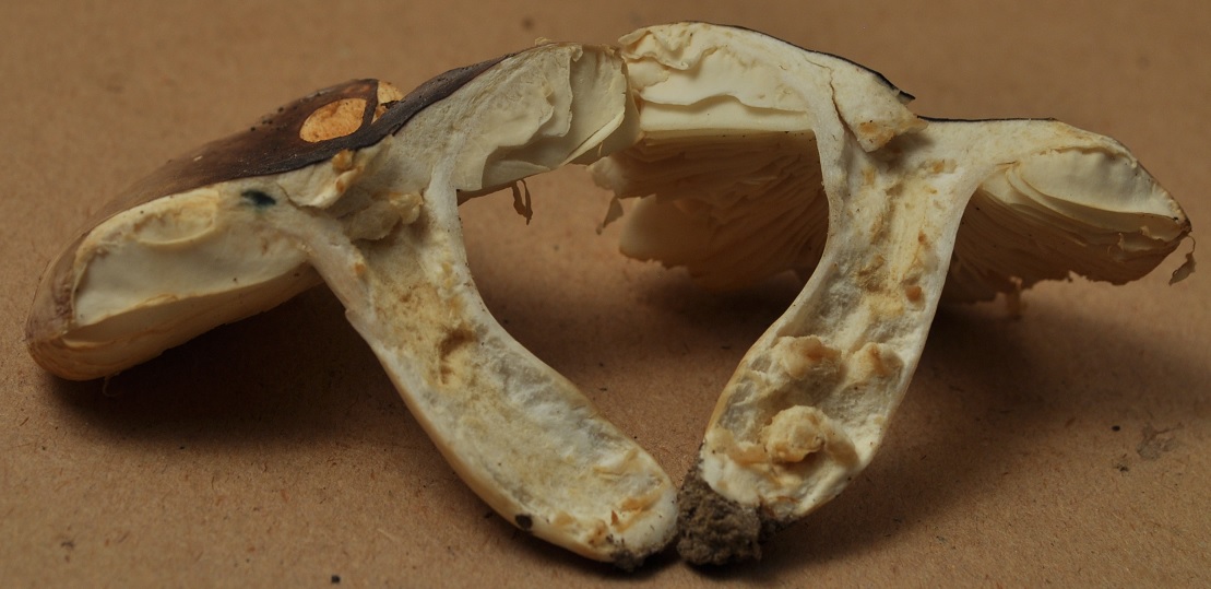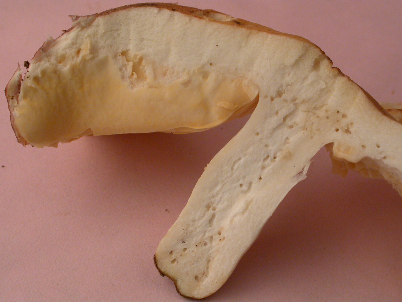 zoom, CD8-6 33. Gros exemplaires (~ 20 cm) observés sur site. Spores non lisses observées dans l'eau. Gléba devient jaune, subgléba reste blanche.