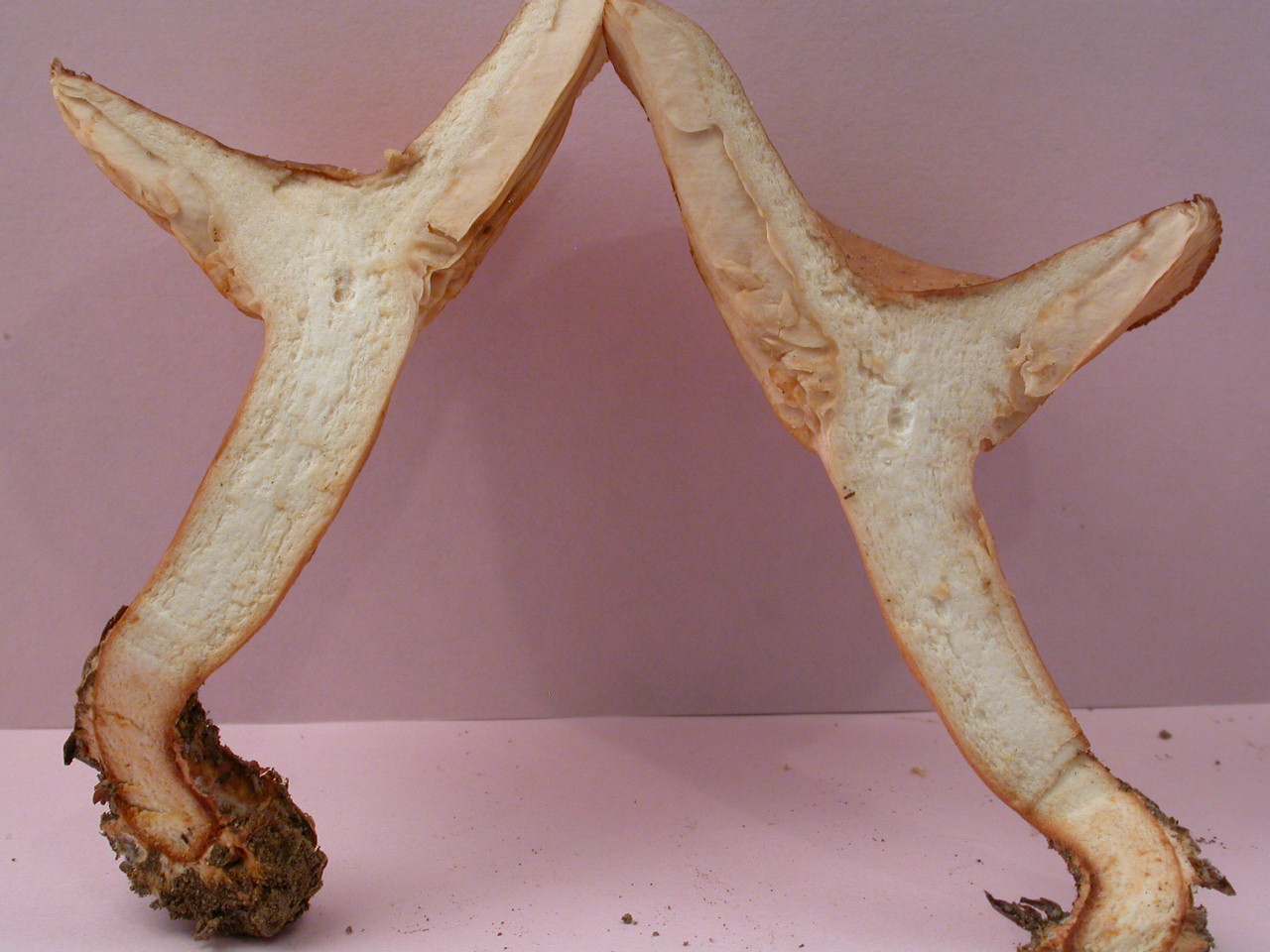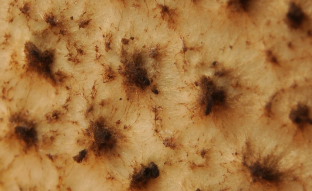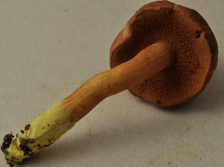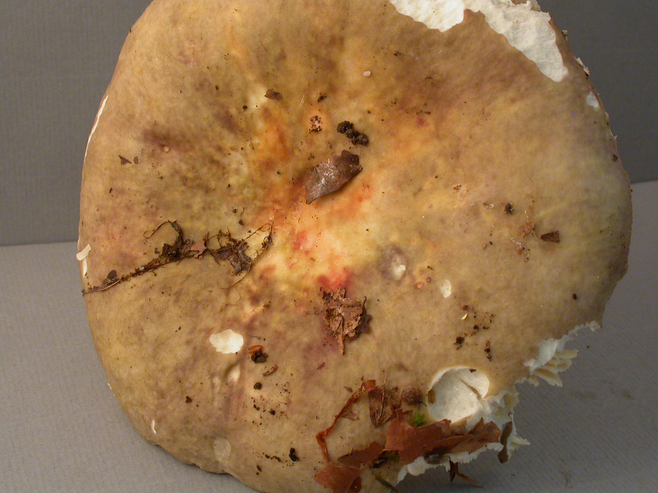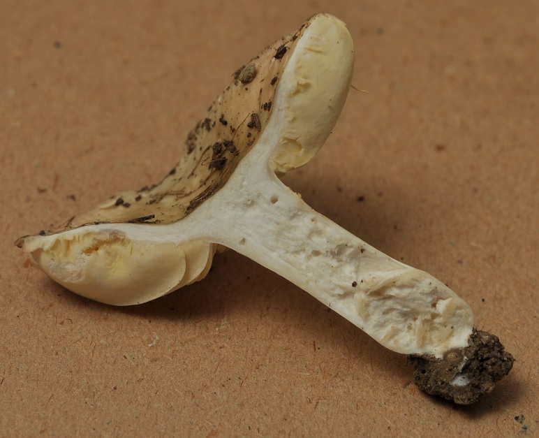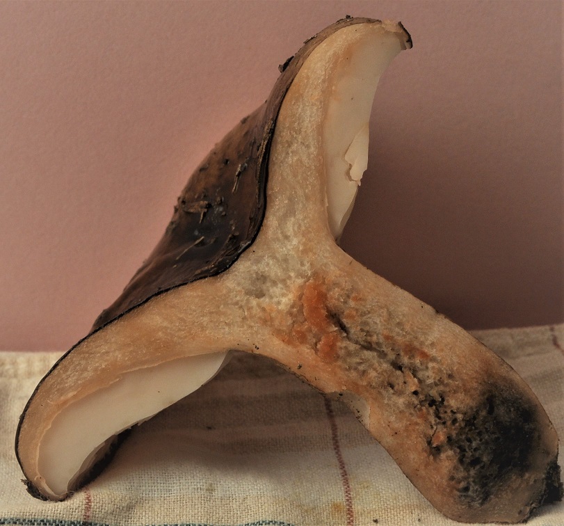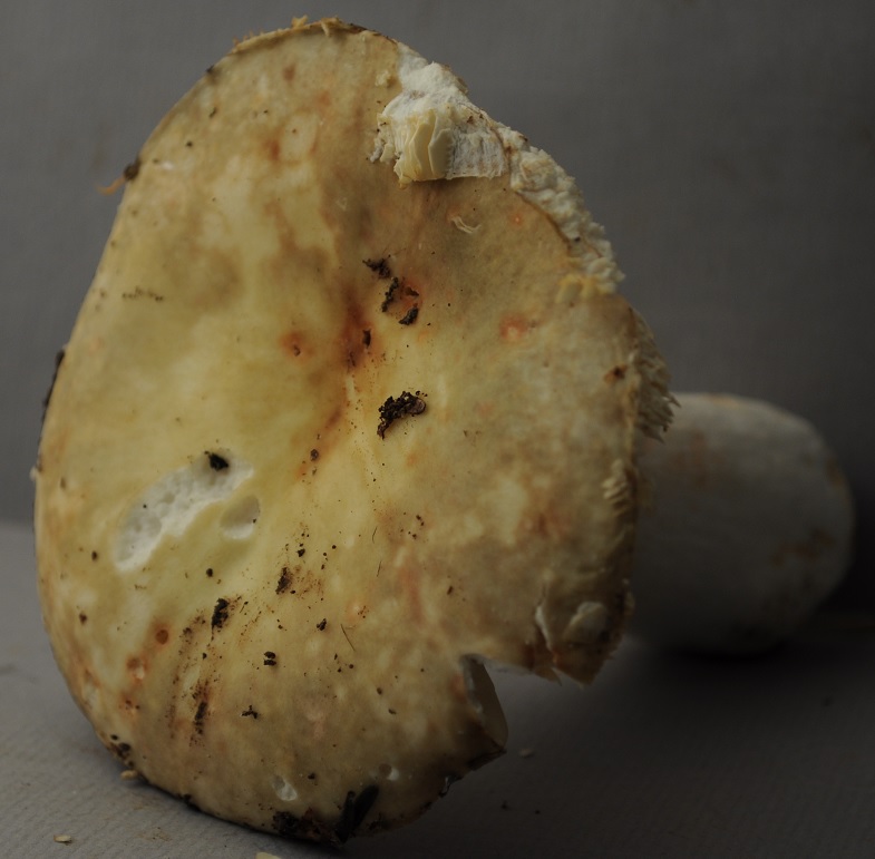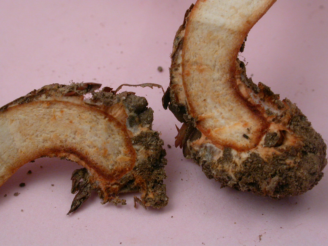 zoom, CD8-6 33. Gros exemplaires (~ 20 cm) observés sur site. Spores non lisses observées dans l'eau. Gléba devient jaune, subgléba reste blanche.