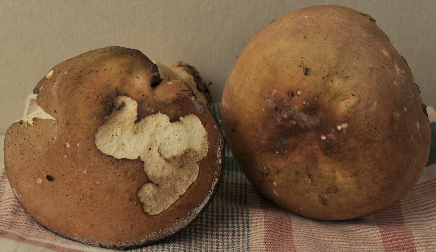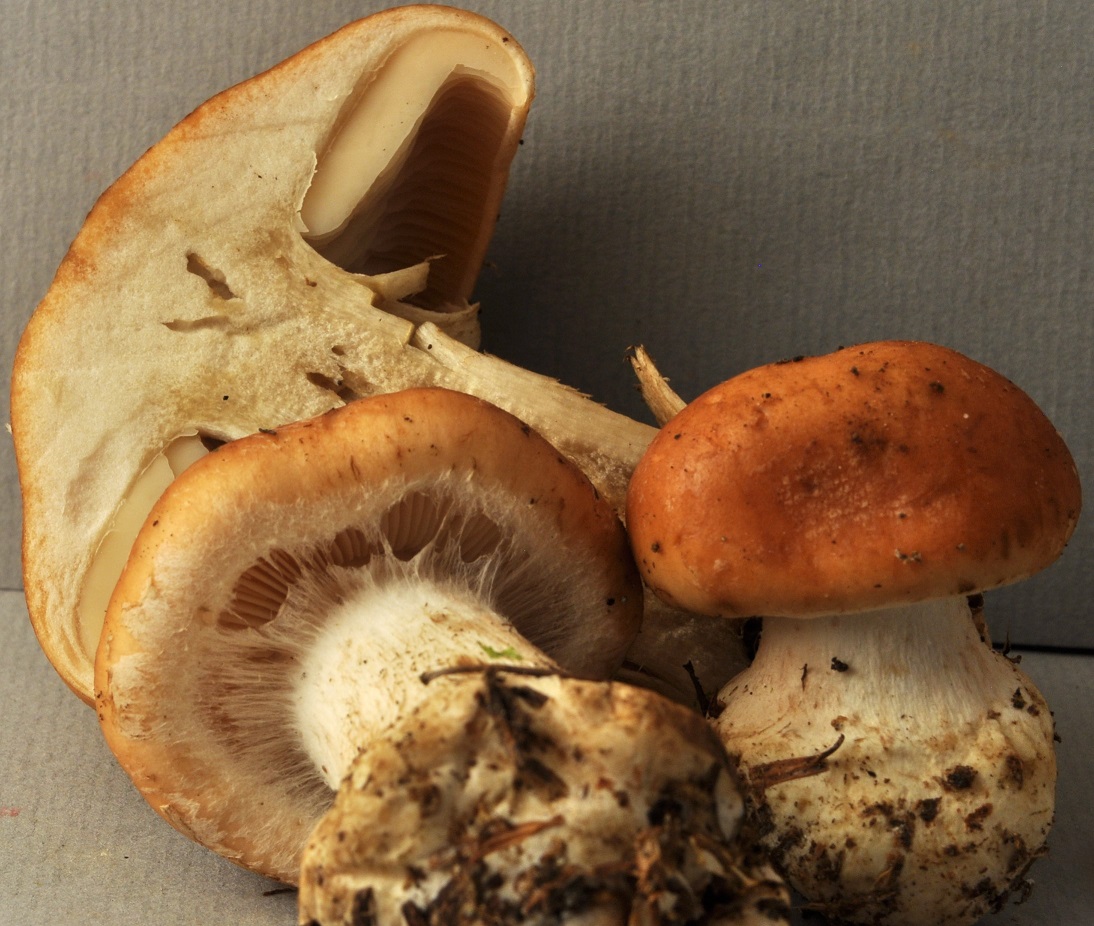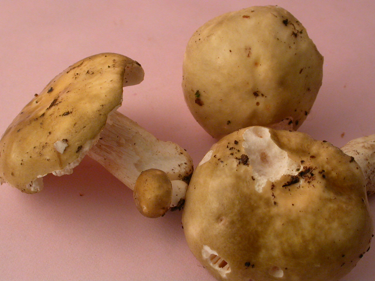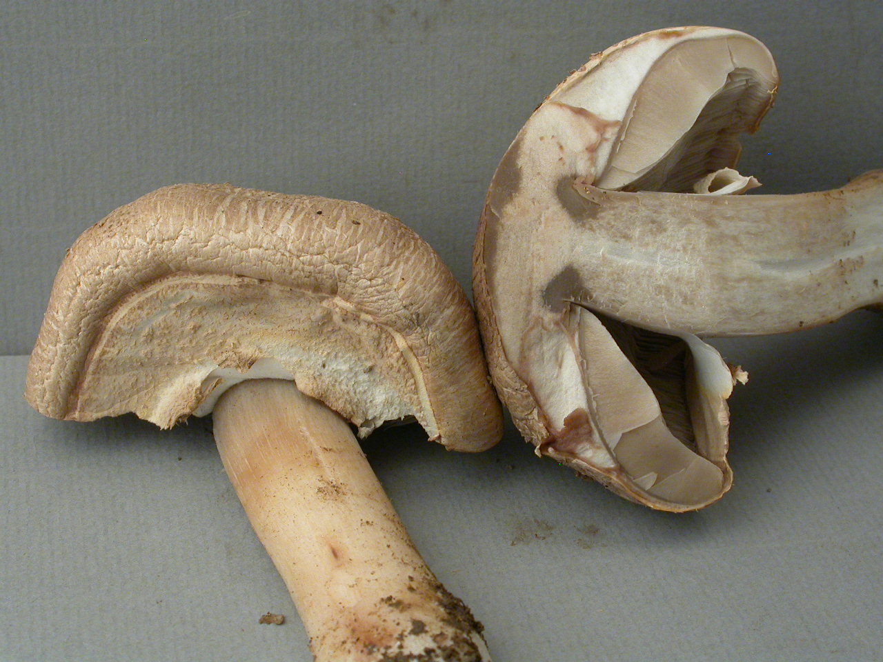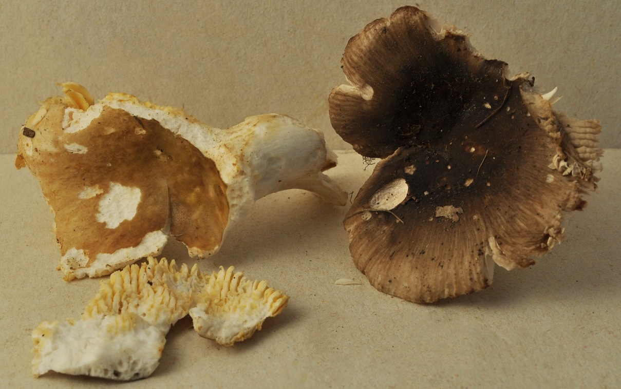 zoom, CD8-6 33. Gros exemplaires (~ 20 cm) observés sur site. Spores non lisses observées dans l'eau. Gléba devient jaune, subgléba reste blanche.