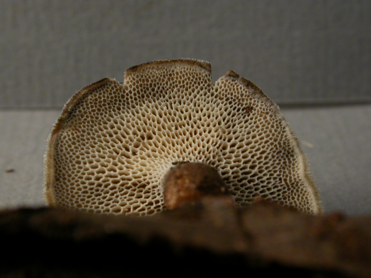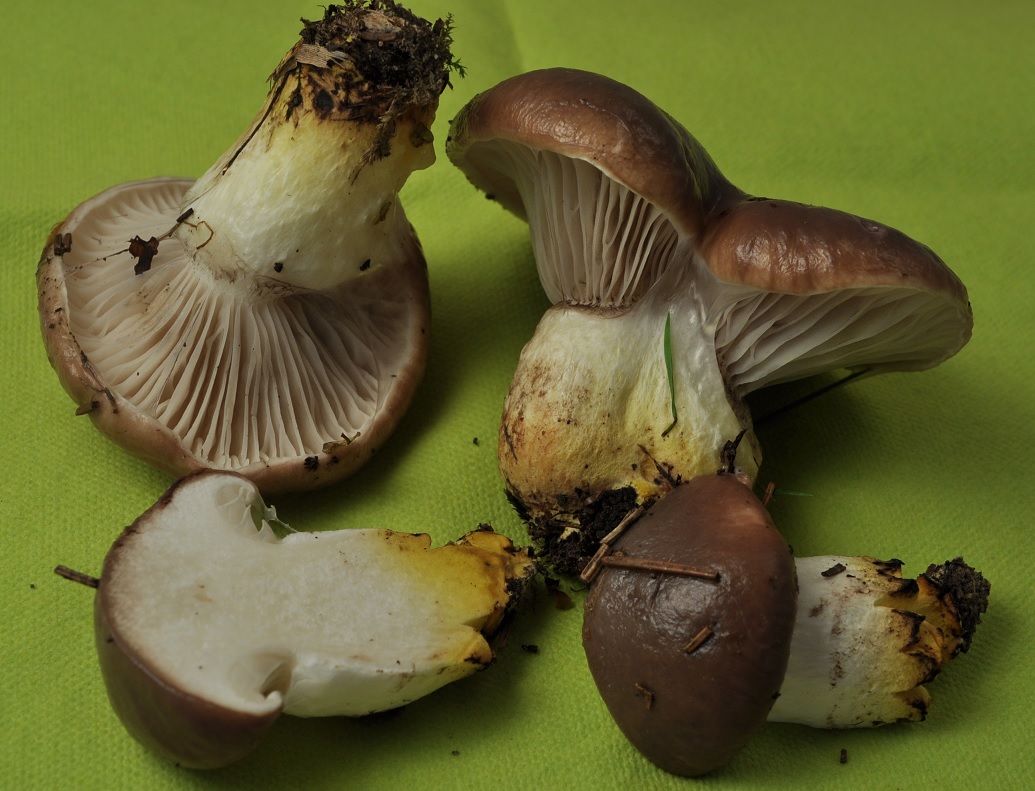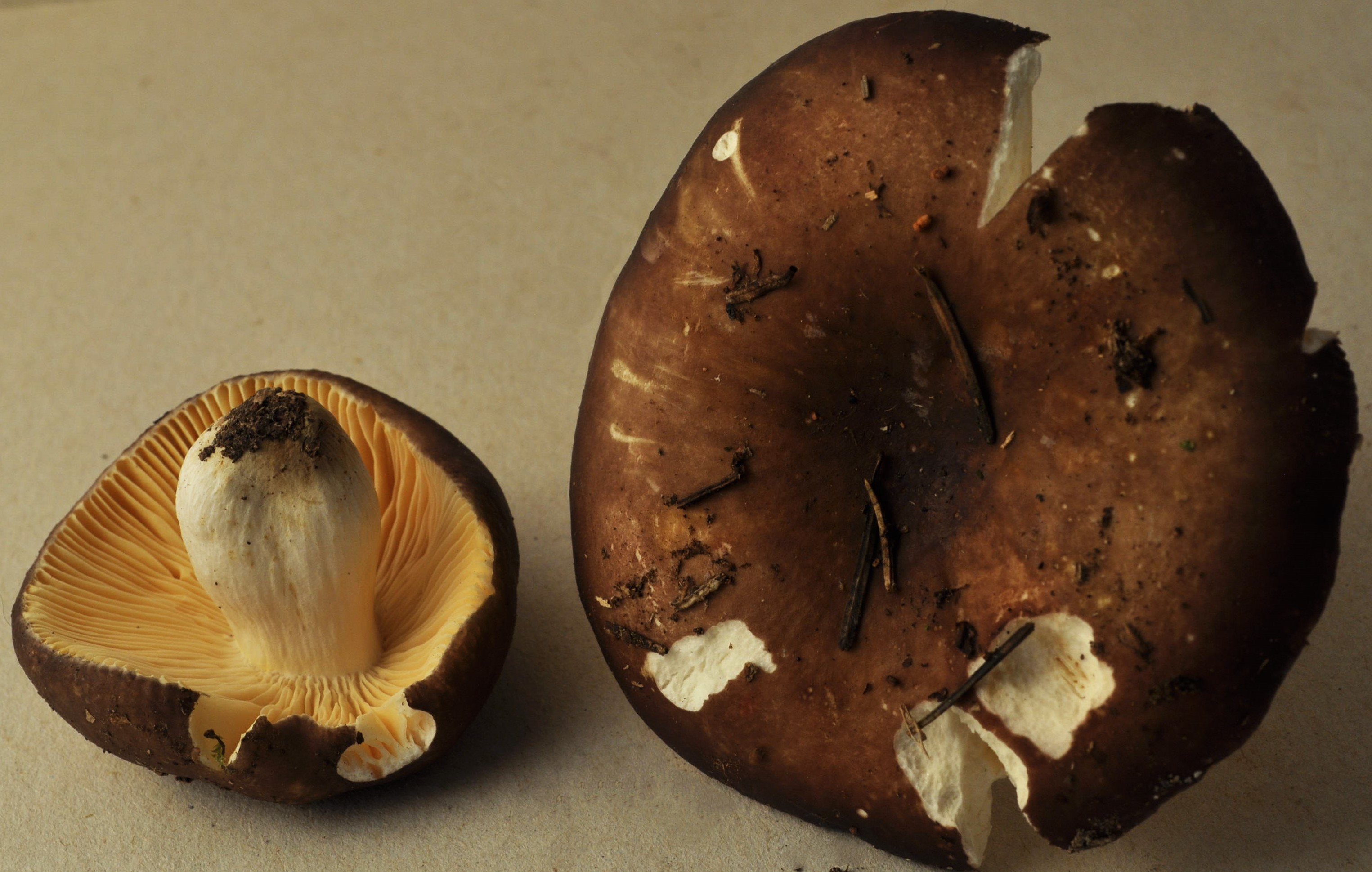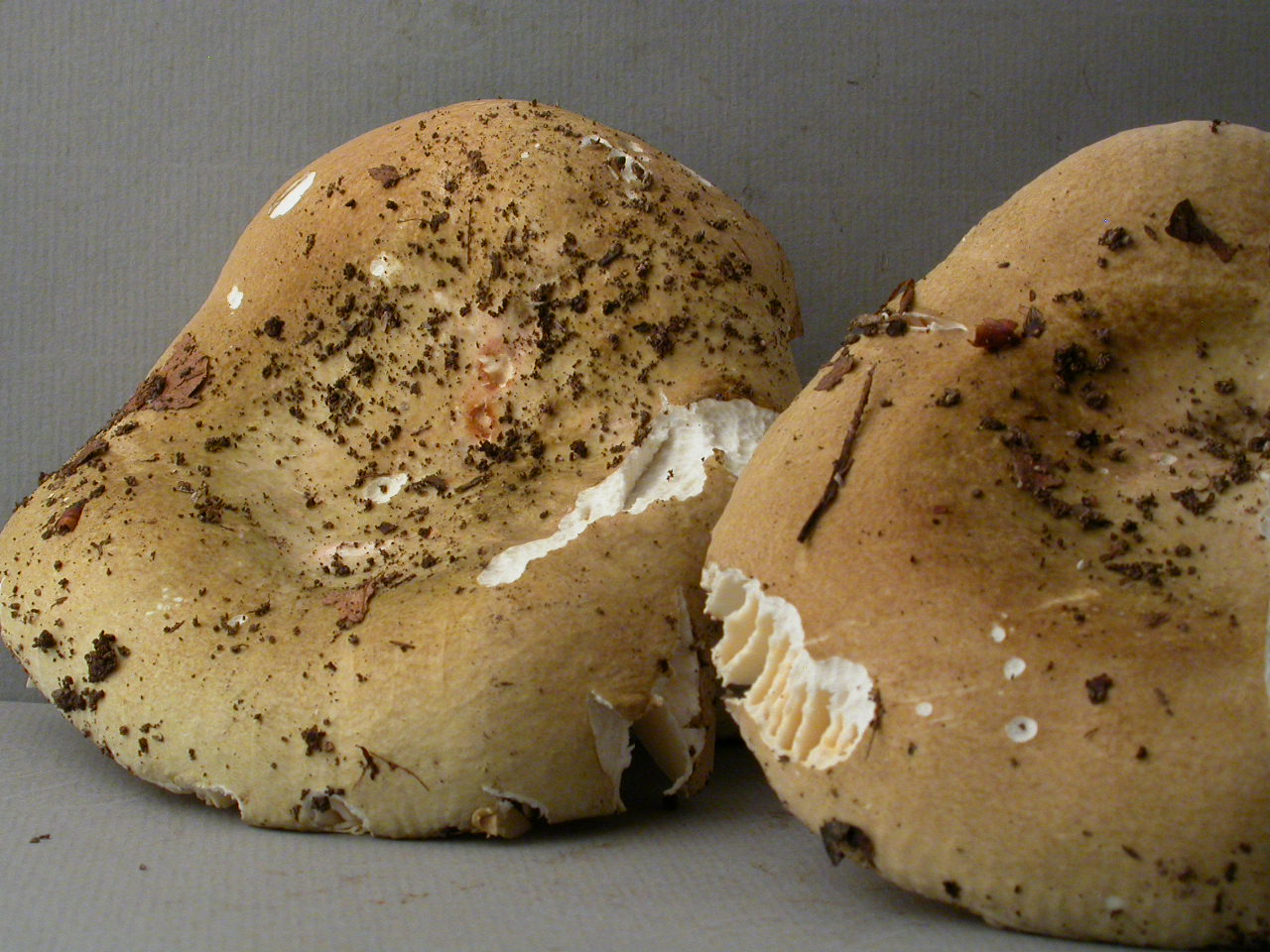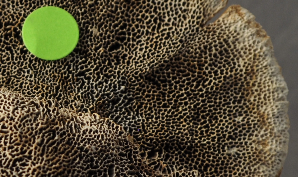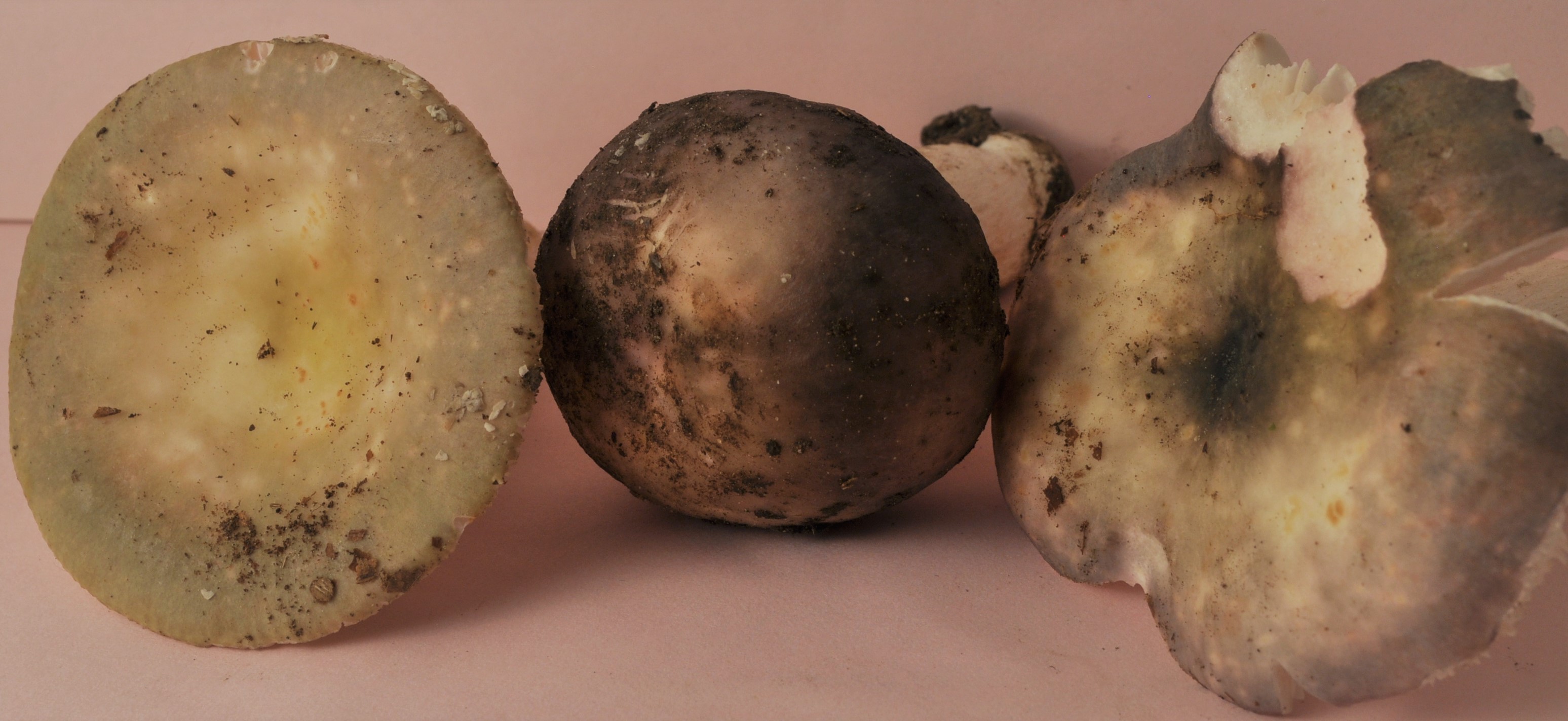 zoom, CD8-6 33. Gros exemplaires (~ 20 cm) observés sur site. Spores non lisses observées dans l'eau. Gléba devient jaune, subgléba reste blanche.
