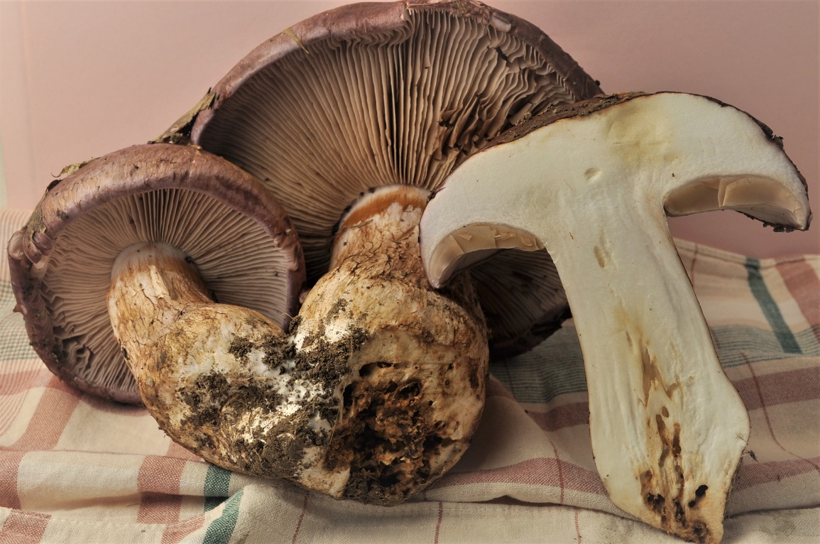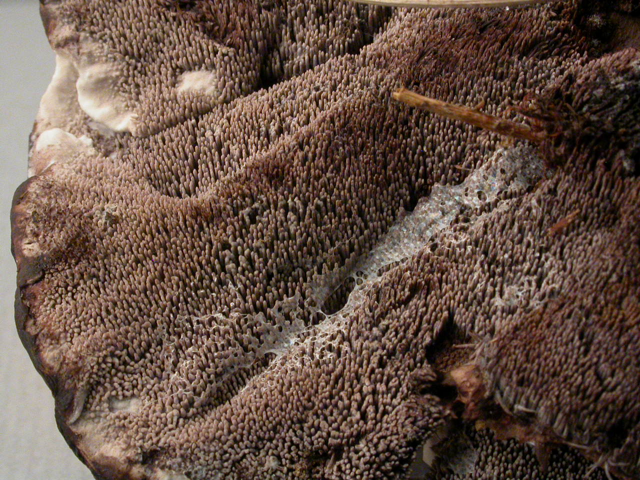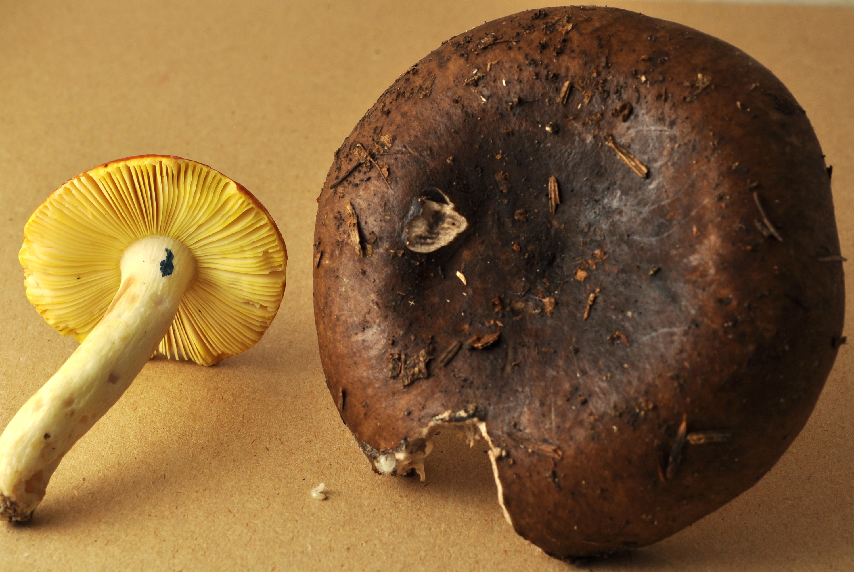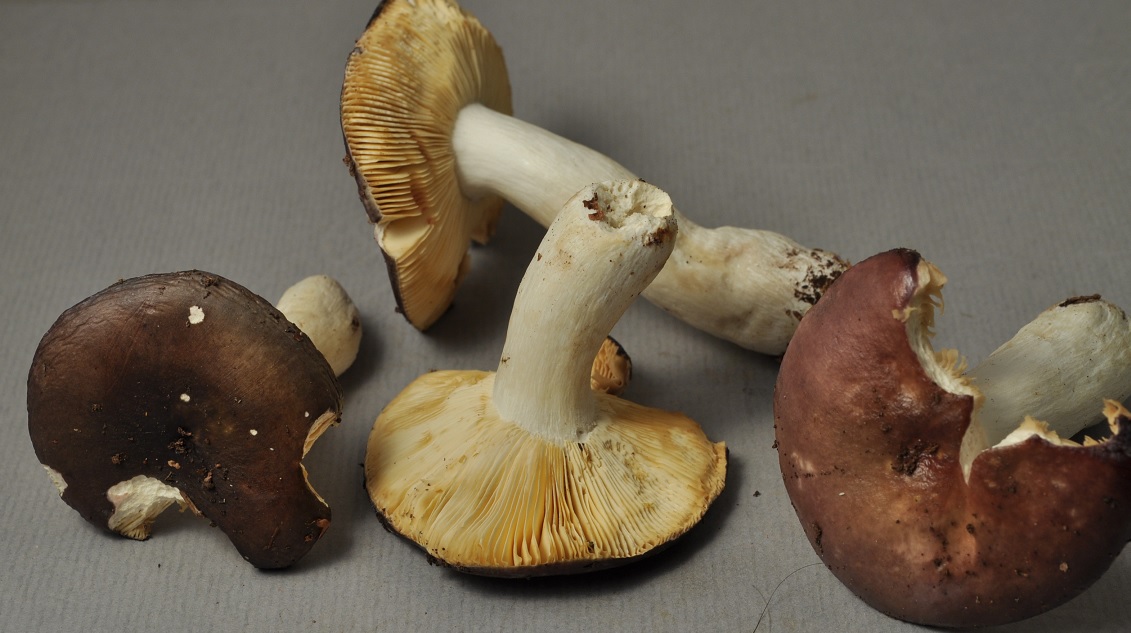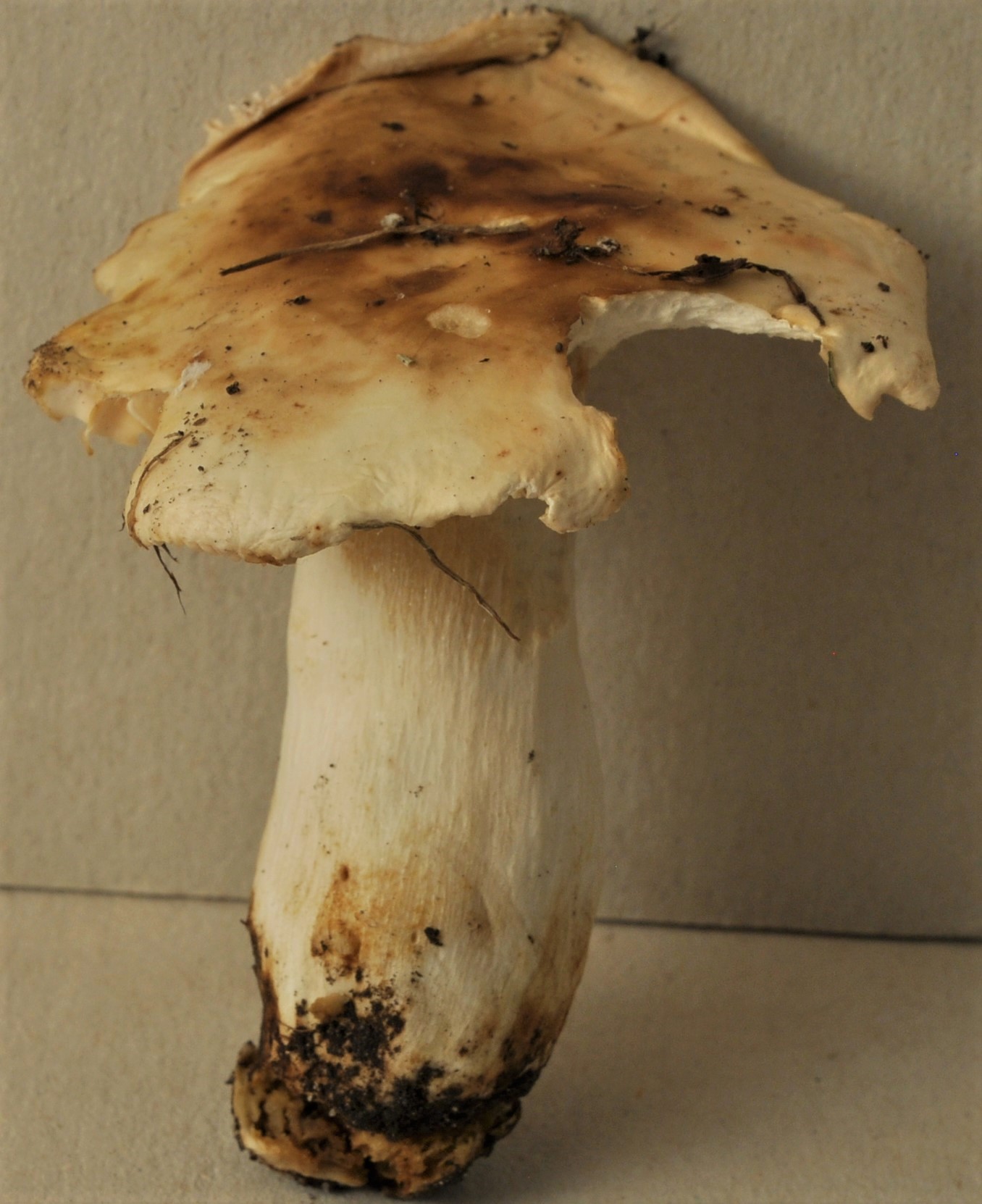 zoom, CD8-6 33. Gros exemplaires (~ 20 cm) observés sur site. Spores non lisses observées dans l'eau. Gléba devient jaune, subgléba reste blanche.