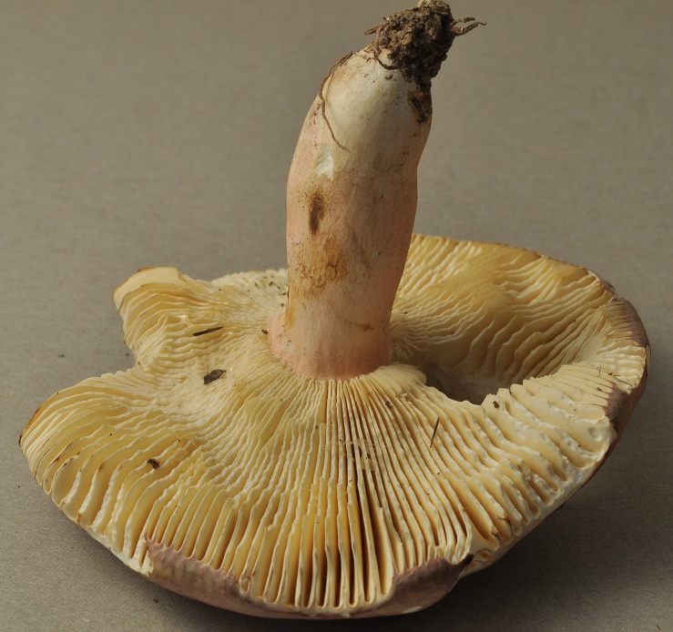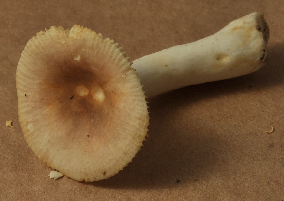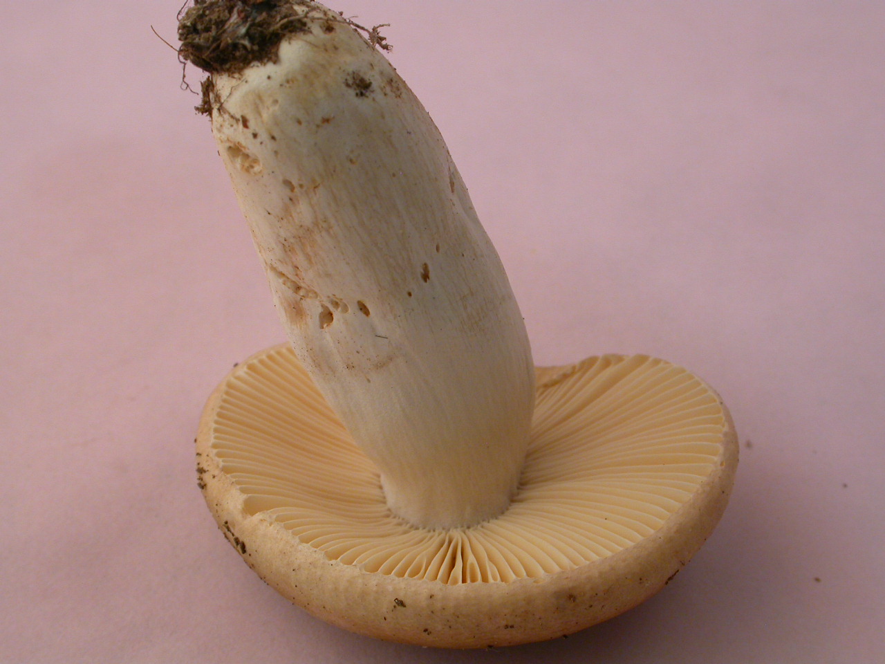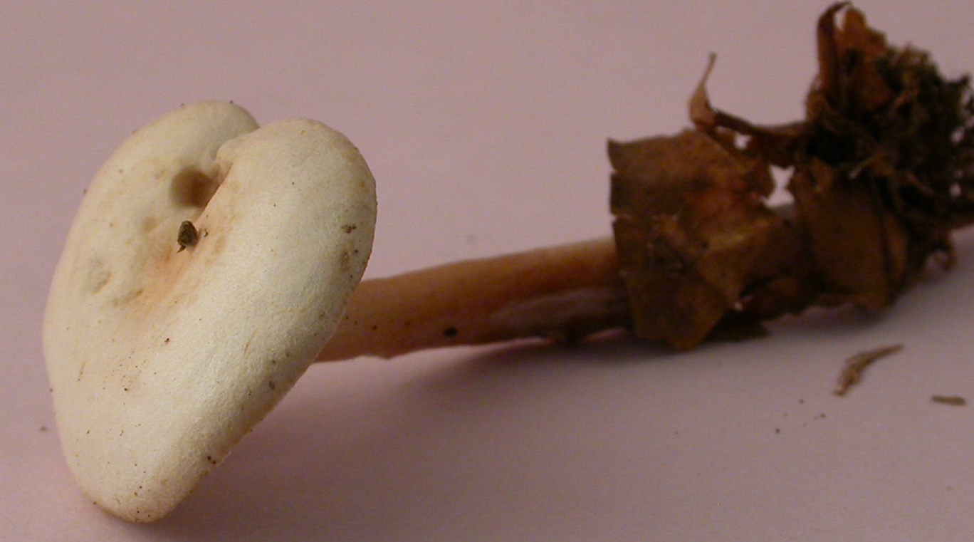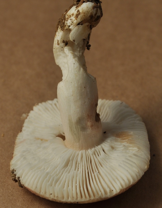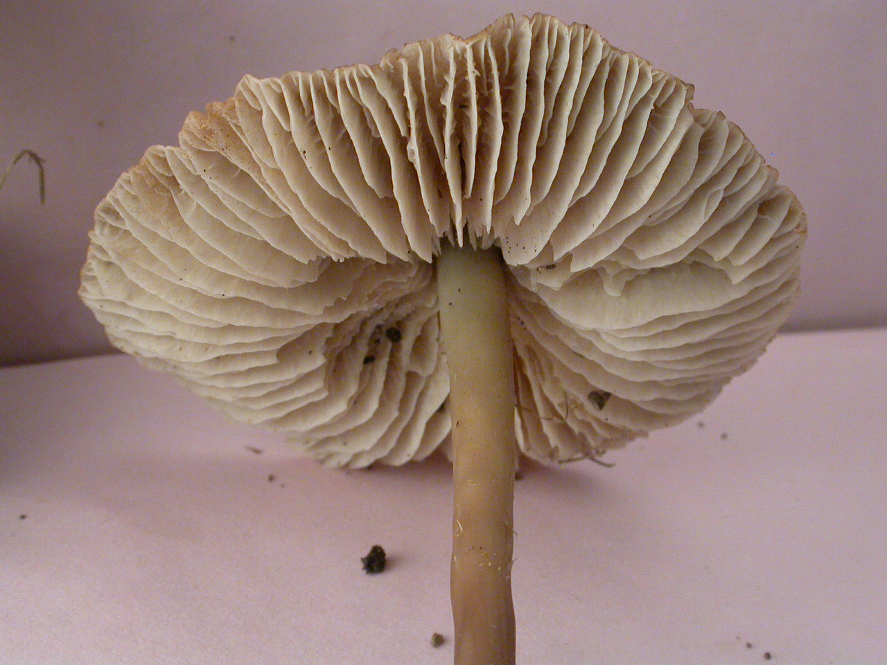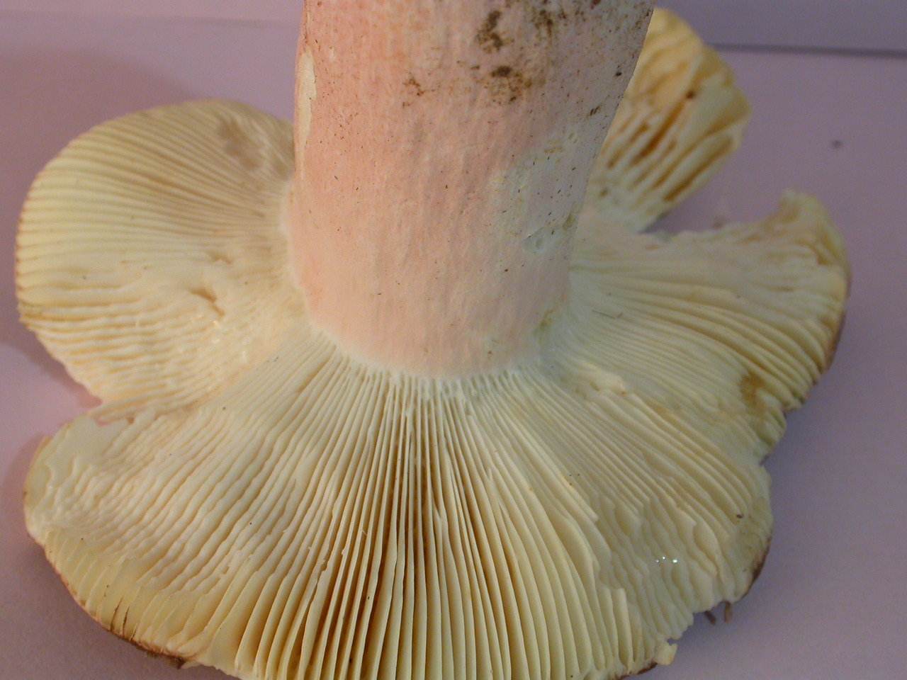 dessous, CD8-F11 3/4. Chapeau rose jambon, marge courtement et légèrement cannelée. Stipe blanc, dur, pointu-recourbé en bas. Lames crèmes (Rom-267 OK), régulières, en U, 8-9 au bord, épaisses, fourchues (à partir de R/2), non anastomosées.