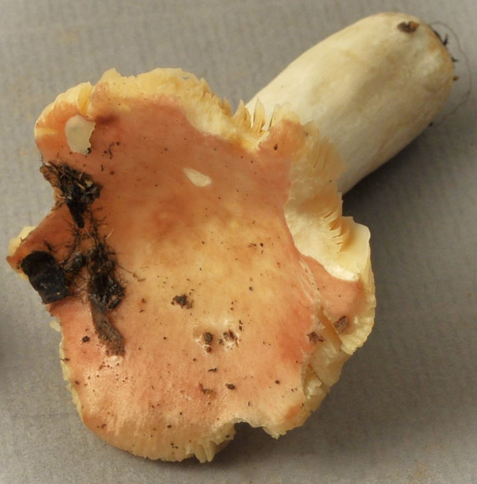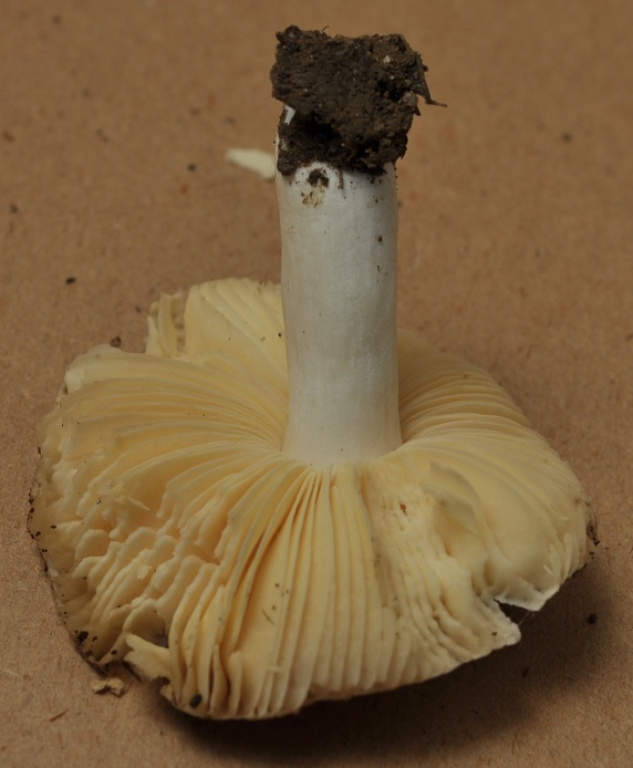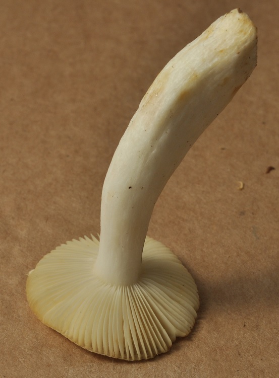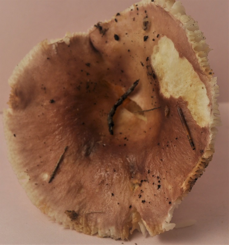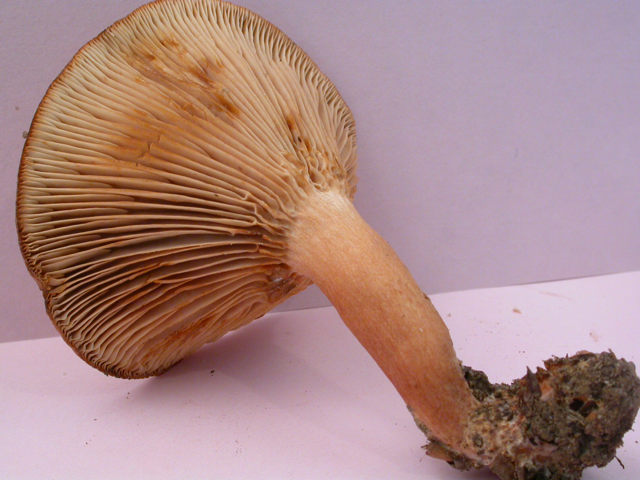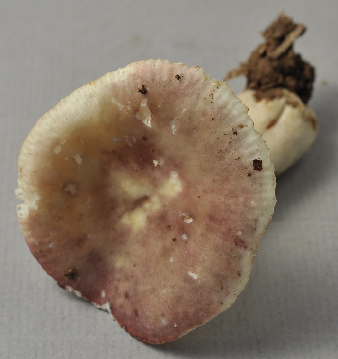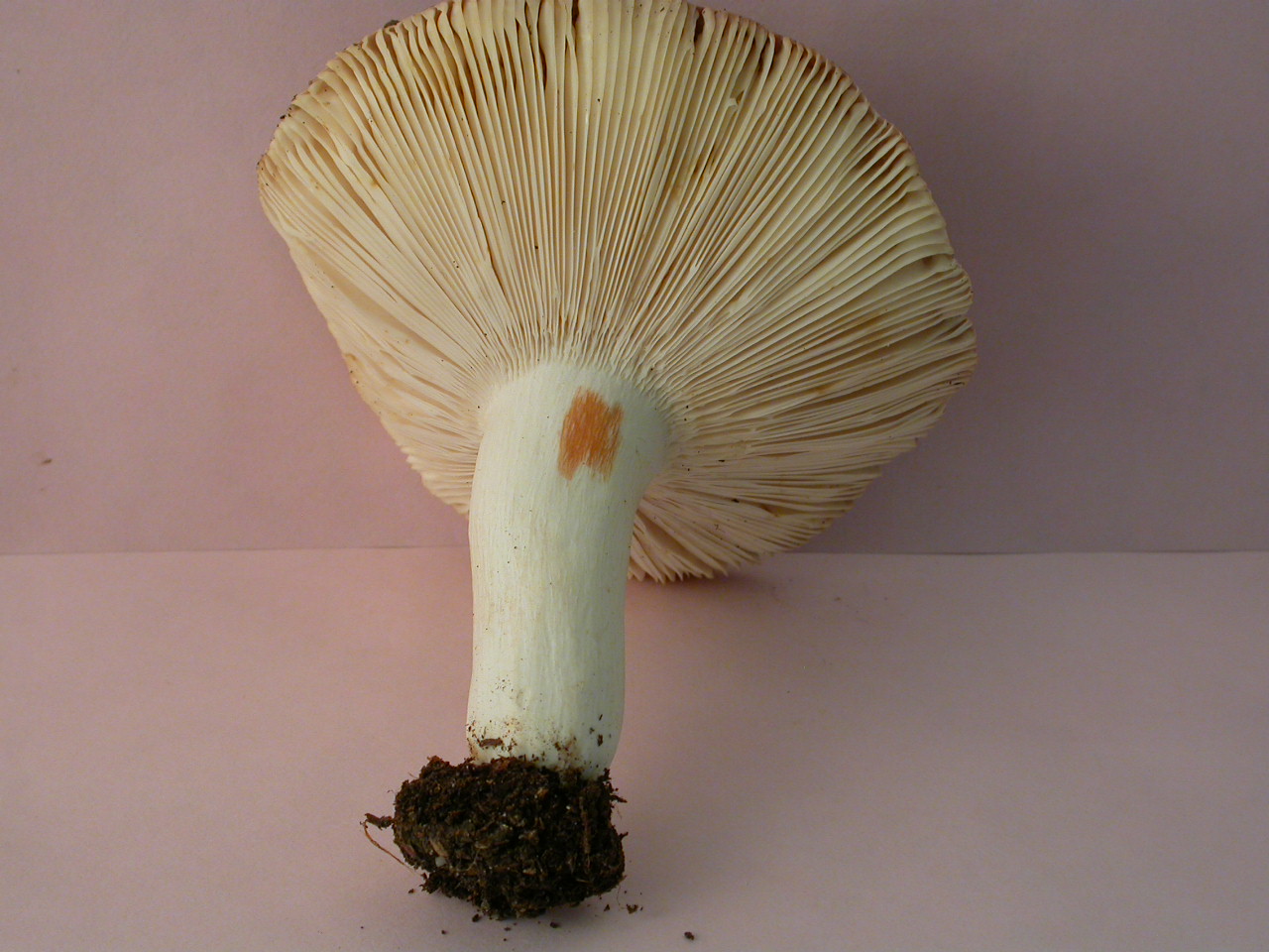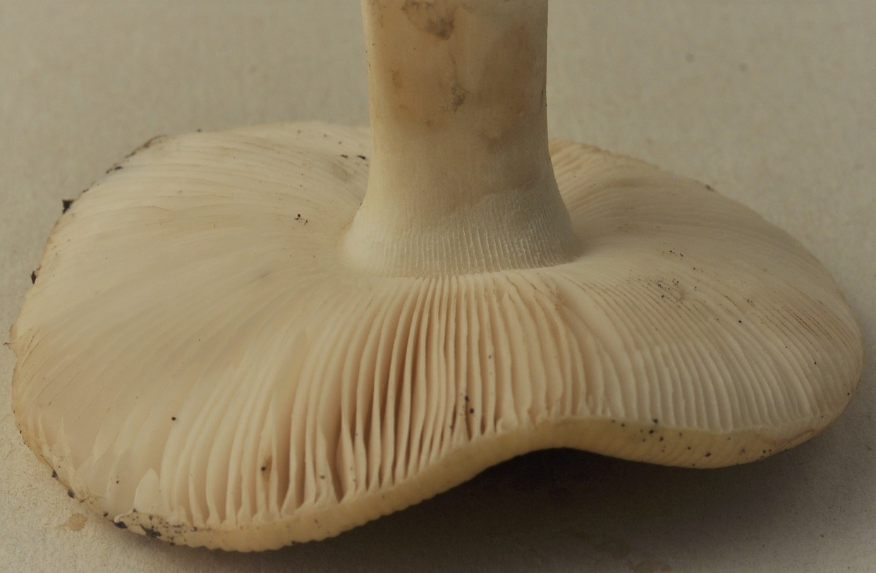 dessous, CD8-F11 3/4. Chapeau rose jambon, marge courtement et légèrement cannelée. Stipe blanc, dur, pointu-recourbé en bas. Lames crèmes (Rom-267 OK), régulières, en U, 8-9 au bord, épaisses, fourchues (à partir de R/2), non anastomosées.