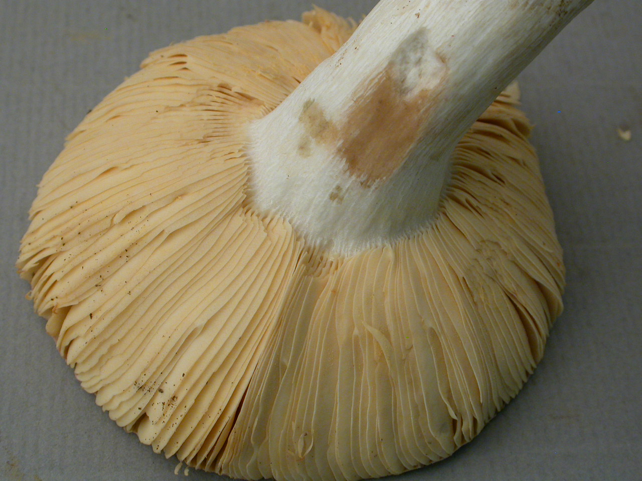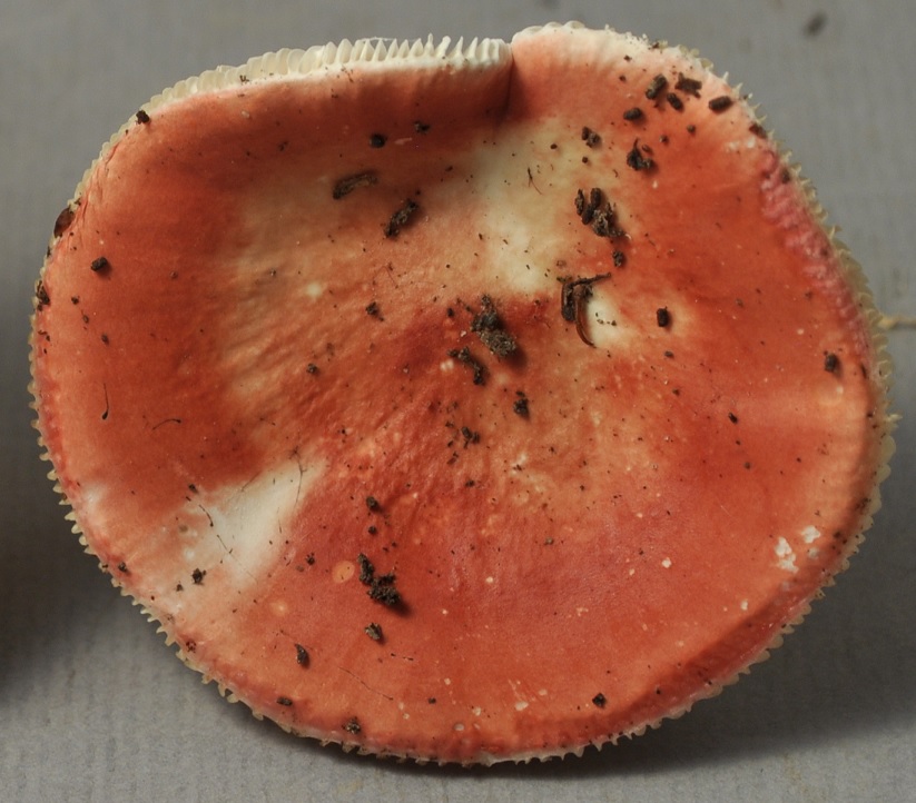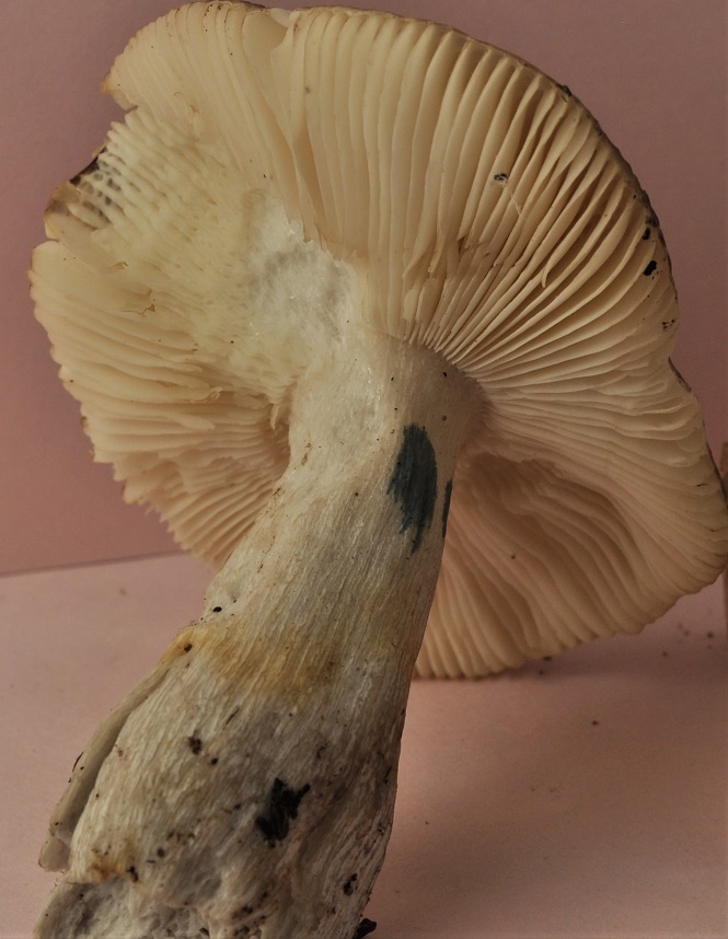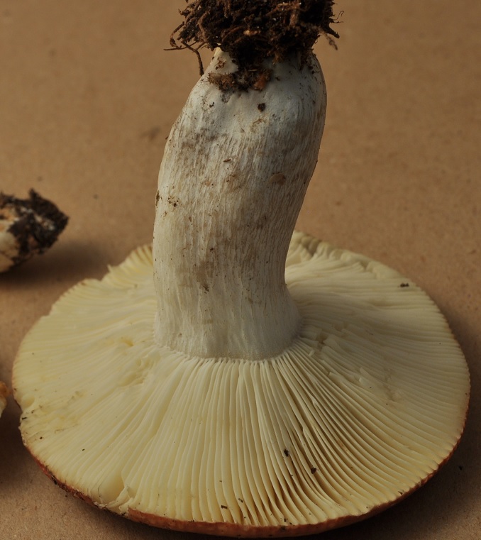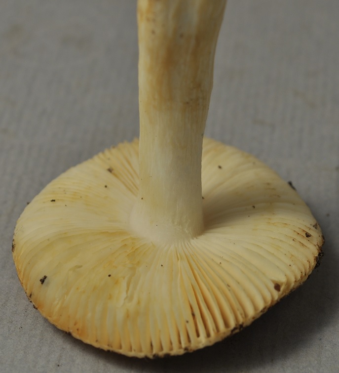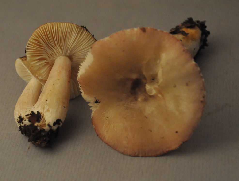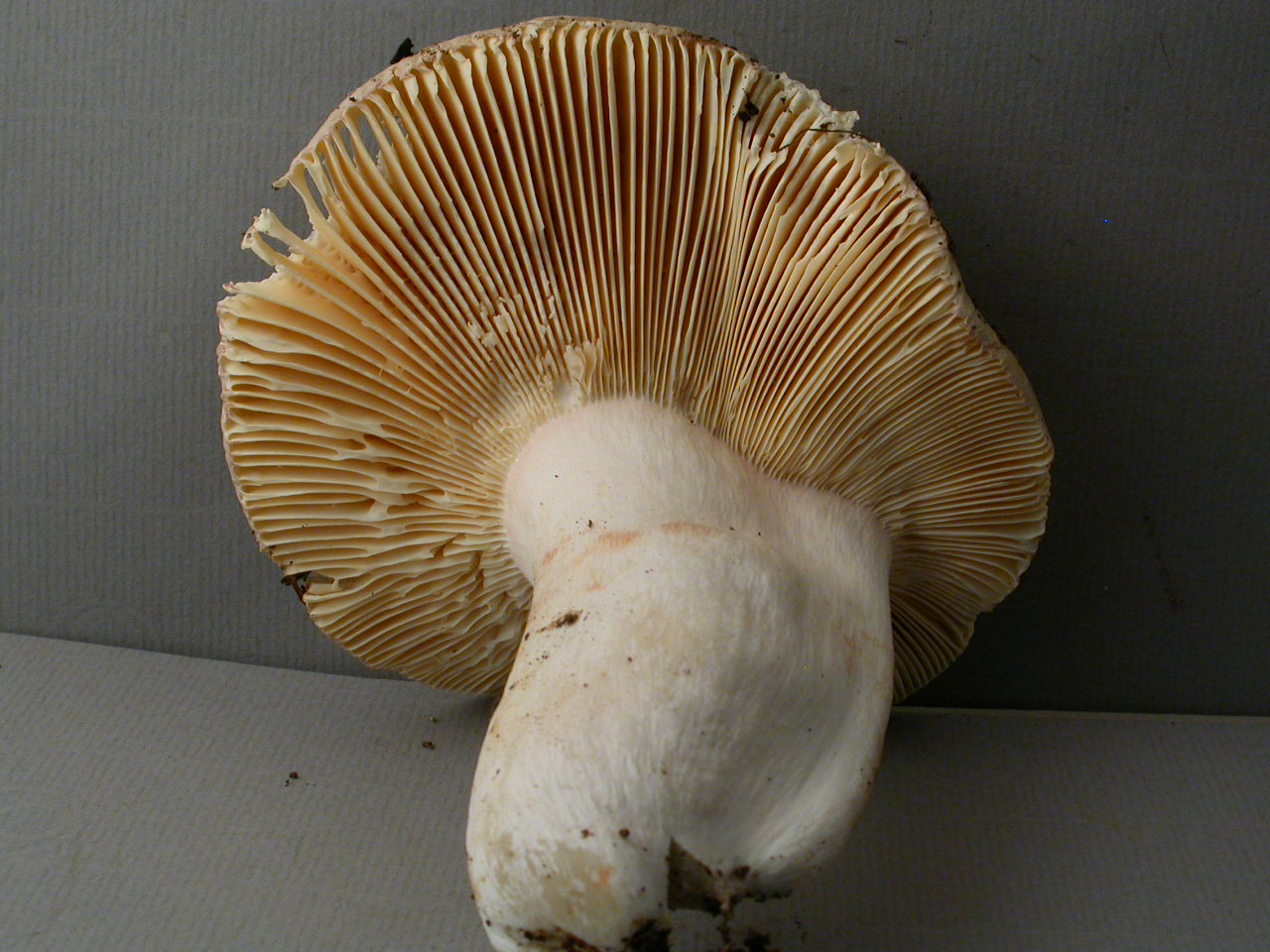 dessous, CD8-F11 3/4. Chapeau rose jambon, marge courtement et légèrement cannelée. Stipe blanc, dur, pointu-recourbé en bas. Lames crèmes (Rom-267 OK), régulières, en U, 8-9 au bord, épaisses, fourchues (à partir de R/2), non anastomosées.