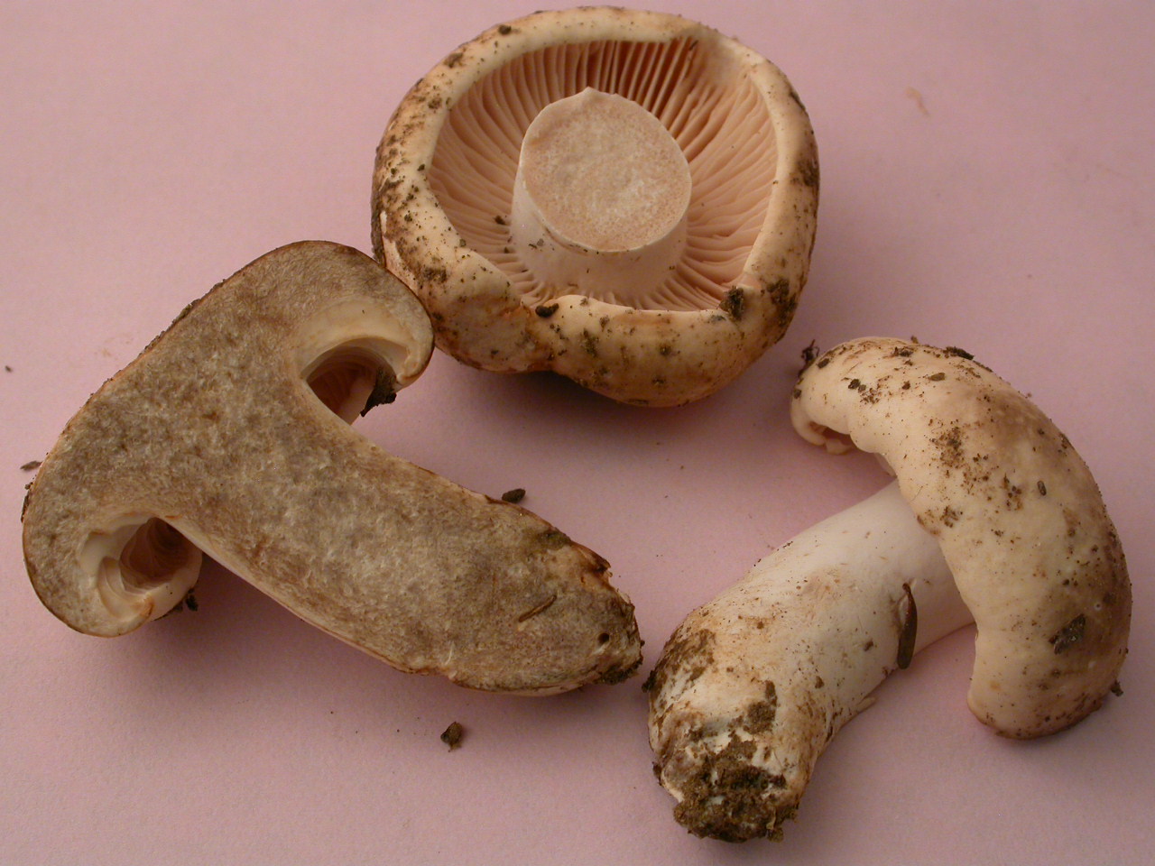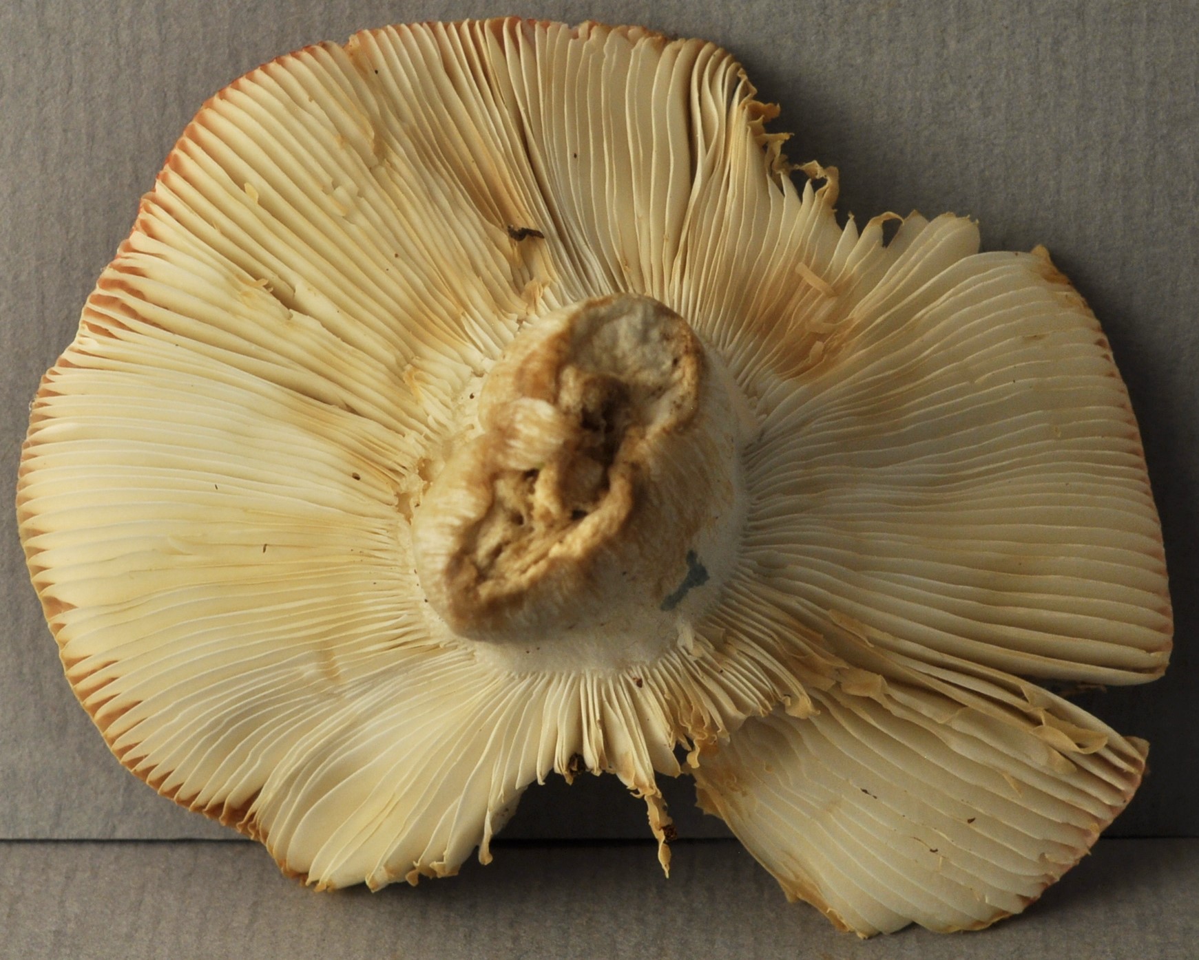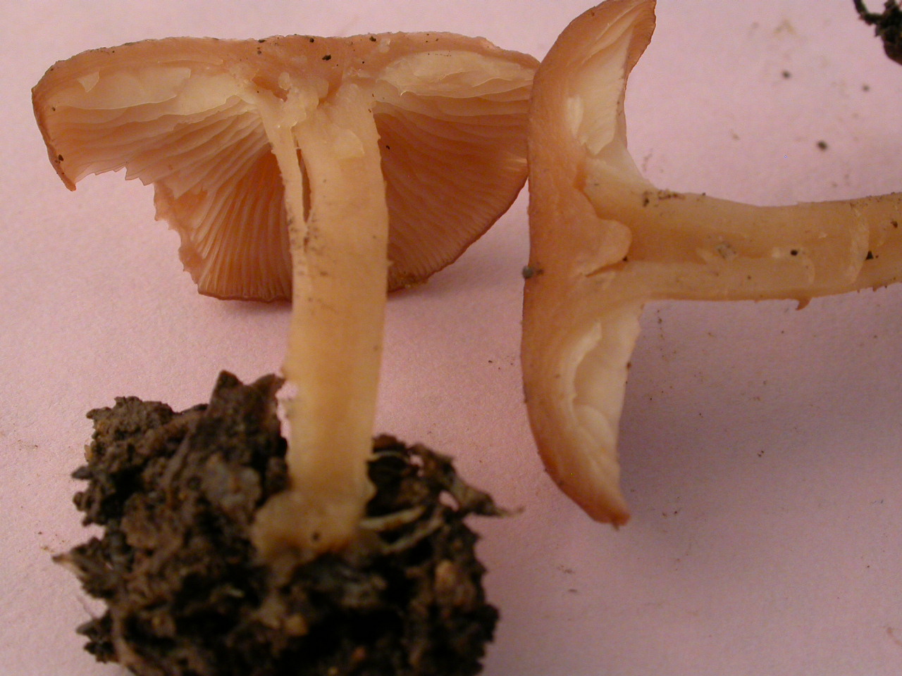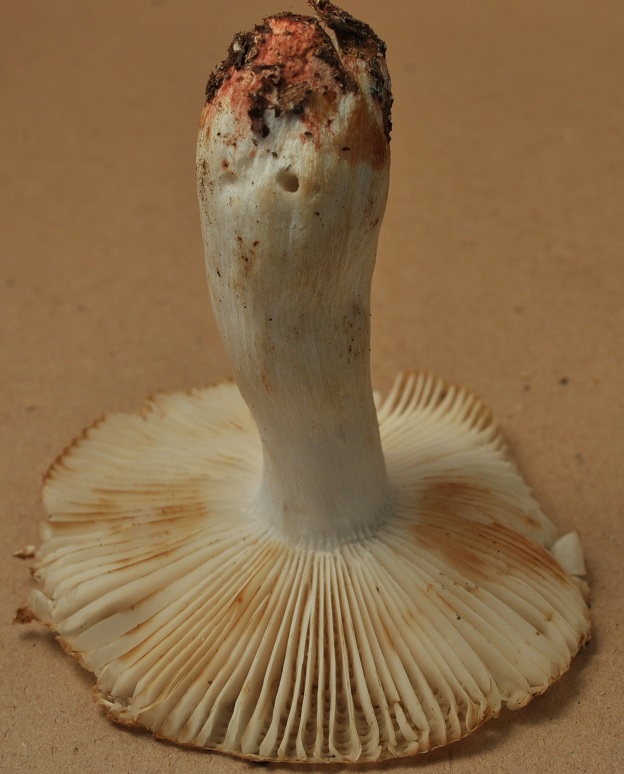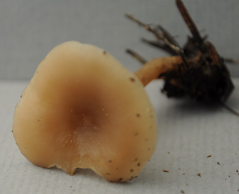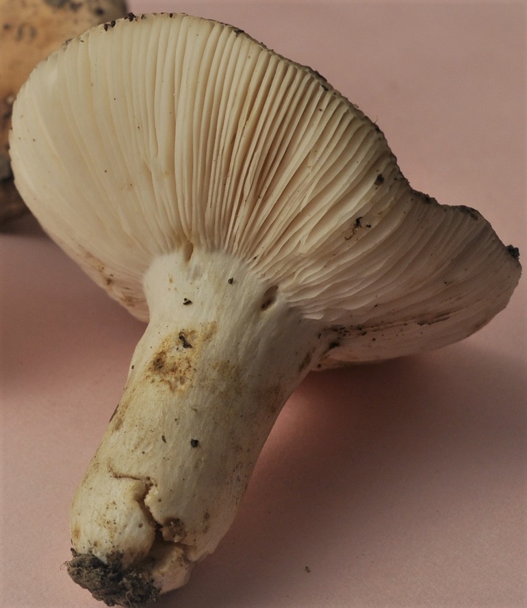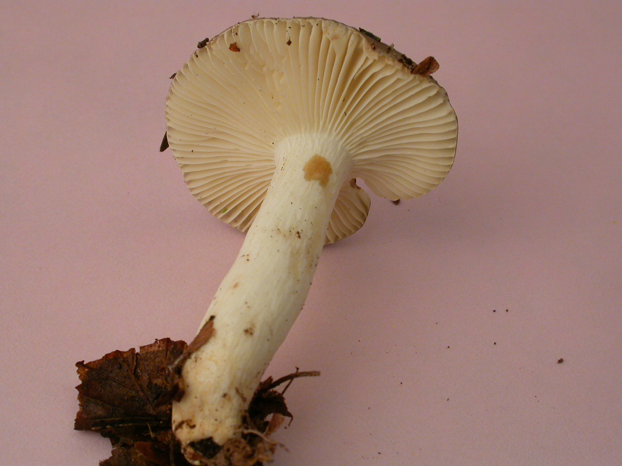 dessous, CD8-F11 3/4. Chapeau rose jambon, marge courtement et légèrement cannelée. Stipe blanc, dur, pointu-recourbé en bas. Lames crèmes (Rom-267 OK), régulières, en U, 8-9 au bord, épaisses, fourchues (à partir de R/2), non anastomosées.