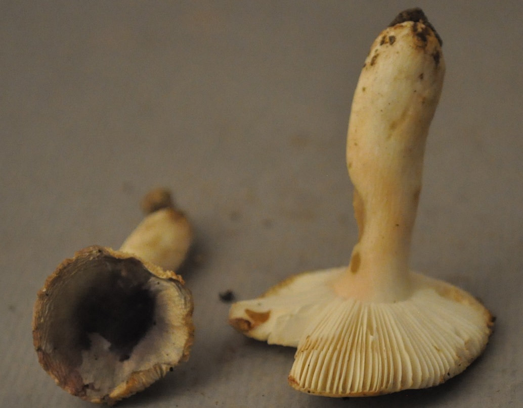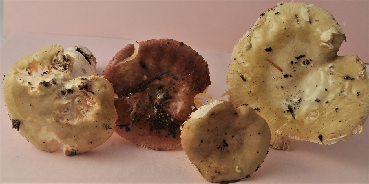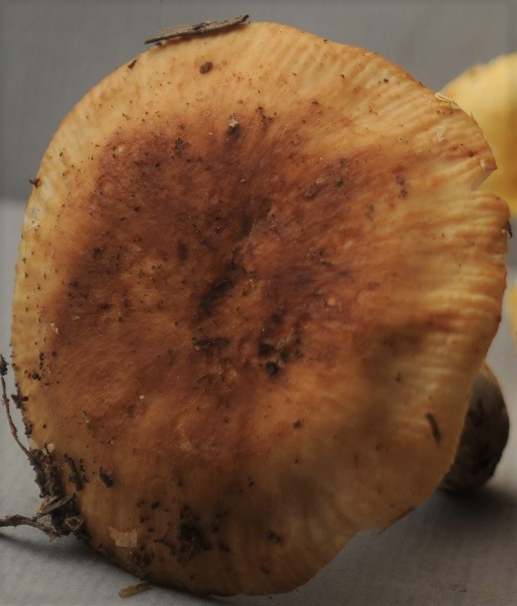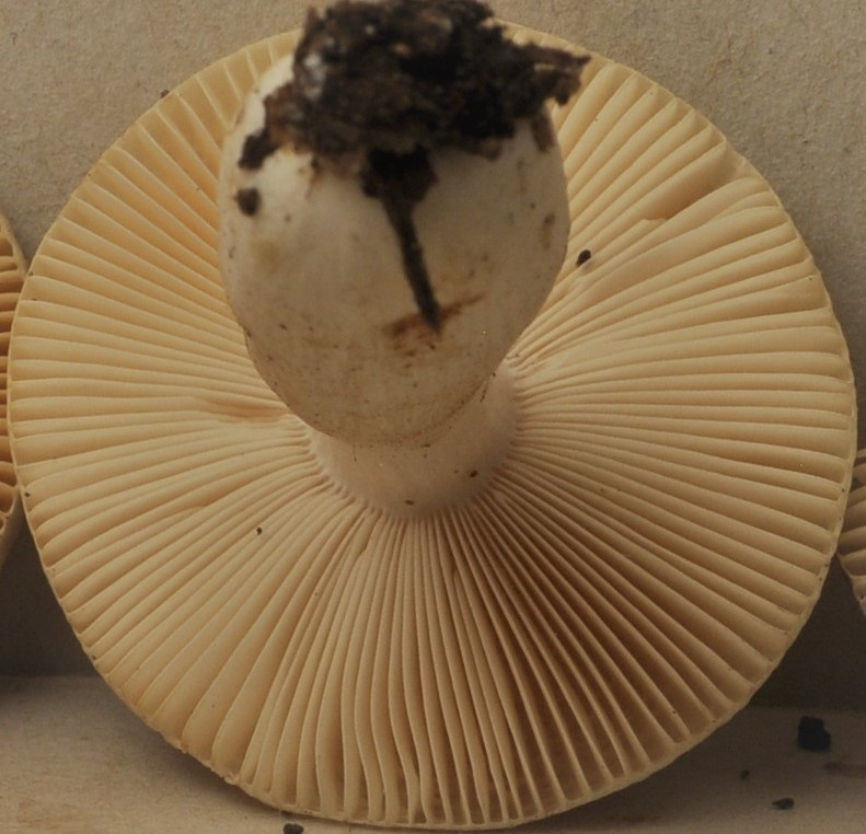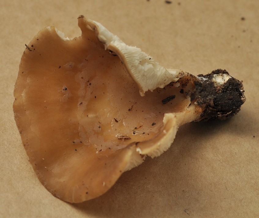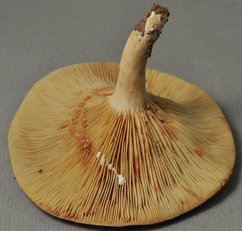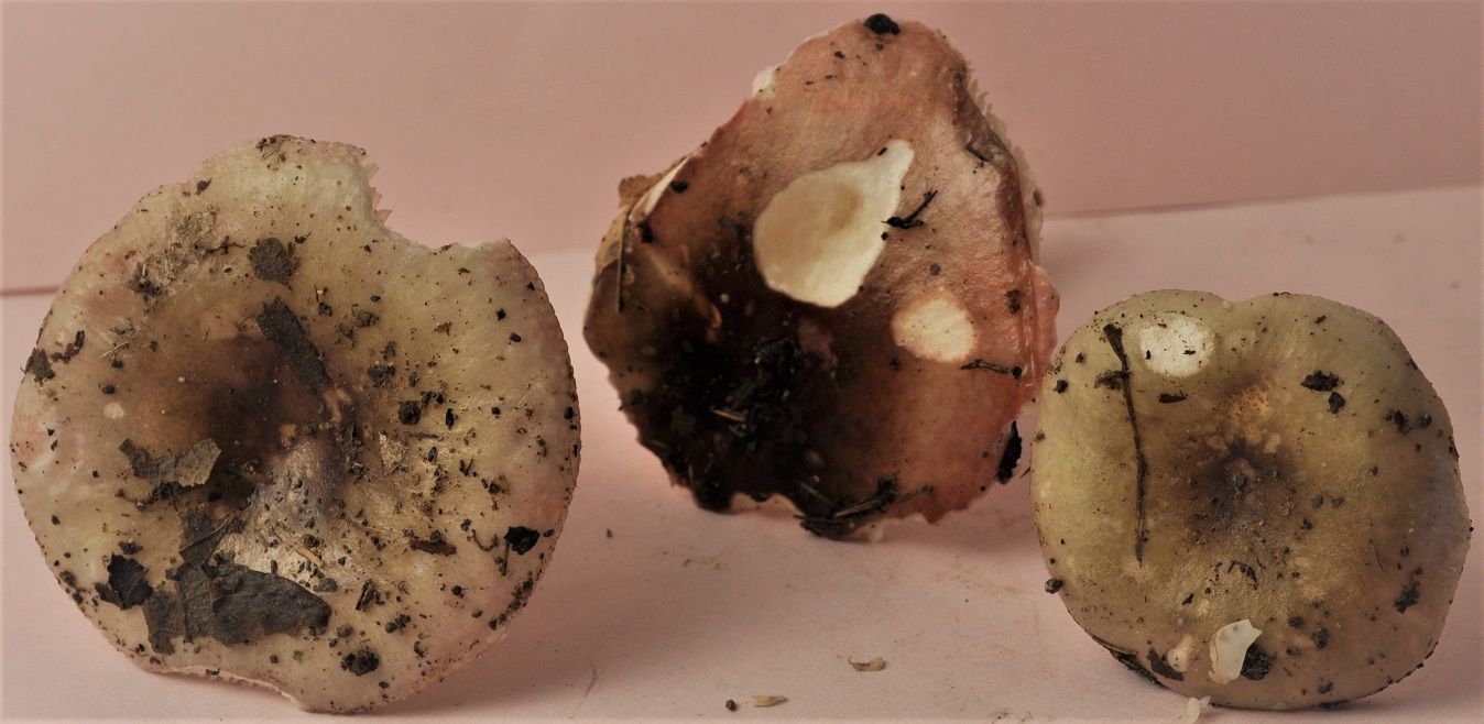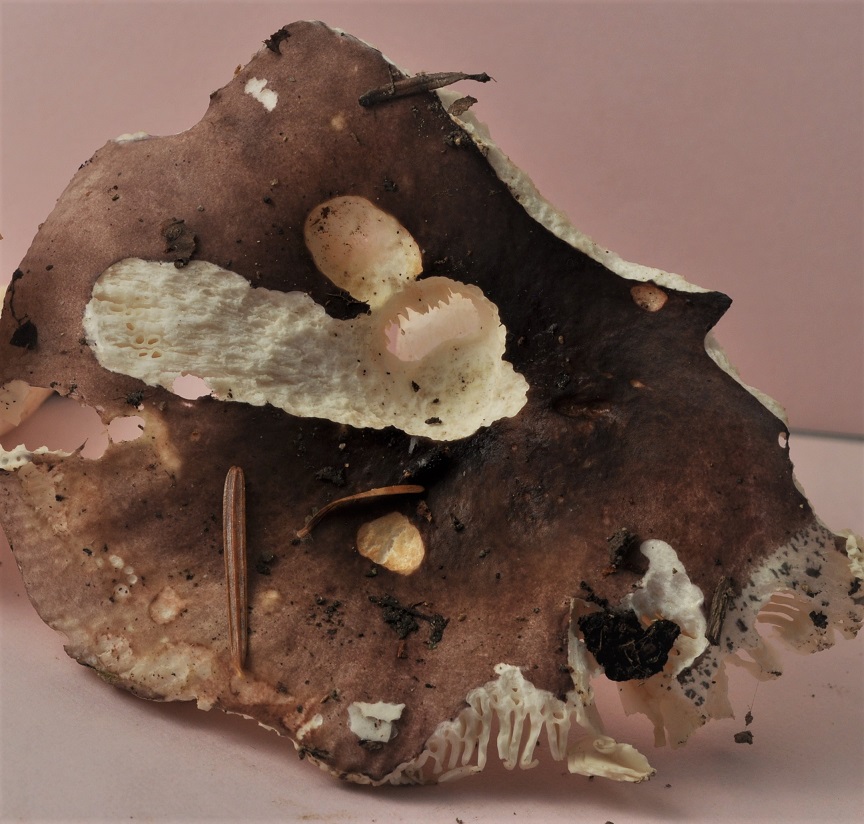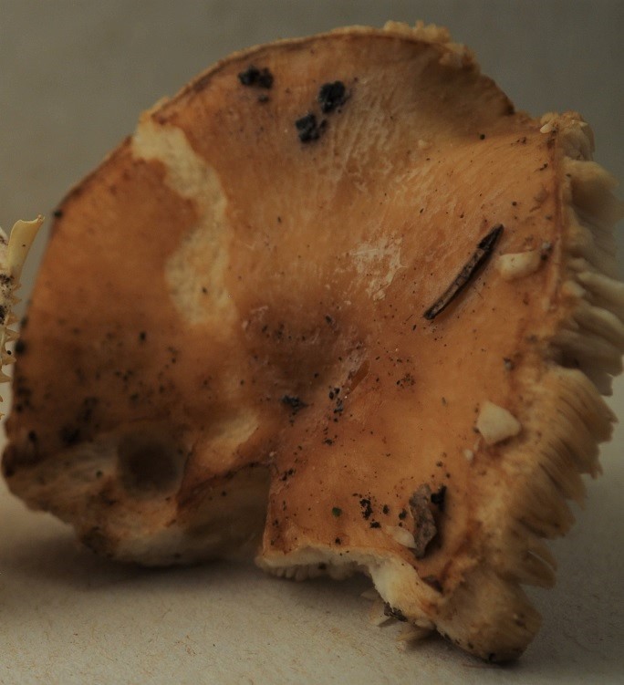 dessous, CD8-F11 3/4. Chapeau rose jambon, marge courtement et légèrement cannelée. Stipe blanc, dur, pointu-recourbé en bas. Lames crèmes (Rom-267 OK), régulières, en U, 8-9 au bord, épaisses, fourchues (à partir de R/2), non anastomosées.