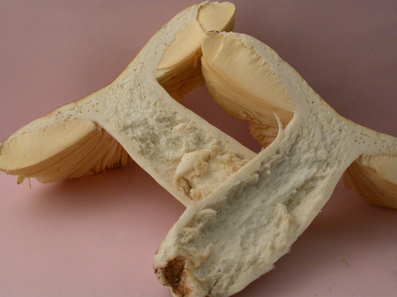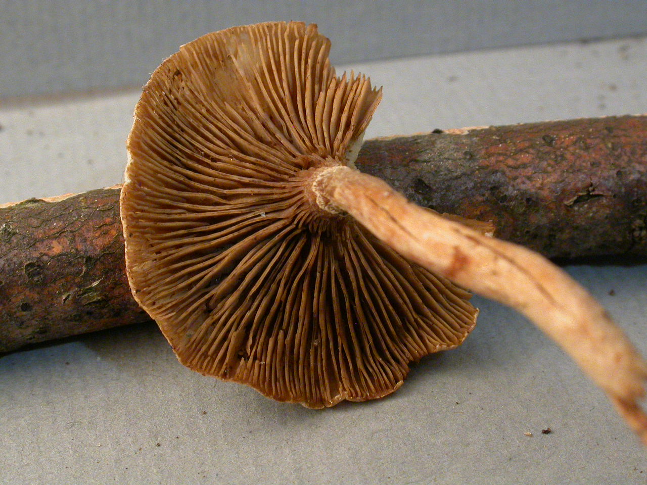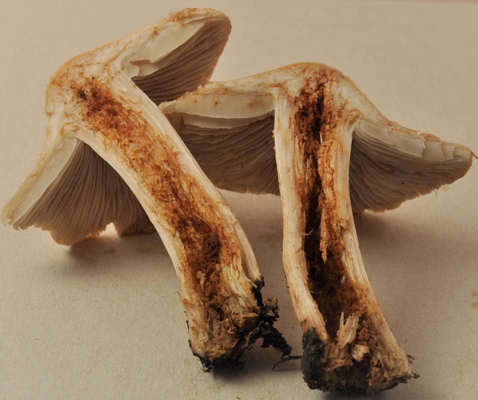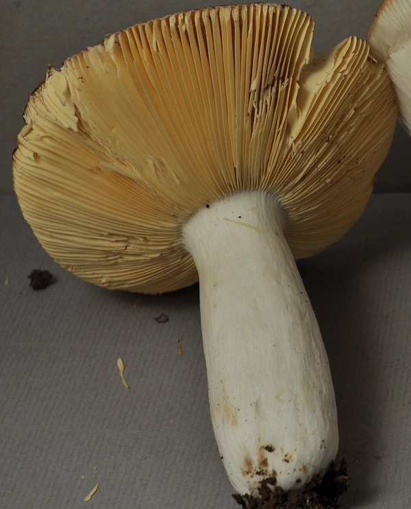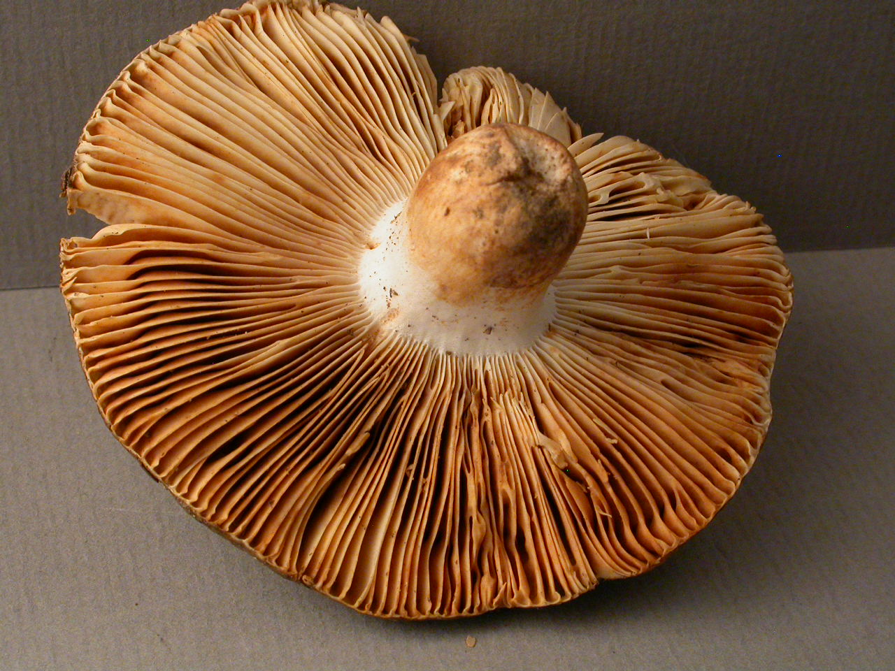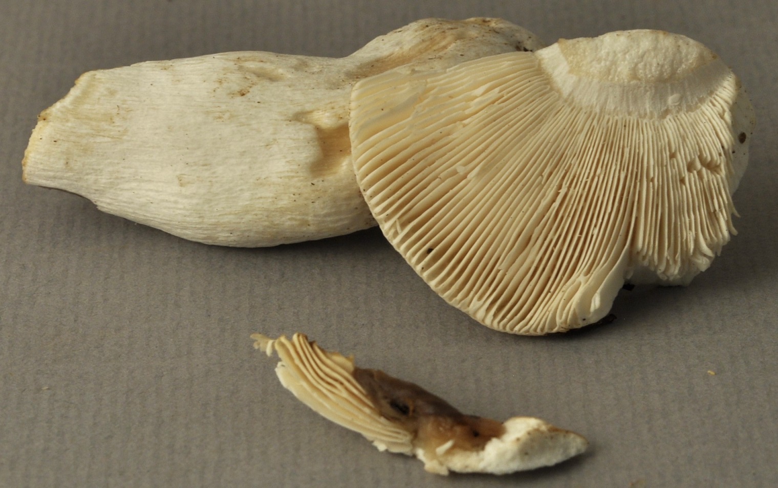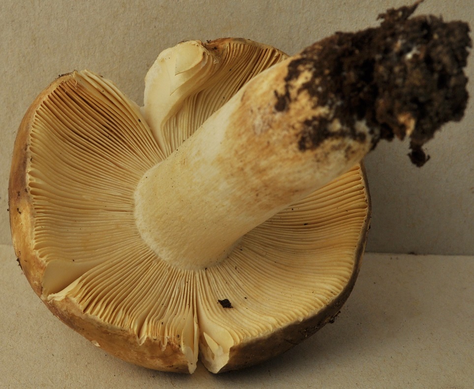 dessous, CD8-F11 3/4. Chapeau rose jambon, marge courtement et légèrement cannelée. Stipe blanc, dur, pointu-recourbé en bas. Lames crèmes (Rom-267 OK), régulières, en U, 8-9 au bord, épaisses, fourchues (à partir de R/2), non anastomosées.