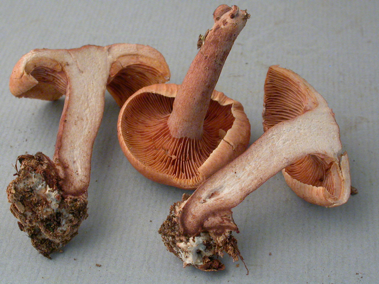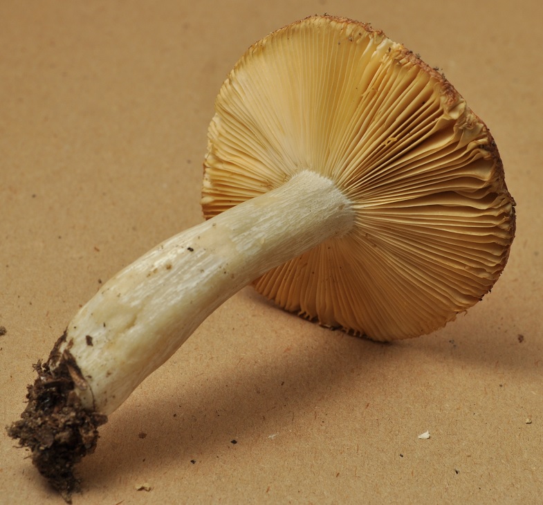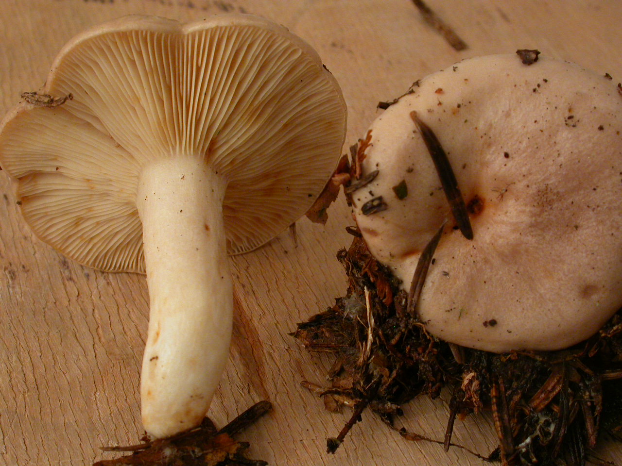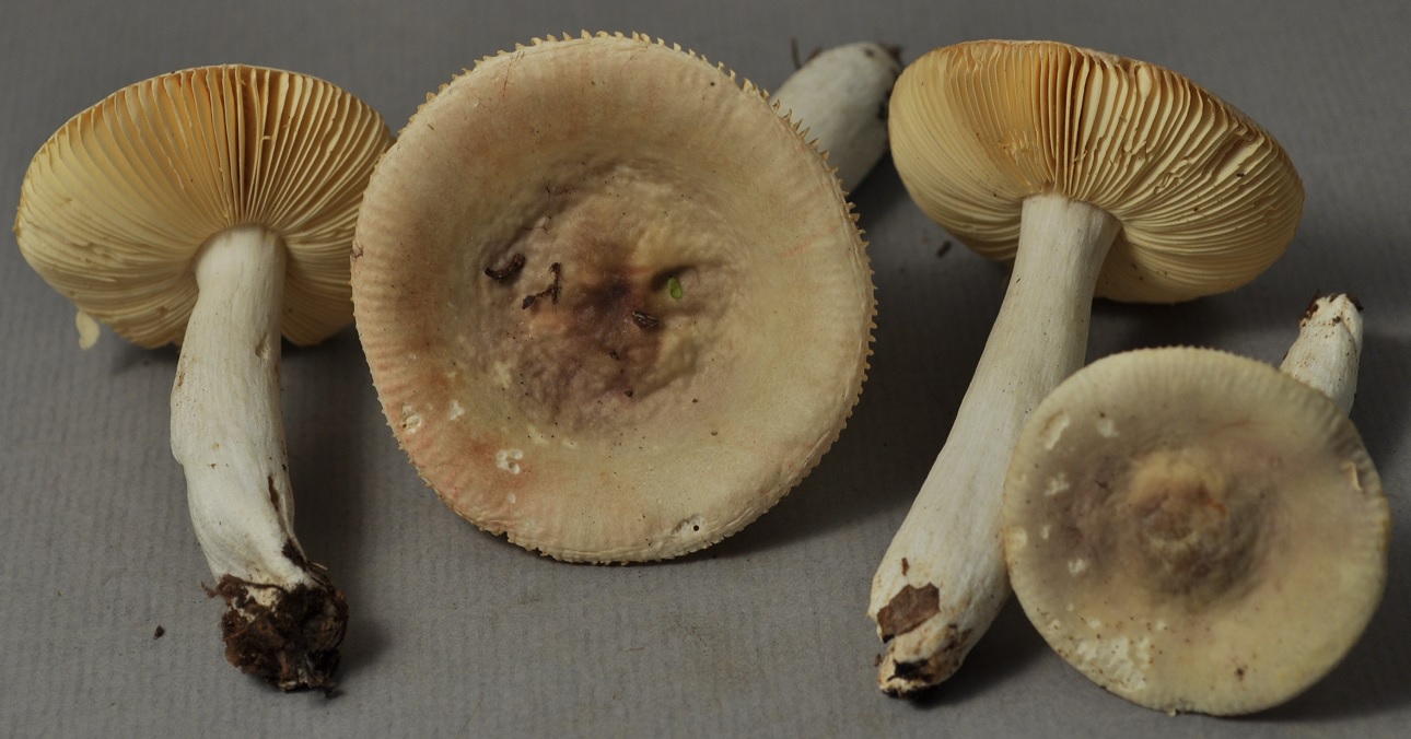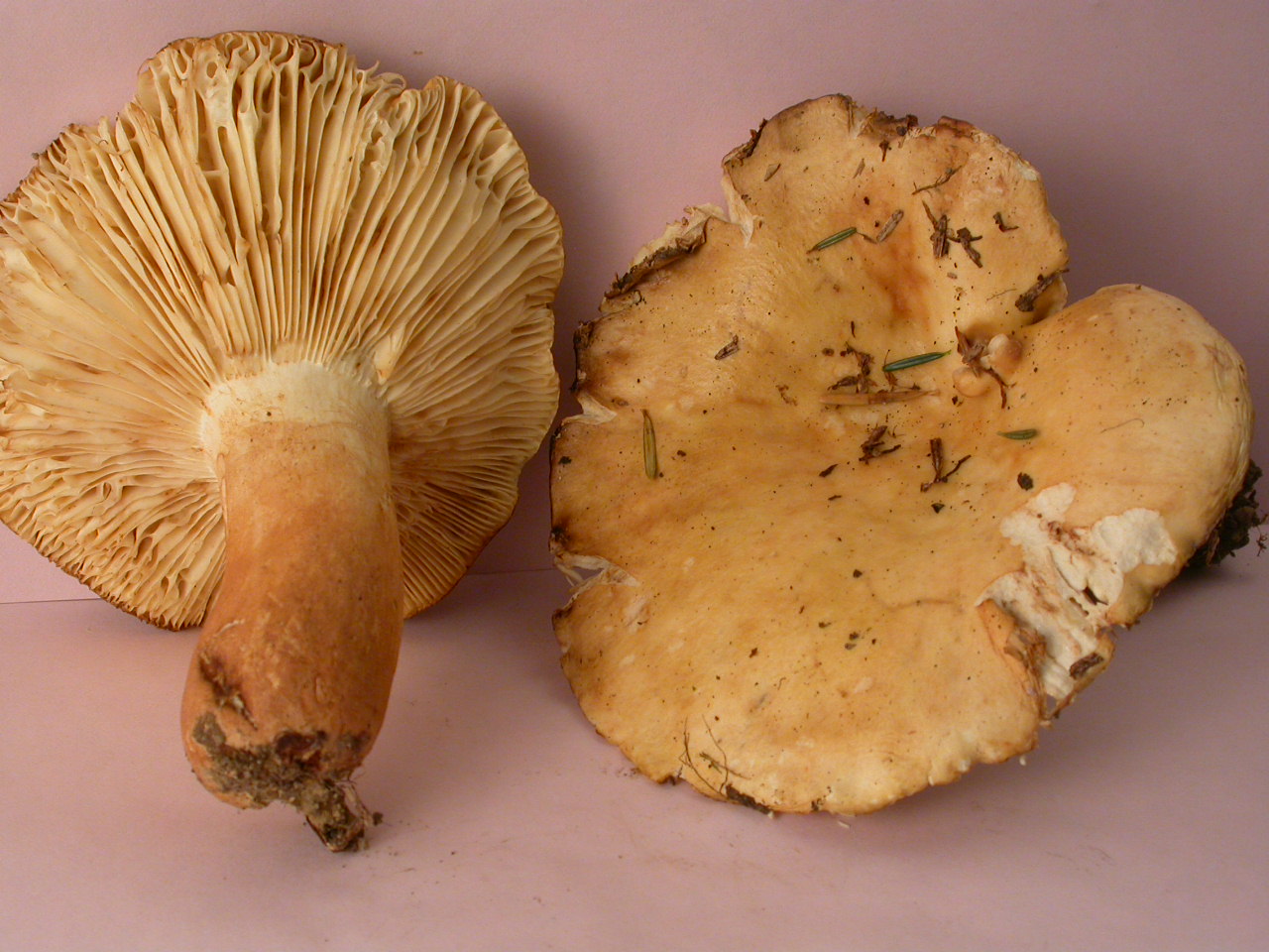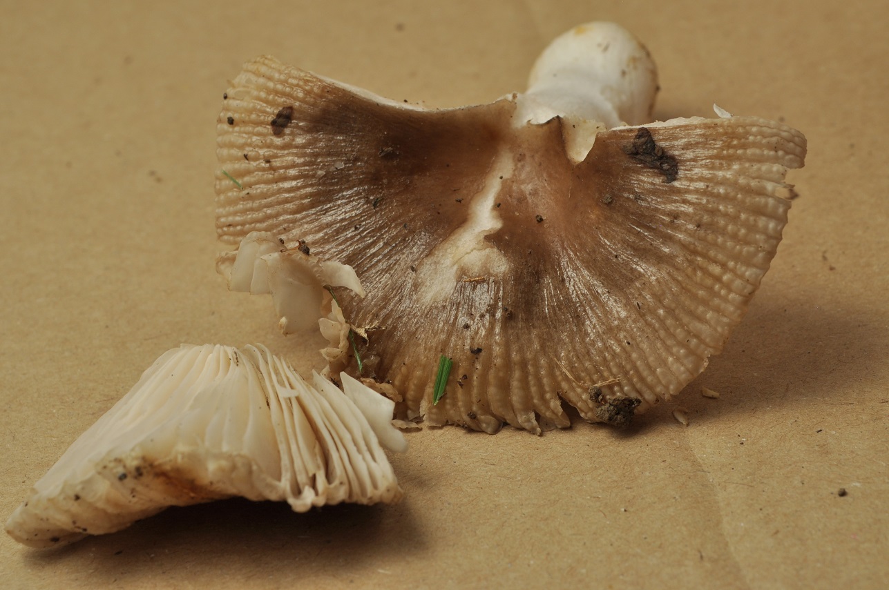 dessous, CD8-F11 3/4. Chapeau rose jambon, marge courtement et légèrement cannelée. Stipe blanc, dur, pointu-recourbé en bas. Lames crèmes (Rom-267 OK), régulières, en U, 8-9 au bord, épaisses, fourchues (à partir de R/2), non anastomosées.
