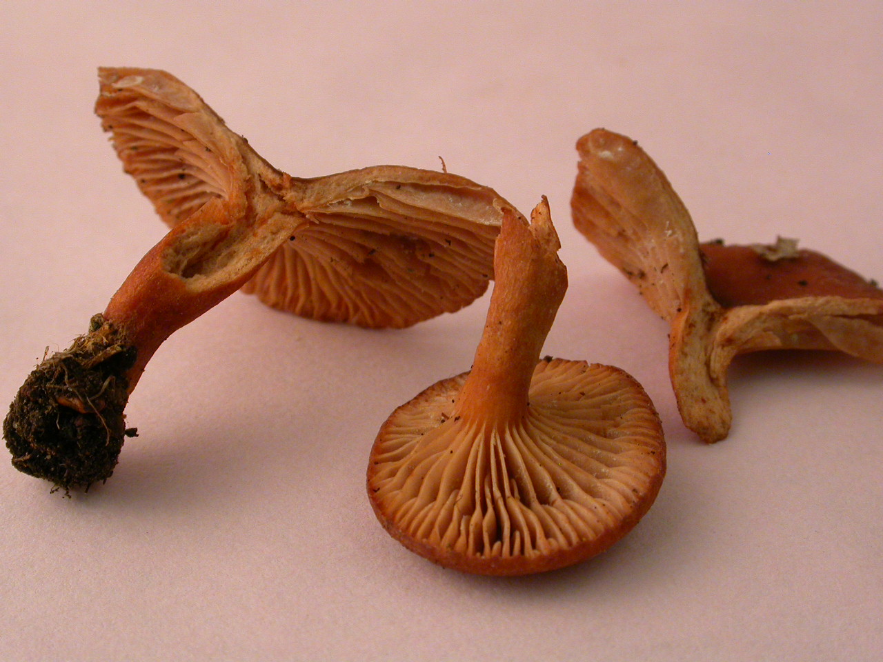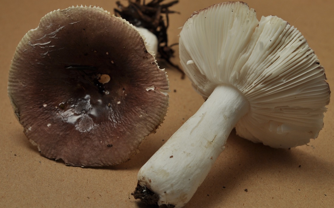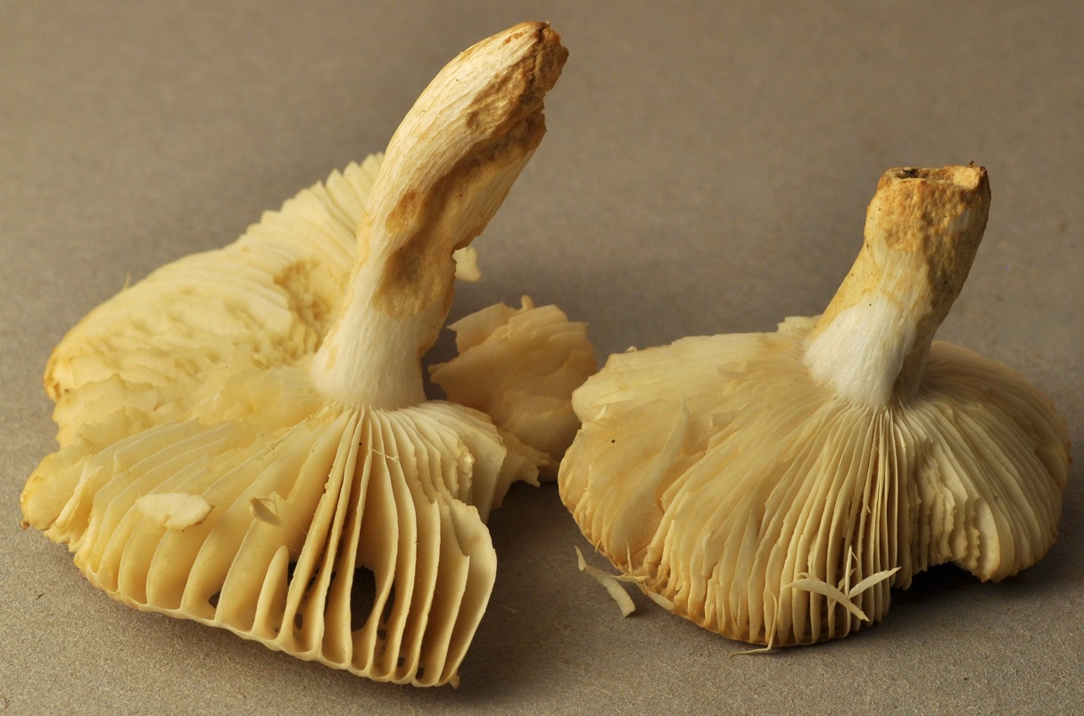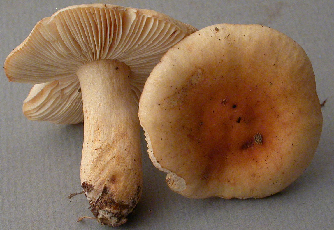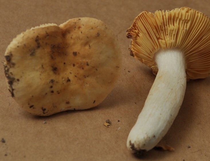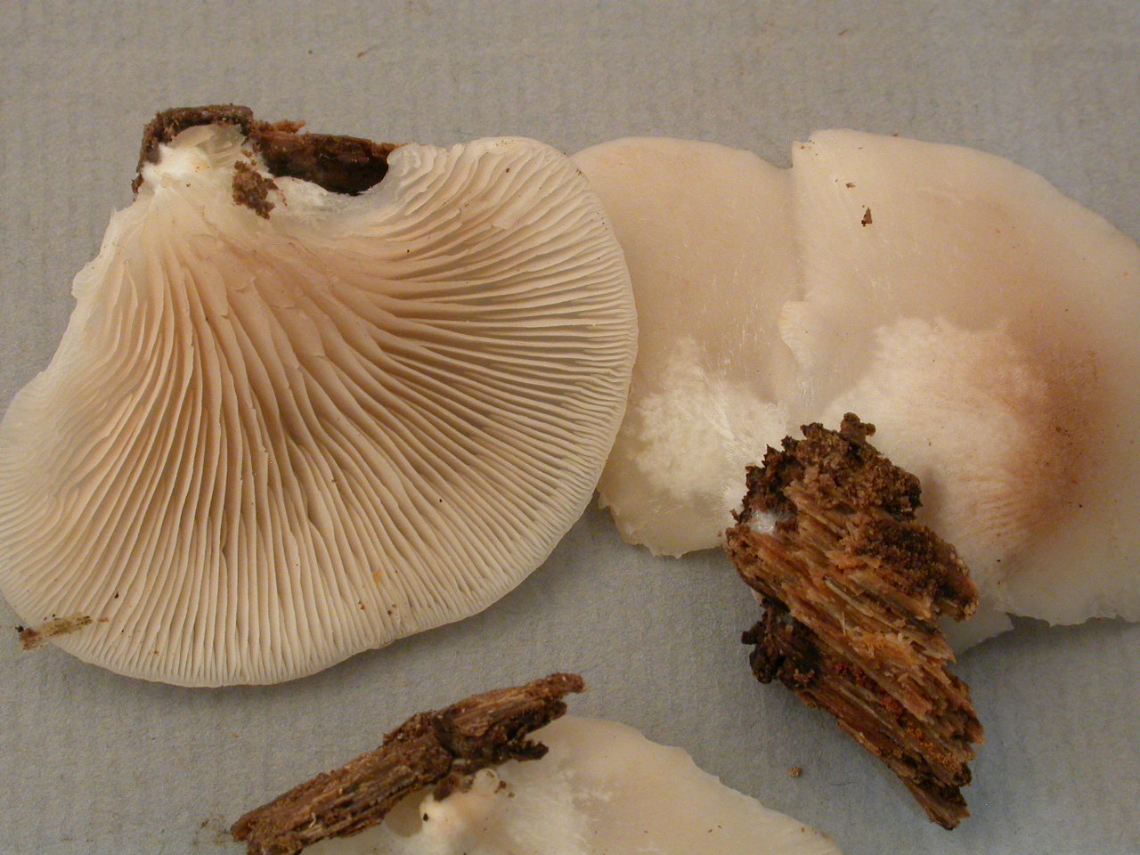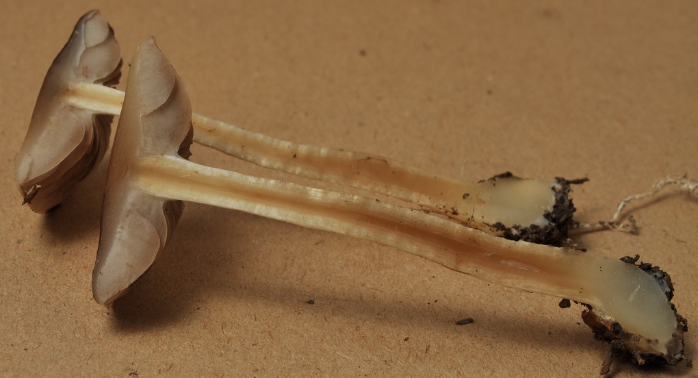 dessous, CD8-F11 3/4. Chapeau rose jambon, marge courtement et légèrement cannelée. Stipe blanc, dur, pointu-recourbé en bas. Lames crèmes (Rom-267 OK), régulières, en U, 8-9 au bord, épaisses, fourchues (à partir de R/2), non anastomosées.