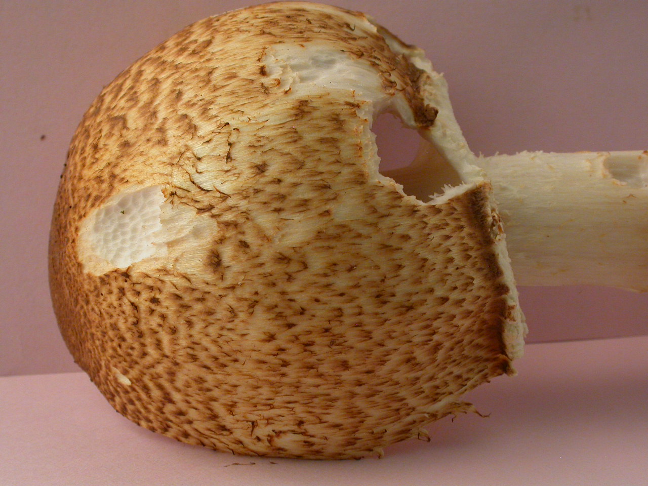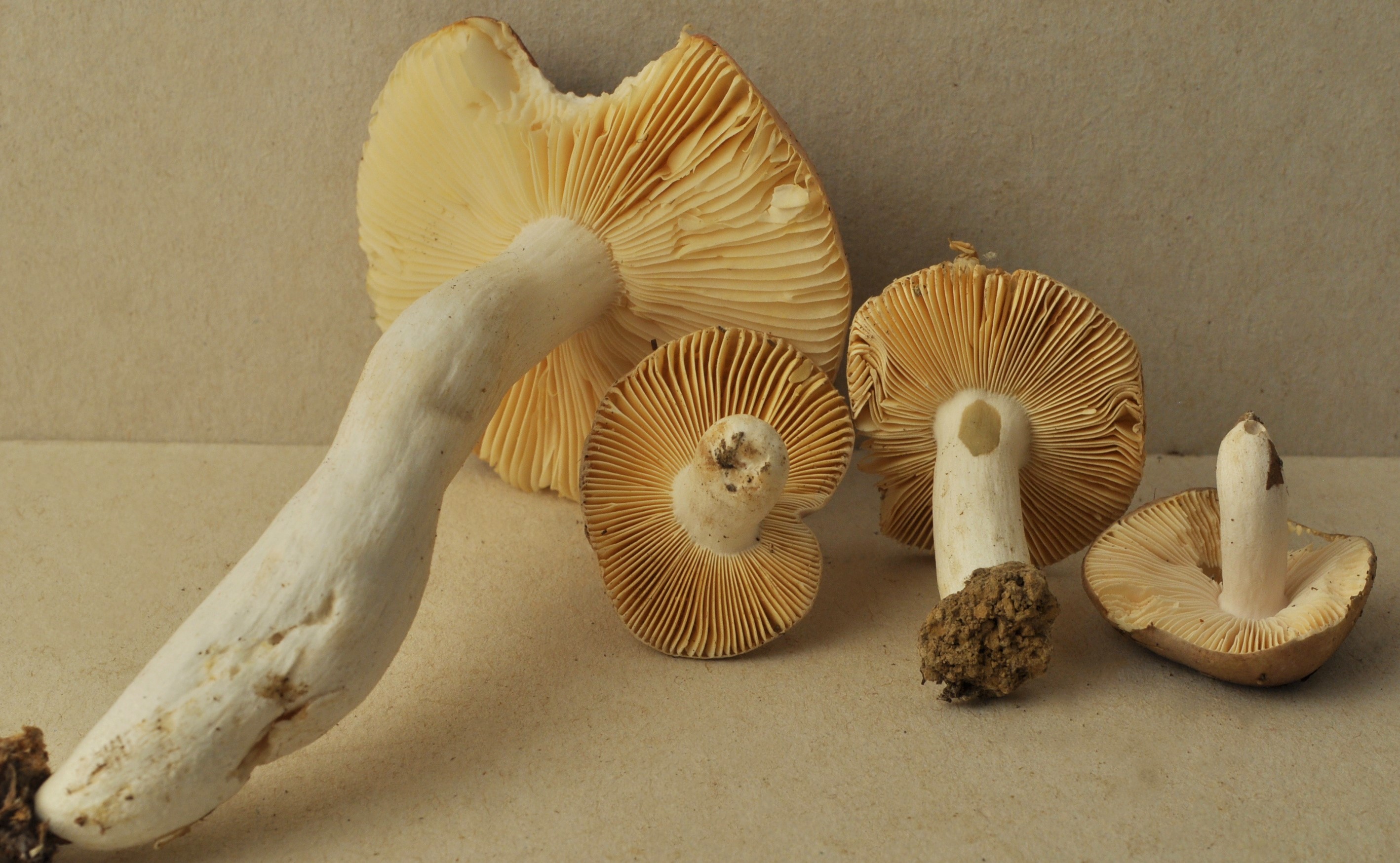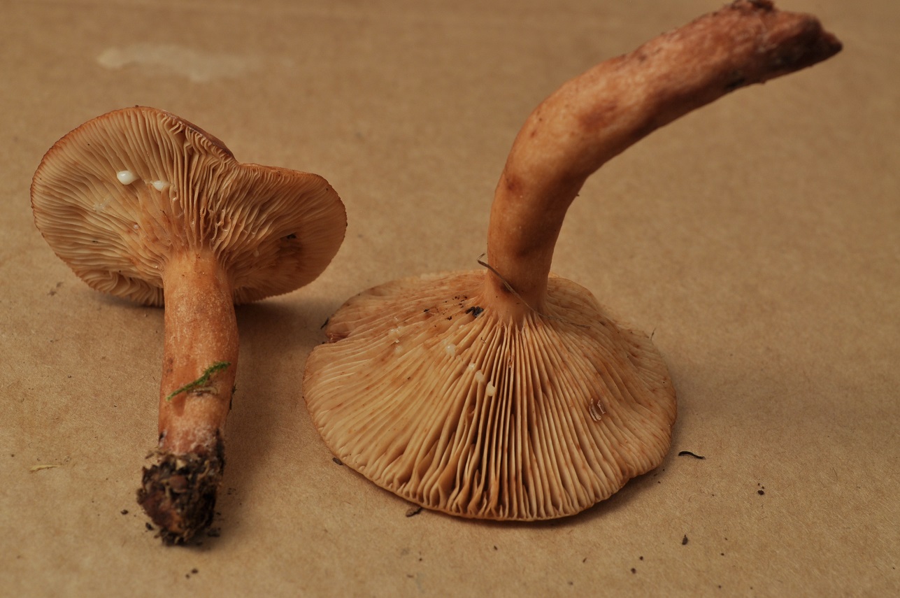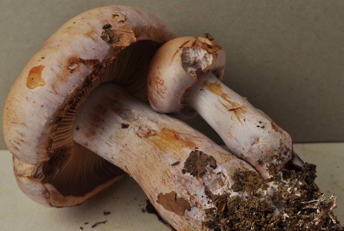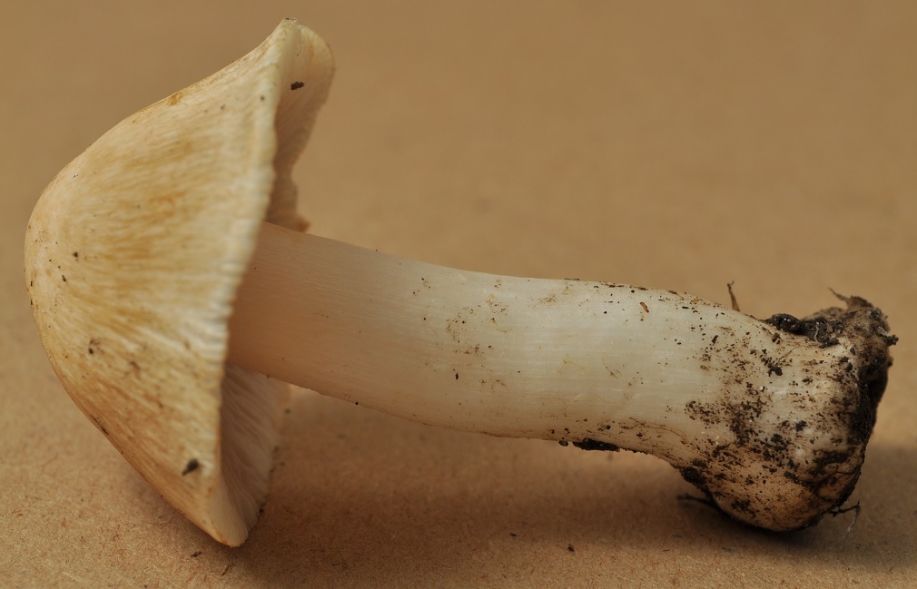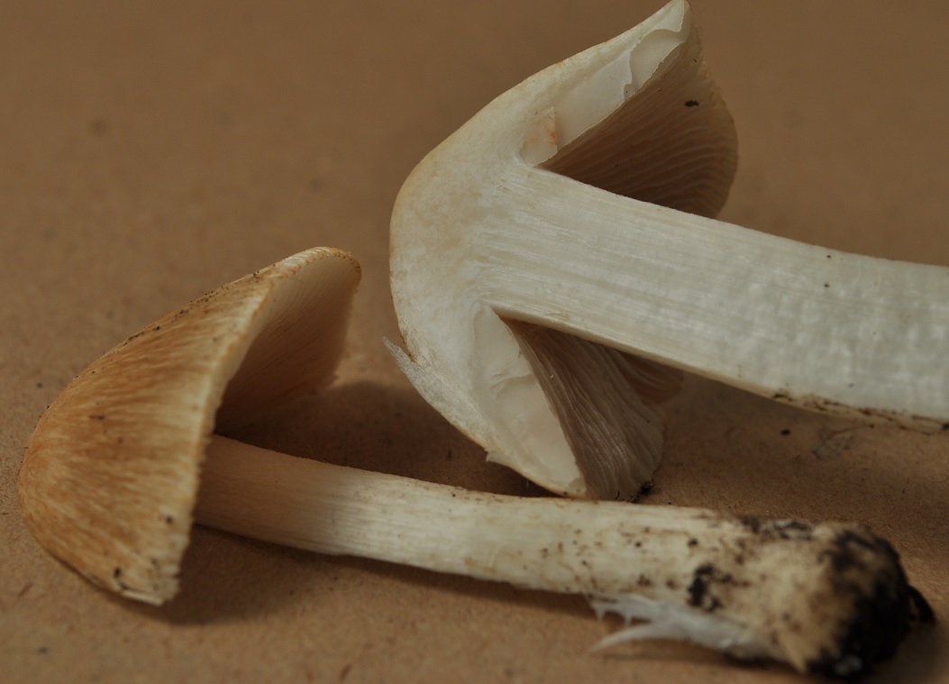 dessous, CD8-F11 3/4. Chapeau rose jambon, marge courtement et légèrement cannelée. Stipe blanc, dur, pointu-recourbé en bas. Lames crèmes (Rom-267 OK), régulières, en U, 8-9 au bord, épaisses, fourchues (à partir de R/2), non anastomosées.