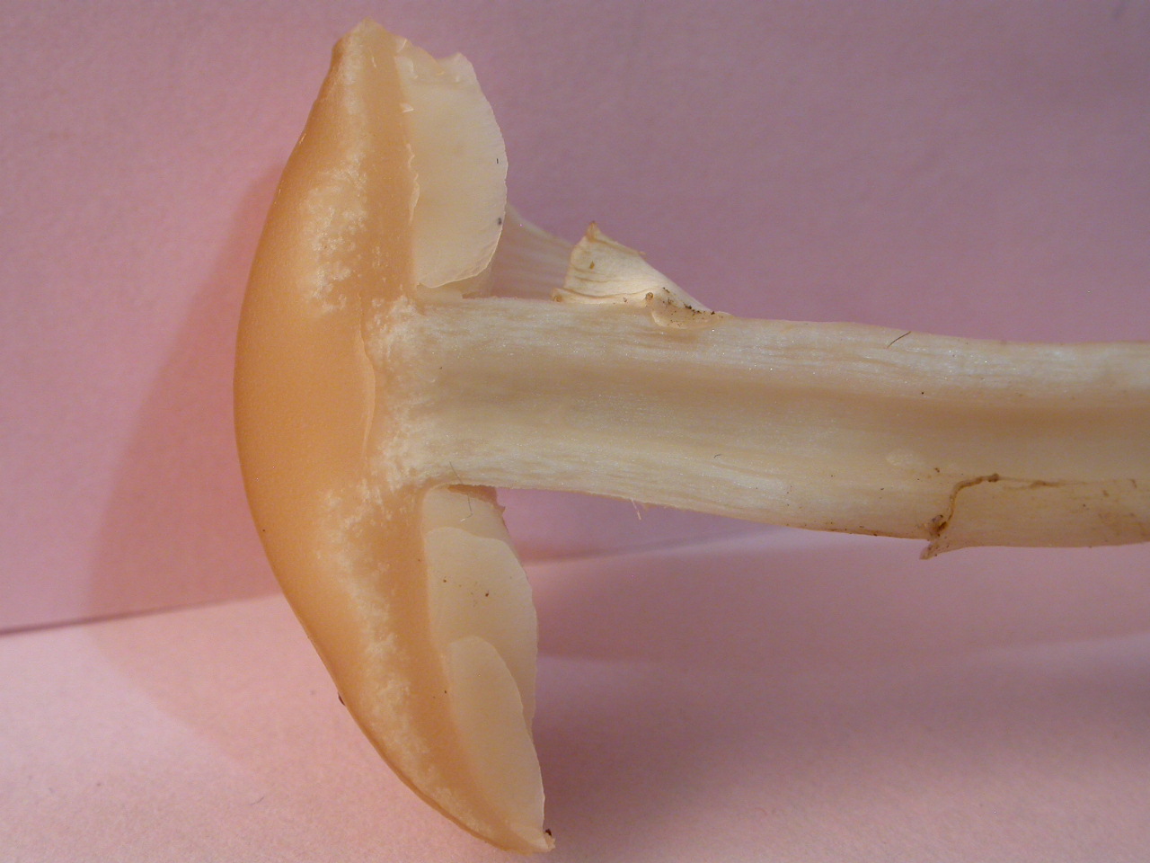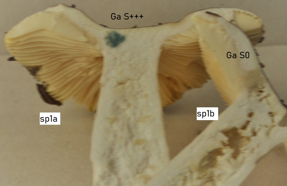 coupe, CD8-F8 64/65. Ex. à chapeau jaune. Ga S++ à S+++ , réaction KOH rougeâtre (un peu difficile). Chair du stipe très dure, saveur âcre. Sporée crème.