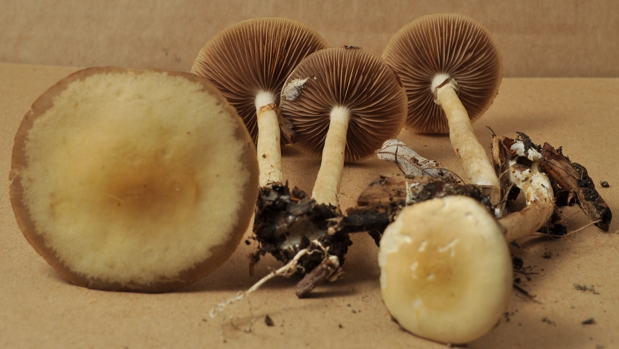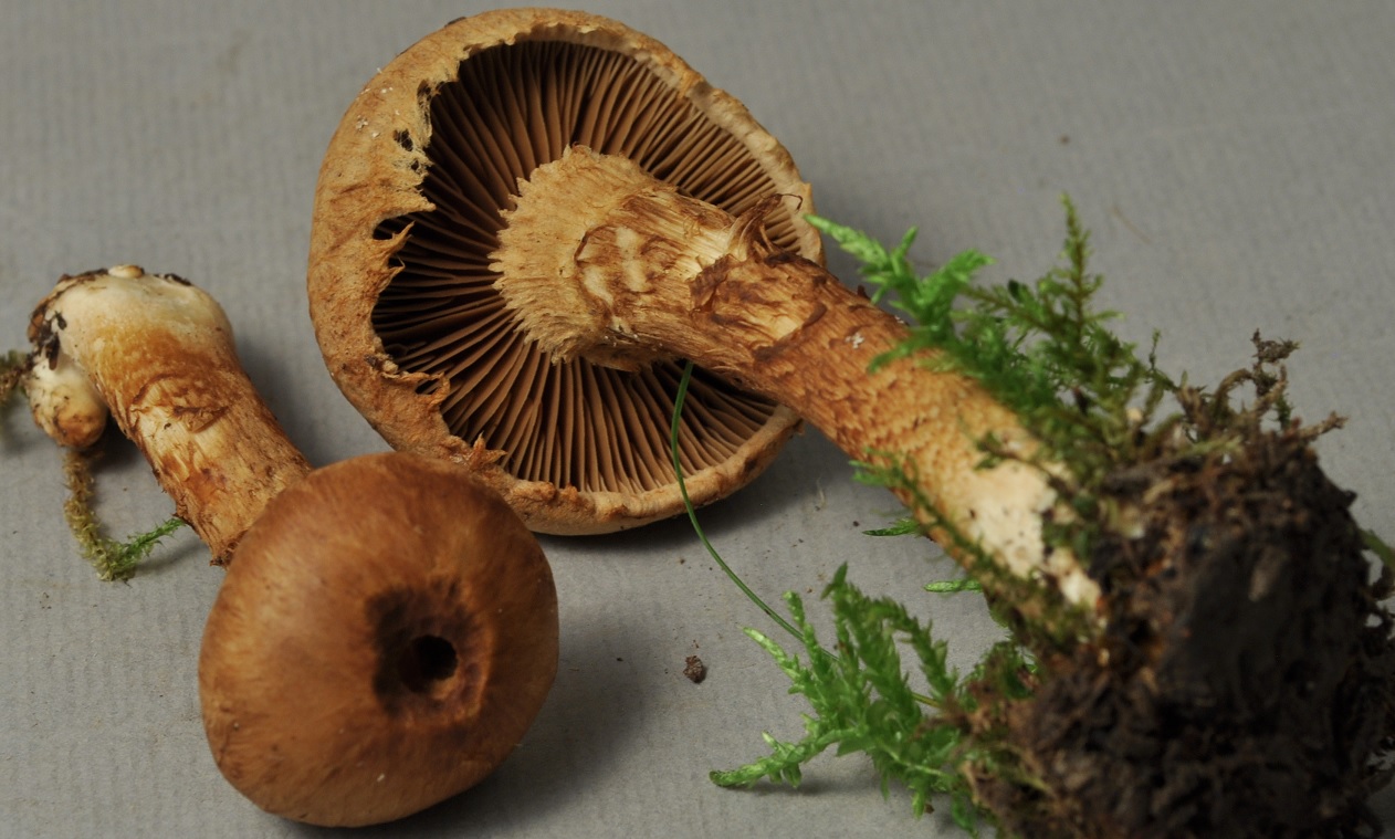 photo, CD8-6 36/37. Champignon brun à stipe hérissé d'écailles (armille). Lames brun sombre, émarginées, l/t 4/9 mm. Chair douce. Spores brunes (Agrocybe-like), parois épaisses, bien visibles.