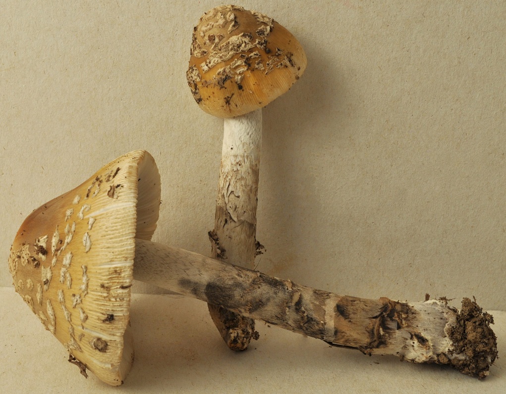 photo, CD8-F9 44/45. 2 ex. l'un Φ 155 mm, H 300 mm ! volve épaisse, colorée à l'intérieur, stipe chiné en partie.