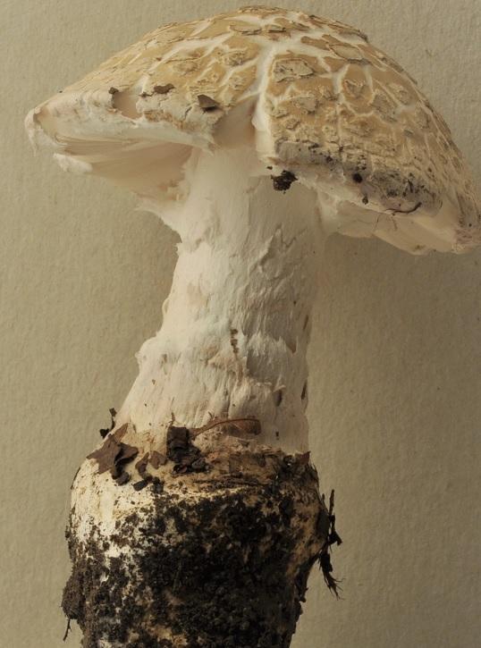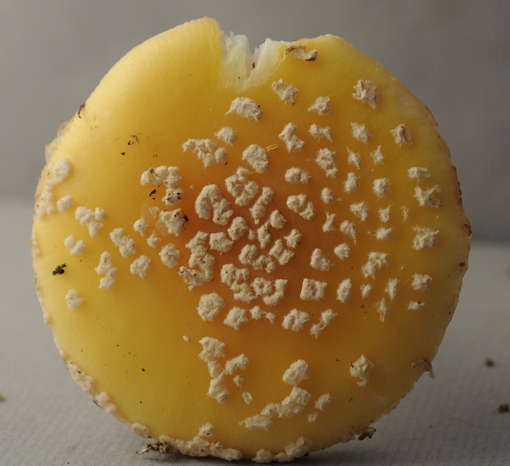 photo, CD7-6 3. Chapeau mamelonné, lames nettement jaunes, fimbriées, stipe chiné sauf à l'apex, tomenteux en haut (s.l), volve sans orange à l'extérieur comme à l'intérieur. Phénol rouge groseille (chair haut du stipe, 5').