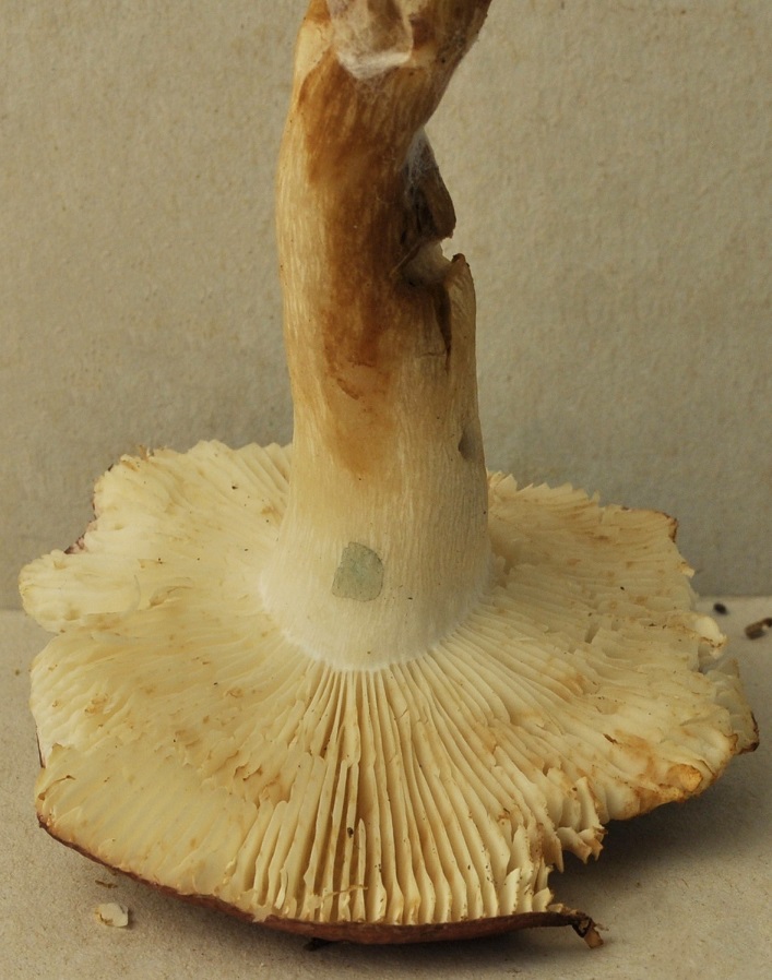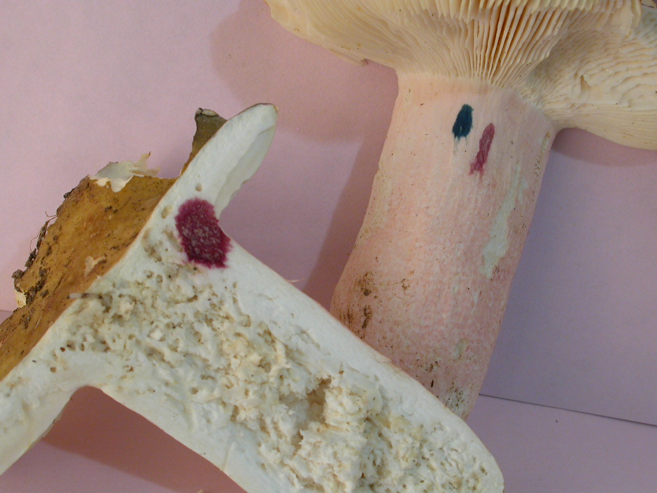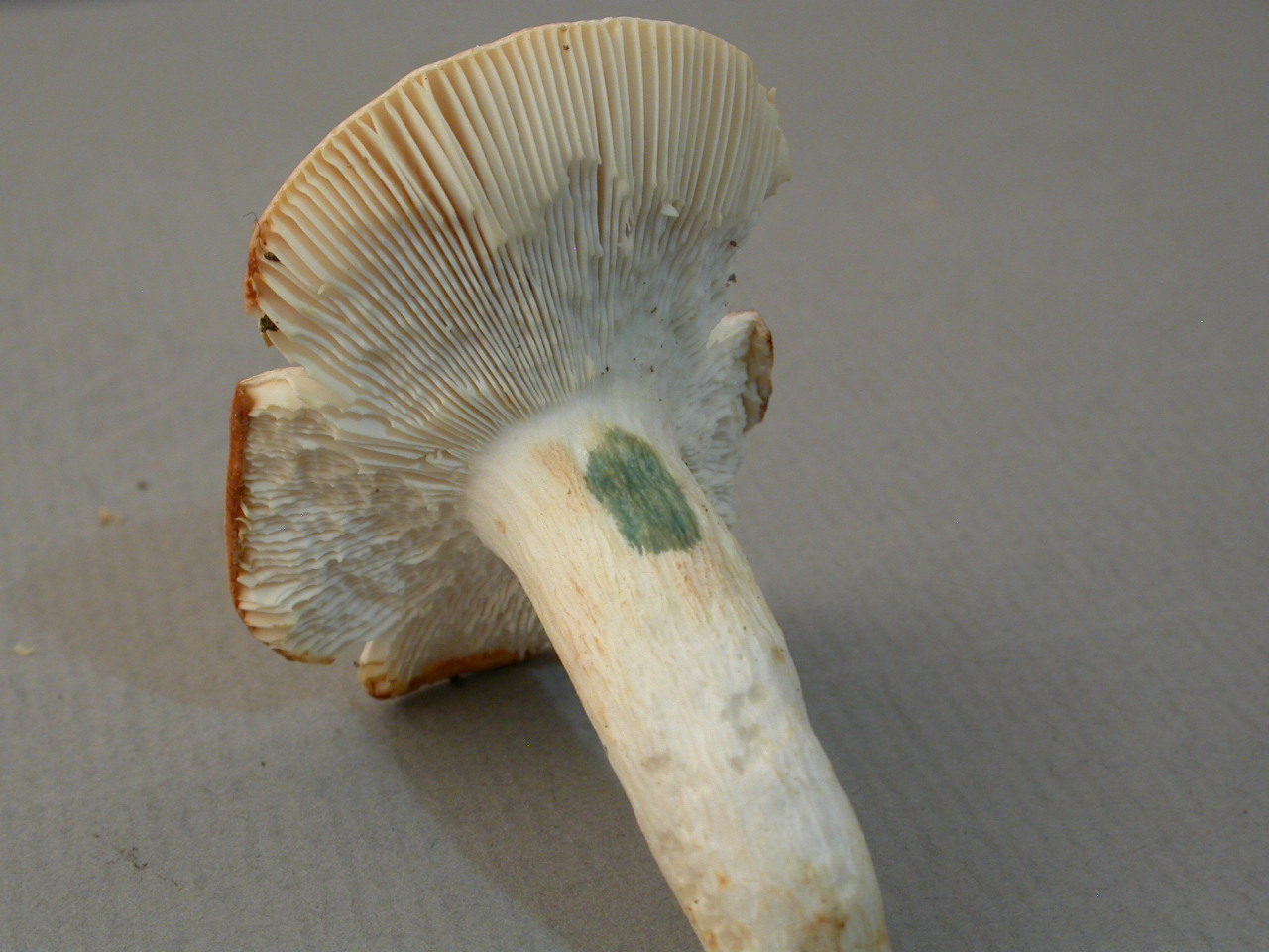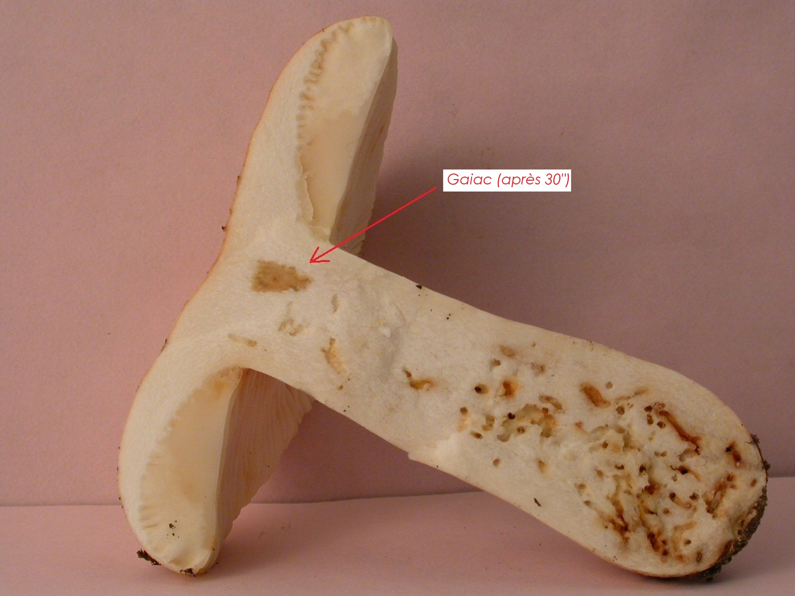 dessous, CD-F6 11/12. Chapeau blanchâtre, taché de rougeâtre, cuticule détachable. Stipe blanc, cylindrique, un peu rétrécit et courbé en bas. Lames blanches, fourchues, denses, anastomosées localement, avec lamellules. Odeur fruitée, agréable. Saveur douce (chair, lames). Gaiac S0 L0 C0, Fe pâle orange.