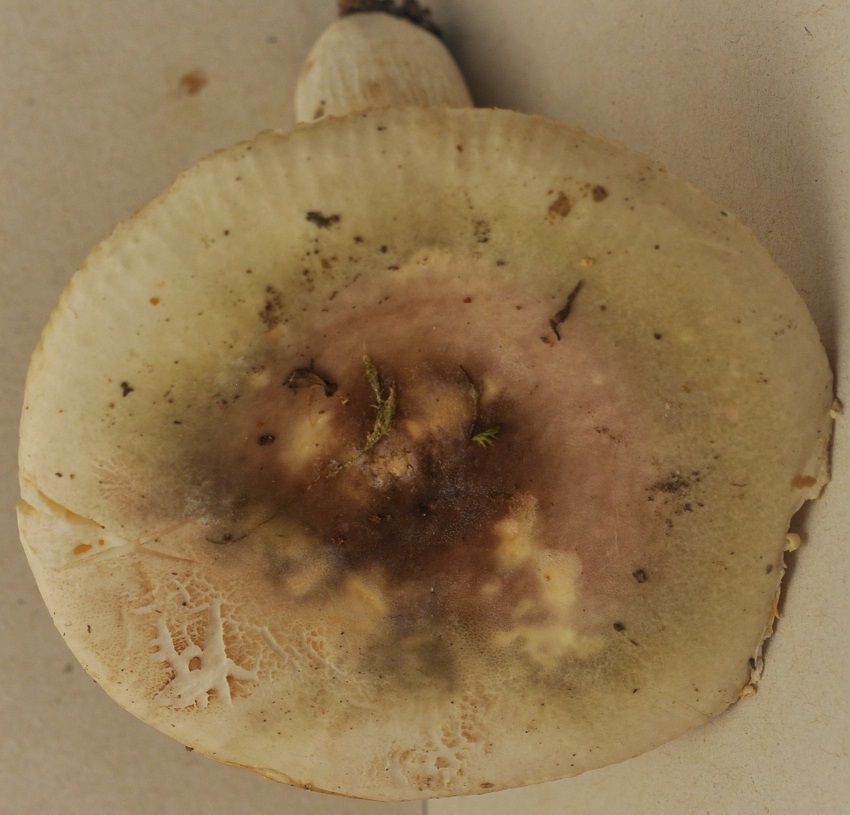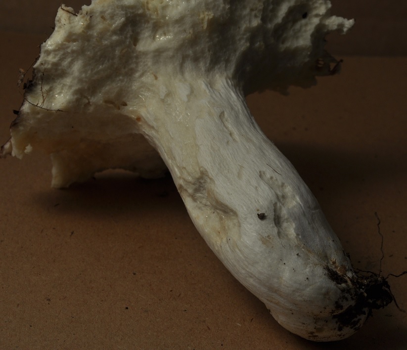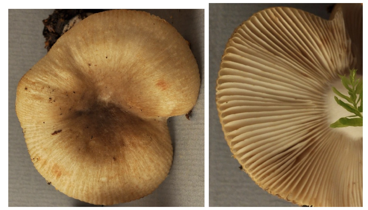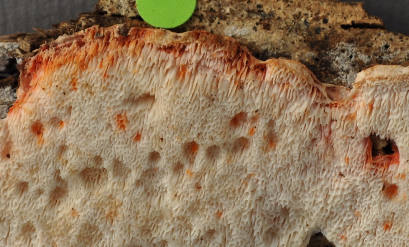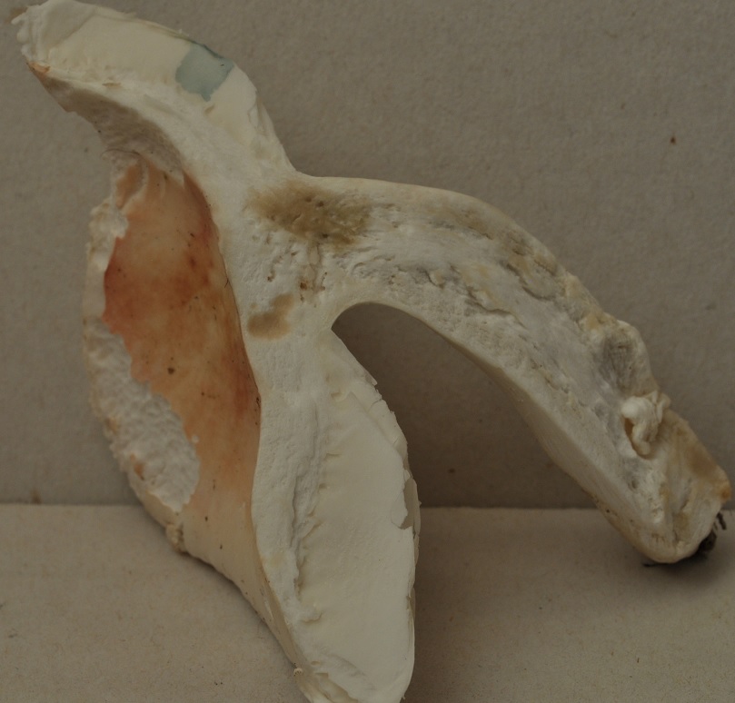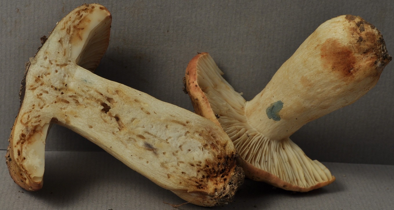 dessous, CD-F6 11/12. Chapeau blanchâtre, taché de rougeâtre, cuticule détachable. Stipe blanc, cylindrique, un peu rétrécit et courbé en bas. Lames blanches, fourchues, denses, anastomosées localement, avec lamellules. Odeur fruitée, agréable. Saveur douce (chair, lames). Gaiac S0 L0 C0, Fe pâle orange.