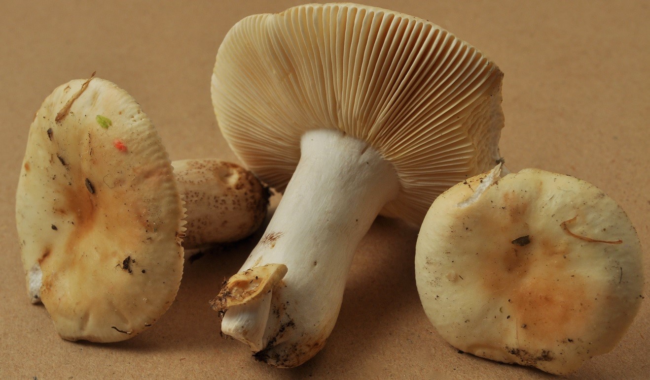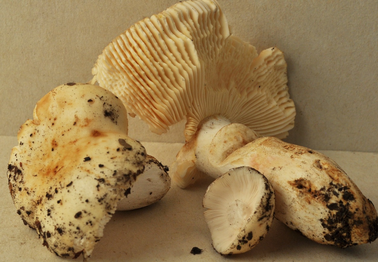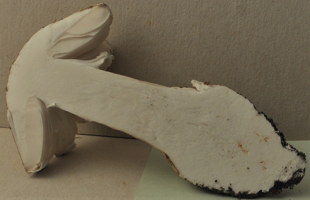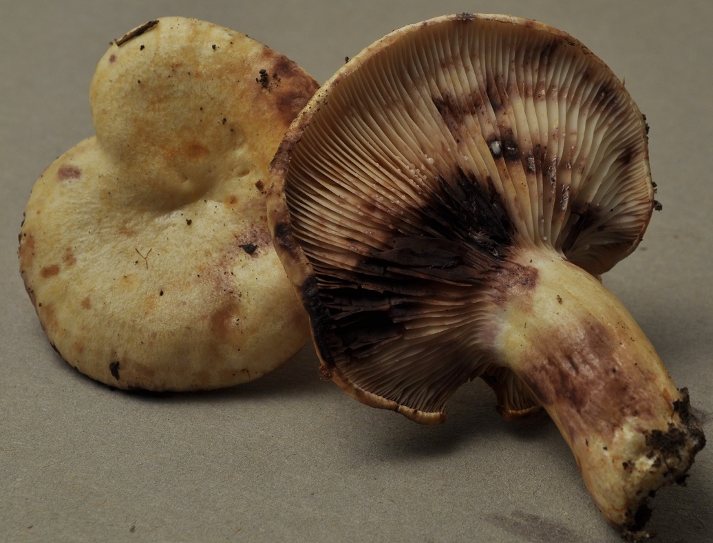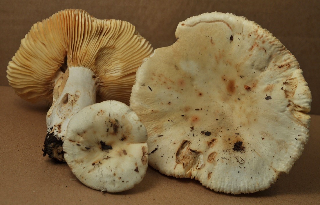 dessous, CD-F6 11/12. Chapeau blanchâtre, taché de rougeâtre, cuticule détachable. Stipe blanc, cylindrique, un peu rétrécit et courbé en bas. Lames blanches, fourchues, denses, anastomosées localement, avec lamellules. Odeur fruitée, agréable. Saveur douce (chair, lames). Gaiac S0 L0 C0, Fe pâle orange.