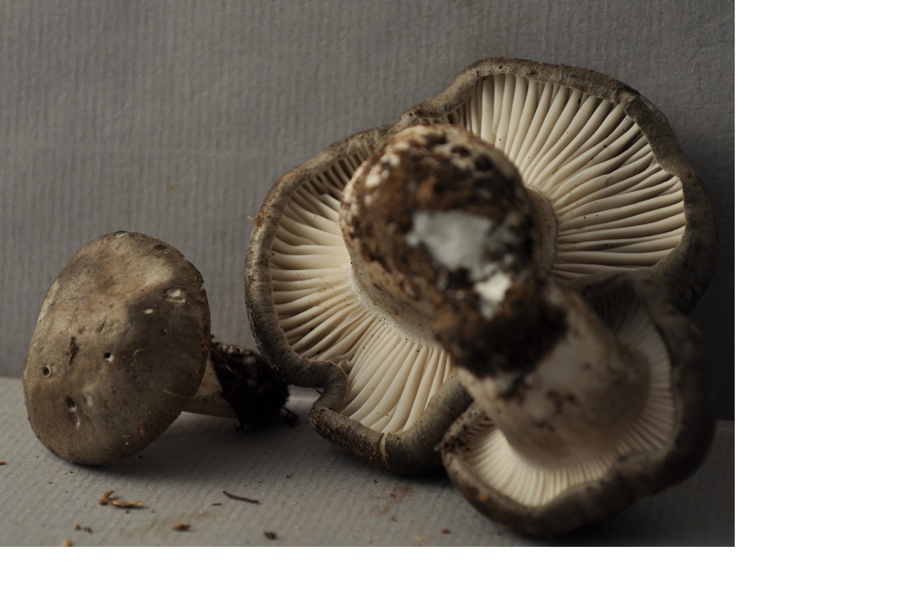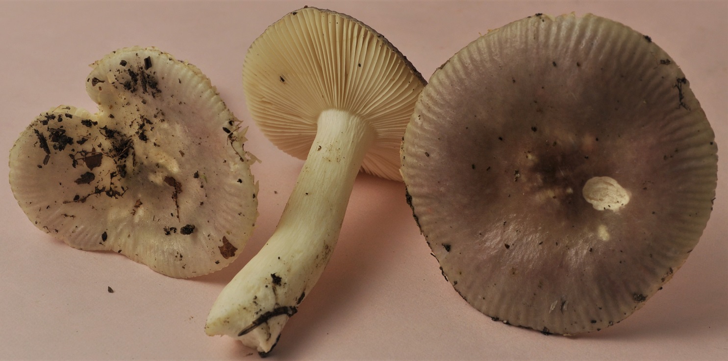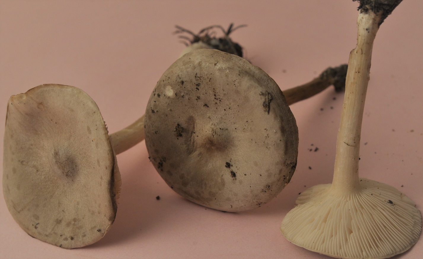 photo, CD8-F4 3/4. Chapeau gris sombre, vers les bruns au centre en séchant, mamelonné, fortement pruineux sur l'extérieur. Stipe glabre, luisant, pruineux en haut et en bas. Lames grises, non entières, libres, l/t 4.5/5. Chair blanche, contrastant avec la couleur du stipe (en particulier sous le mamelon), très mince hors mamelon; Odeur certaine (farine rance ?). Sporée blanche.