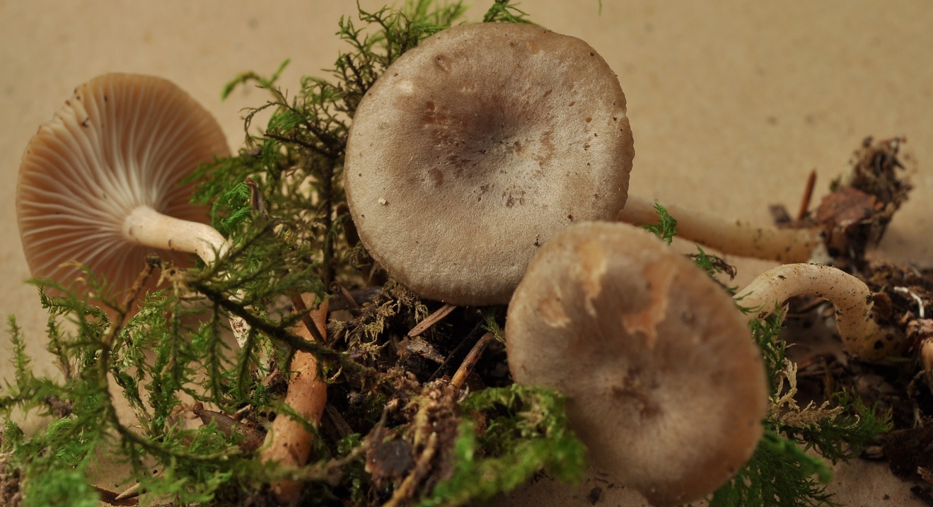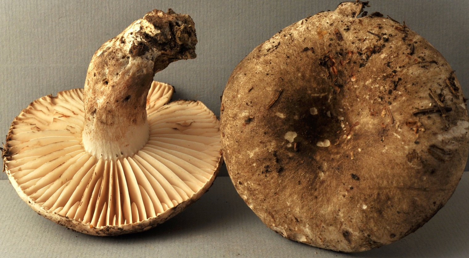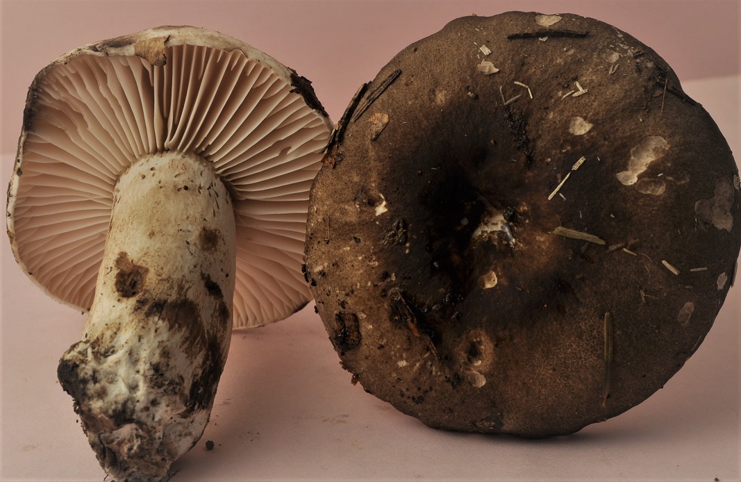 photo, CD8-F4 3/4. Chapeau gris sombre, vers les bruns au centre en séchant, mamelonné, fortement pruineux sur l'extérieur. Stipe glabre, luisant, pruineux en haut et en bas. Lames grises, non entières, libres, l/t 4.5/5. Chair blanche, contrastant avec la couleur du stipe (en particulier sous le mamelon), très mince hors mamelon; Odeur certaine (farine rance ?). Sporée blanche.