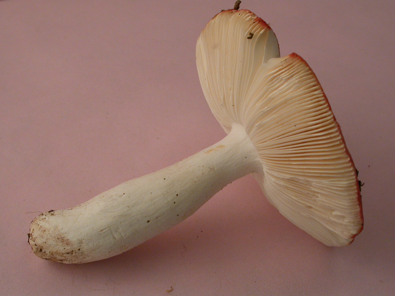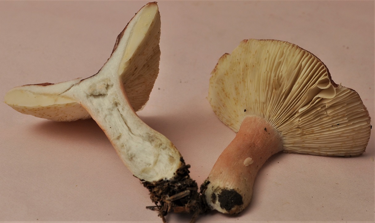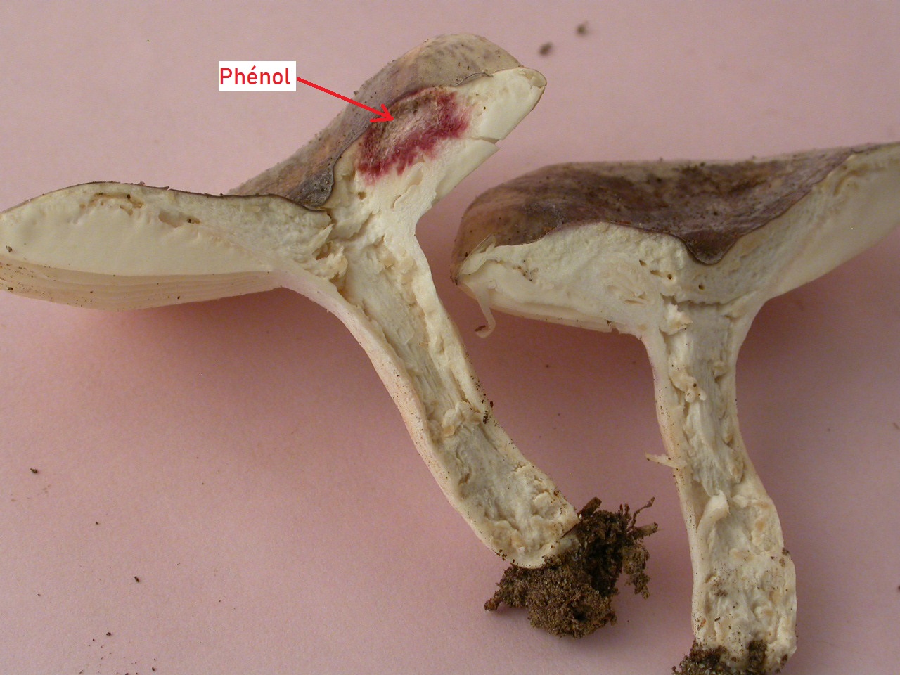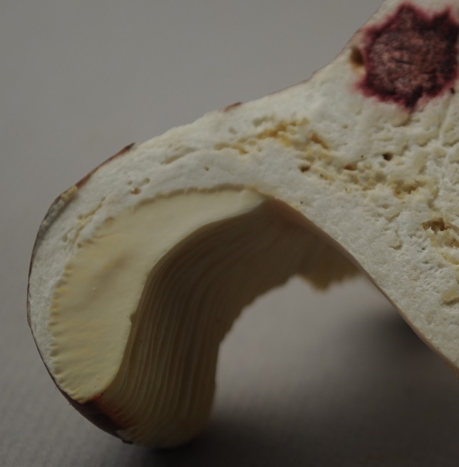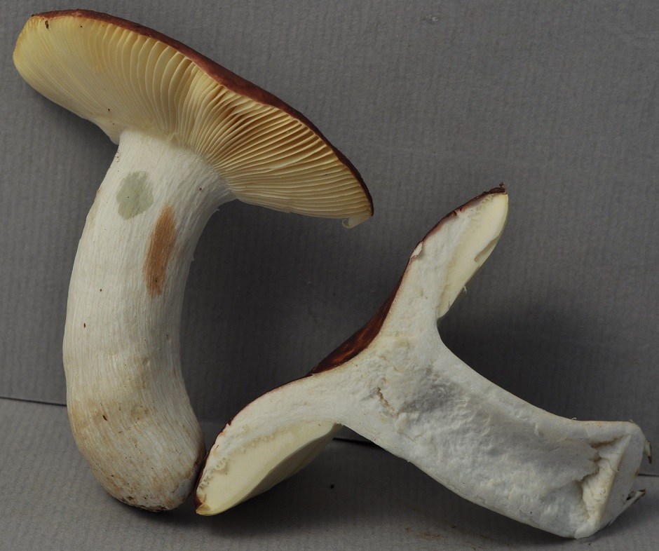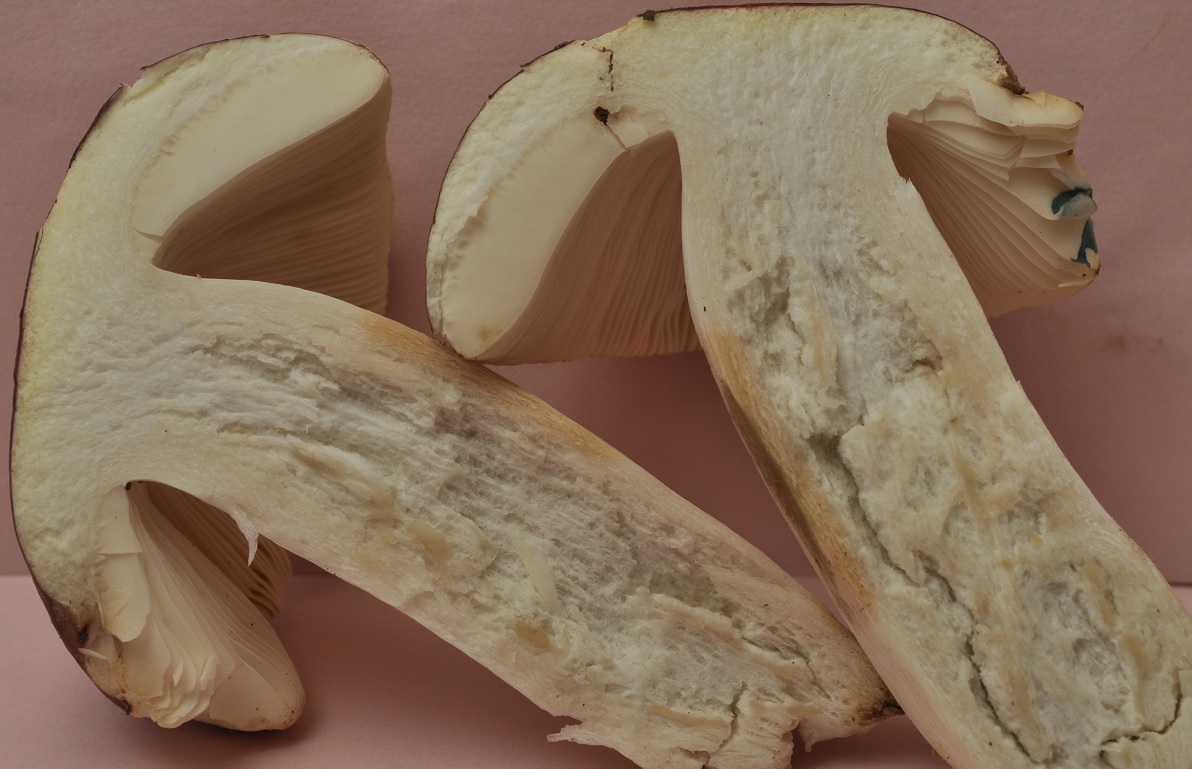 A voir dans la coupe les lames adnées ou émarginées, ligne de Trindel 2, arête rougeâtre à la marge, chair se colorant de brunâtre. Standard R.suberythropus..